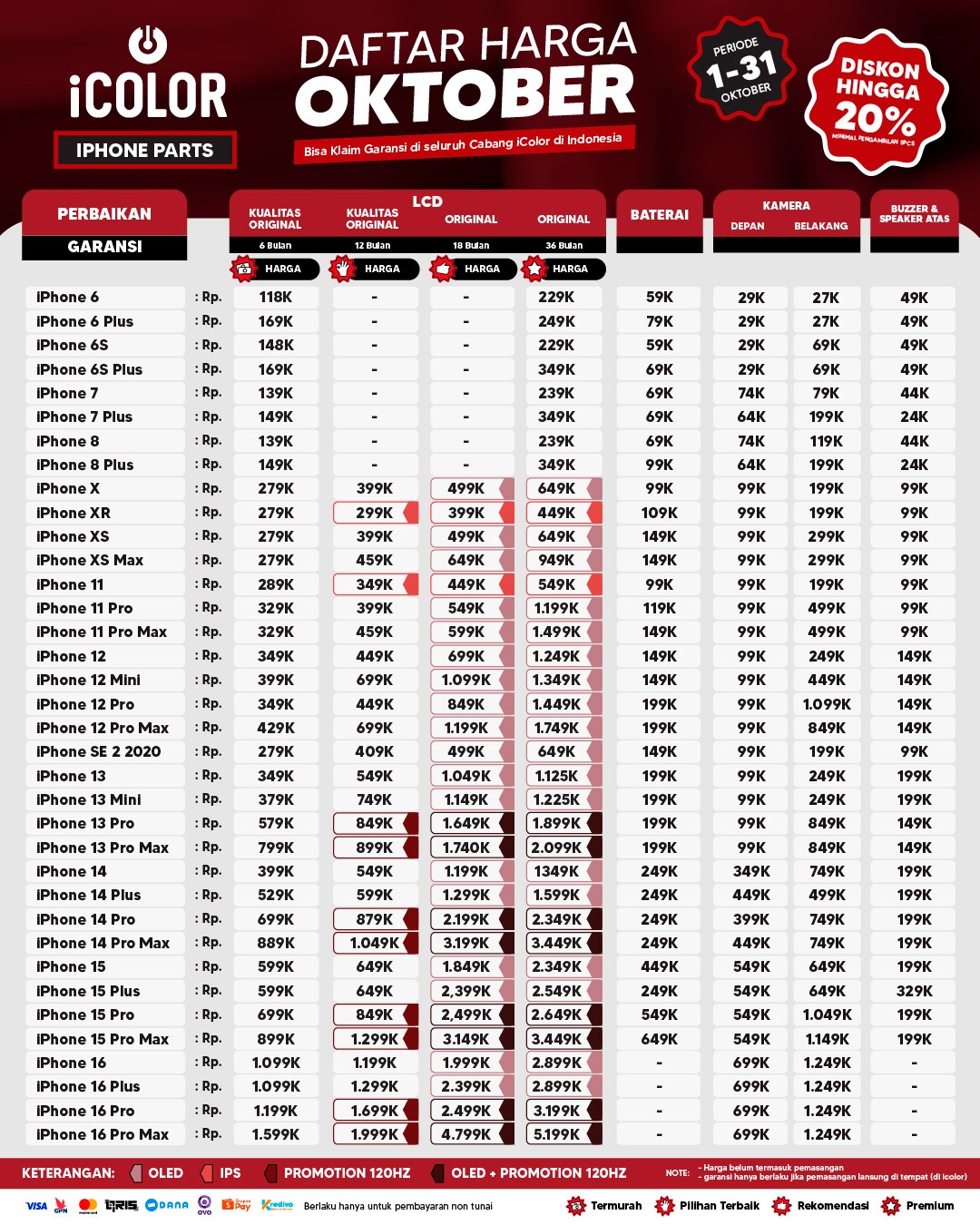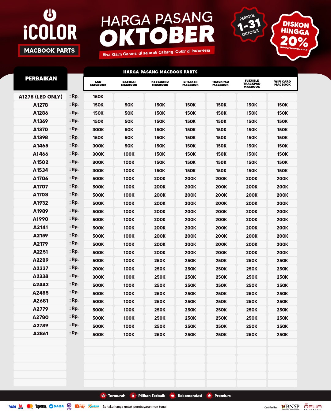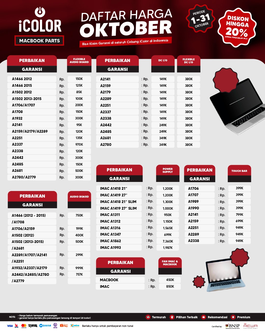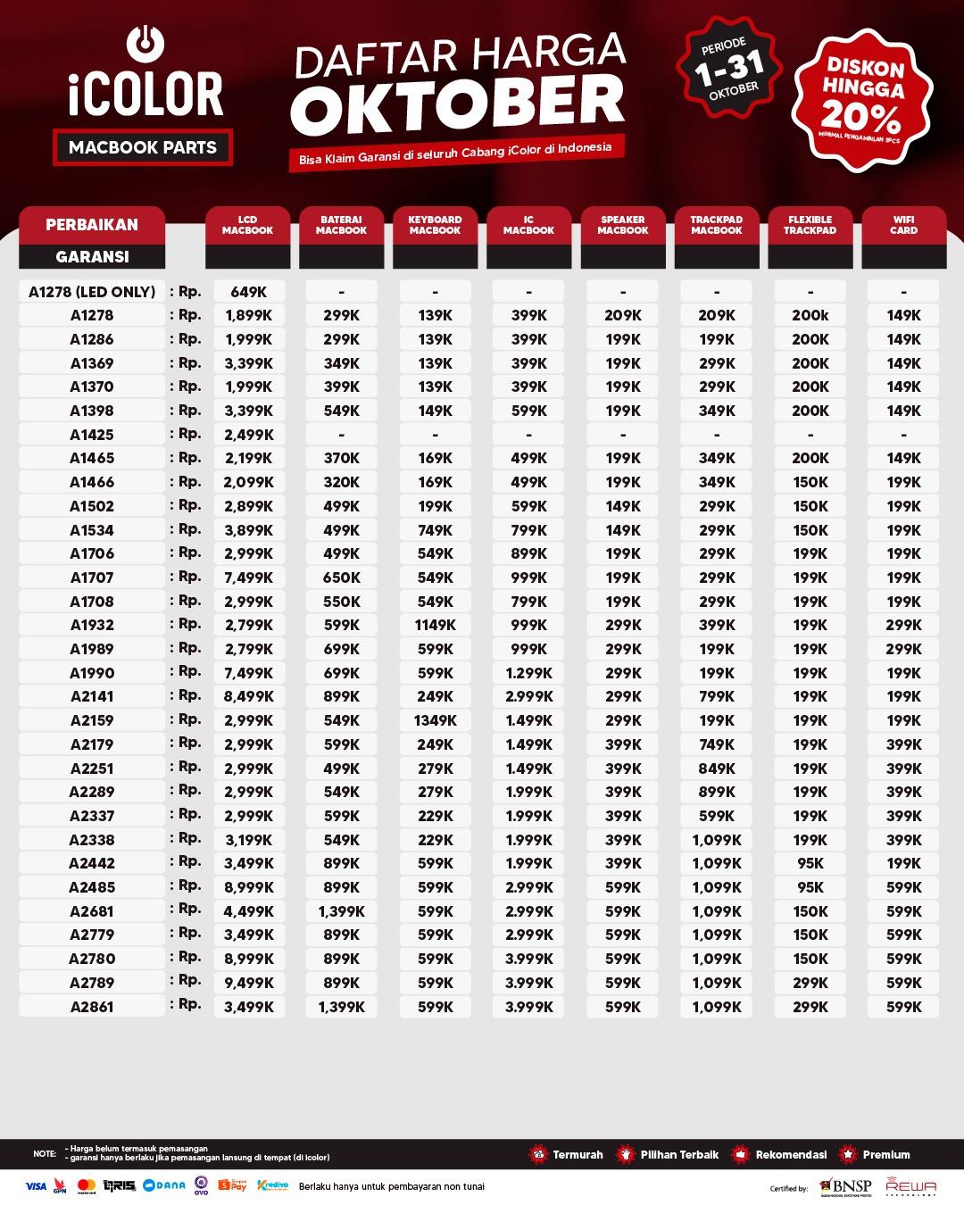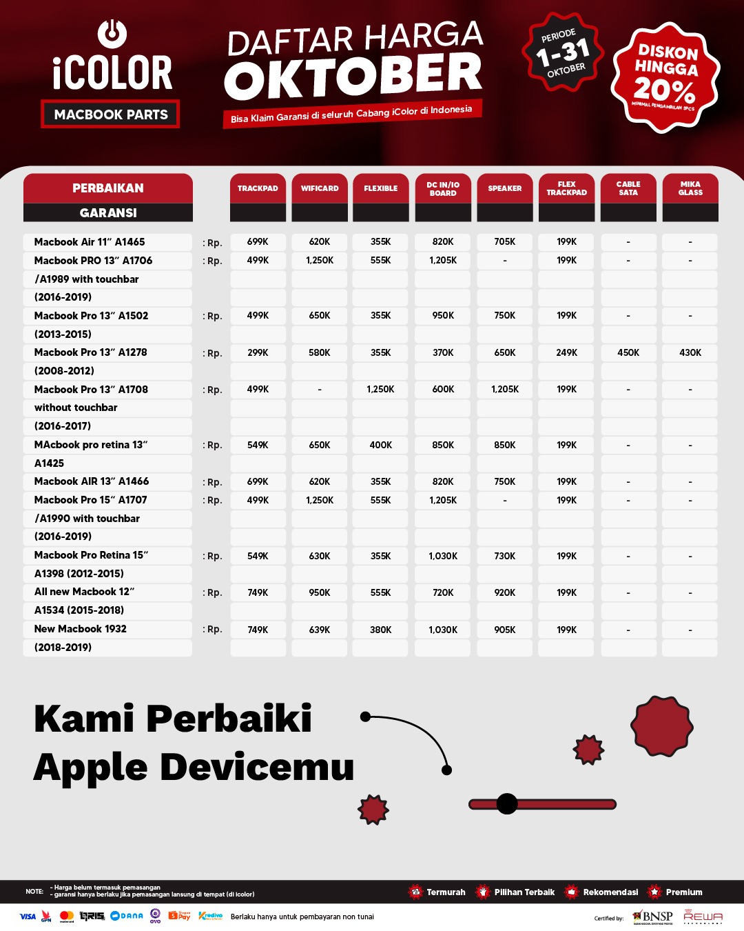 Kami menjanjikan harga yang ditawarkan dapat bersaing dan tetap mengutamakan kualitas dari sparepart yang kami sediakan, iColor memberikan harga service yang murah dan terjangkau untuk mencakup seluruh kalangan pengguna apple devices.