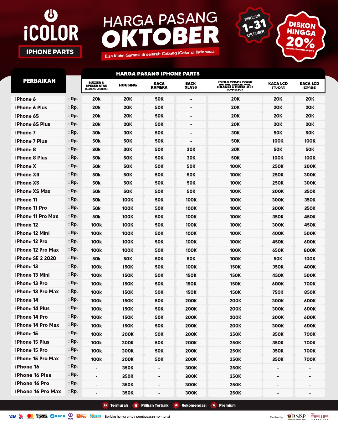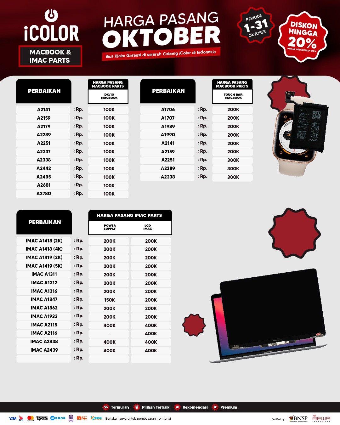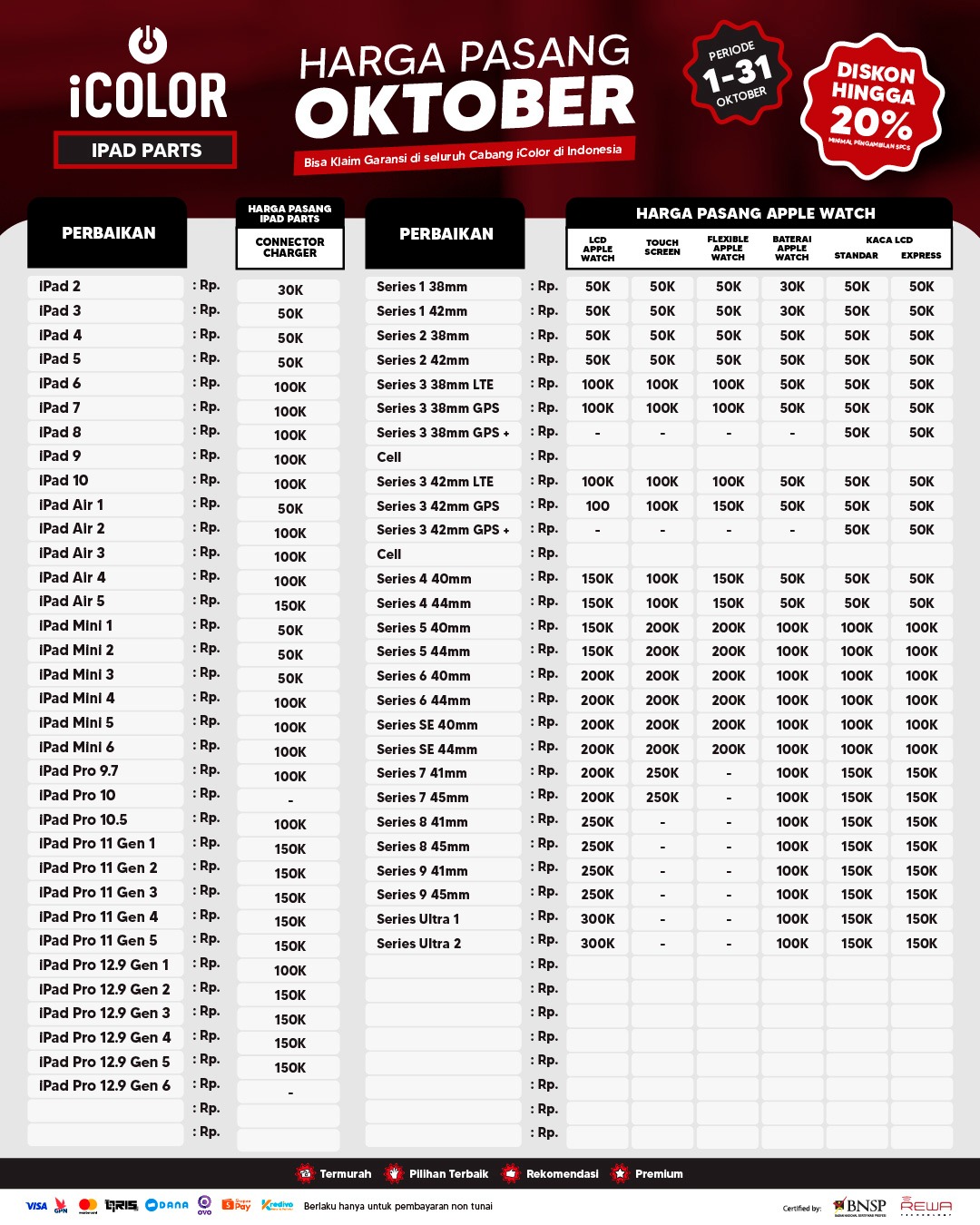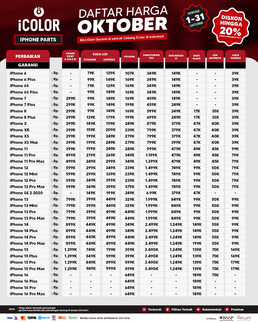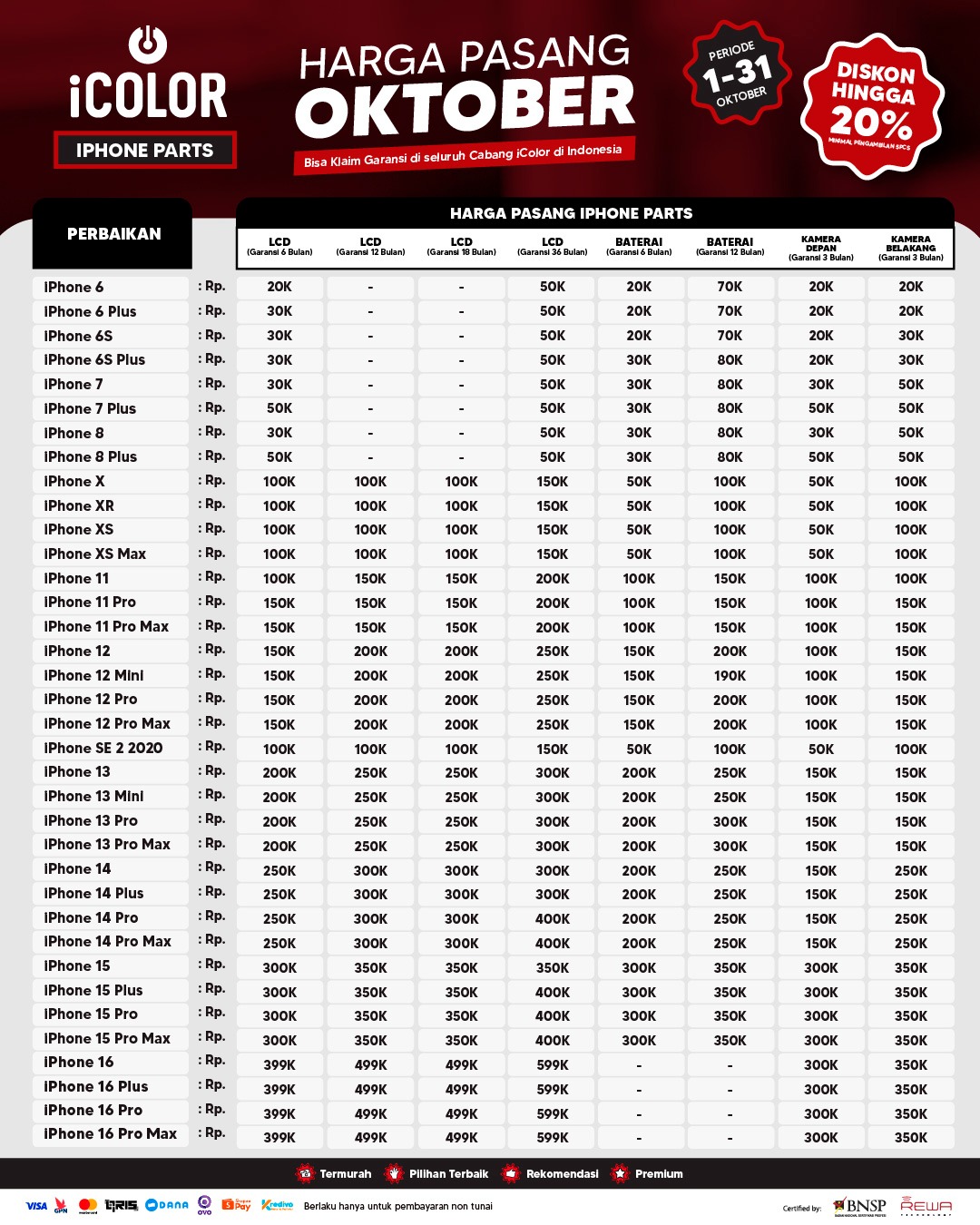Kami menjanjikan harga yang ditawarkan dapat bersaing dan tetap mengutamakan kualitas dari sparepart yang kami sediakan, iColor memberikan harga service yang murah dan terjangkau untuk mencakup seluruh kalangan pengguna apple devices.