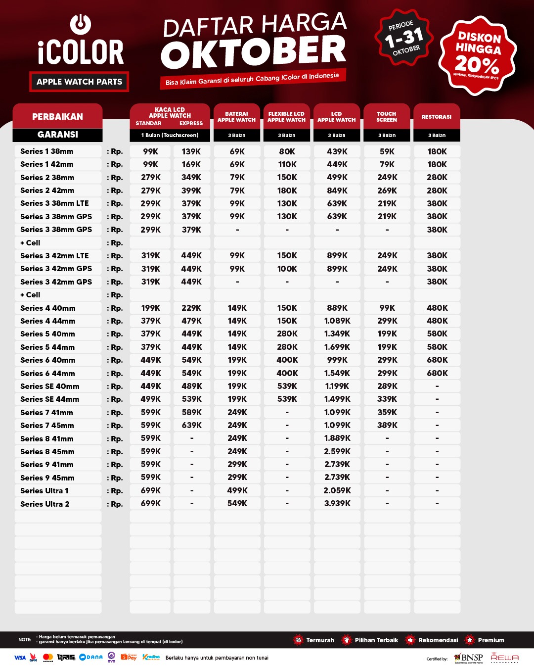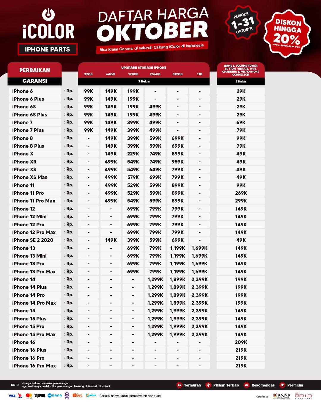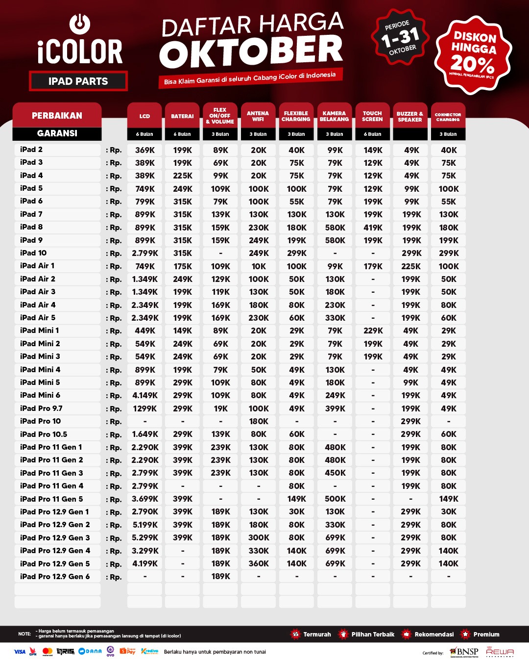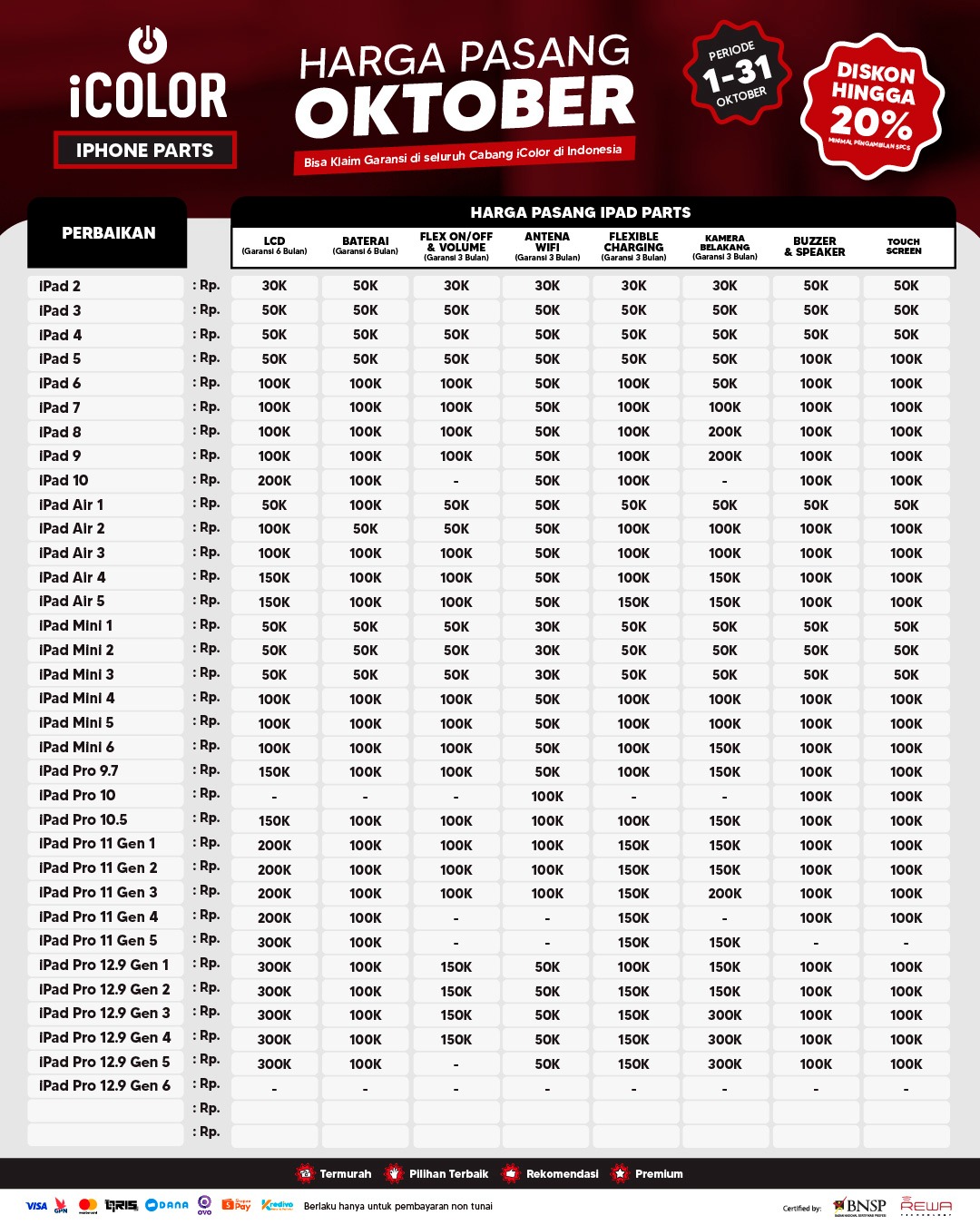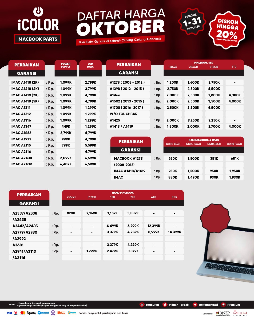 Kami menjanjikan harga yang ditawarkan dapat bersaing dan tetap mengutamakan kualitas dari sparepart yang kami sediakan, iColor memberikan harga service yang murah dan terjangkau untuk mencakup seluruh kalangan pengguna apple devices.