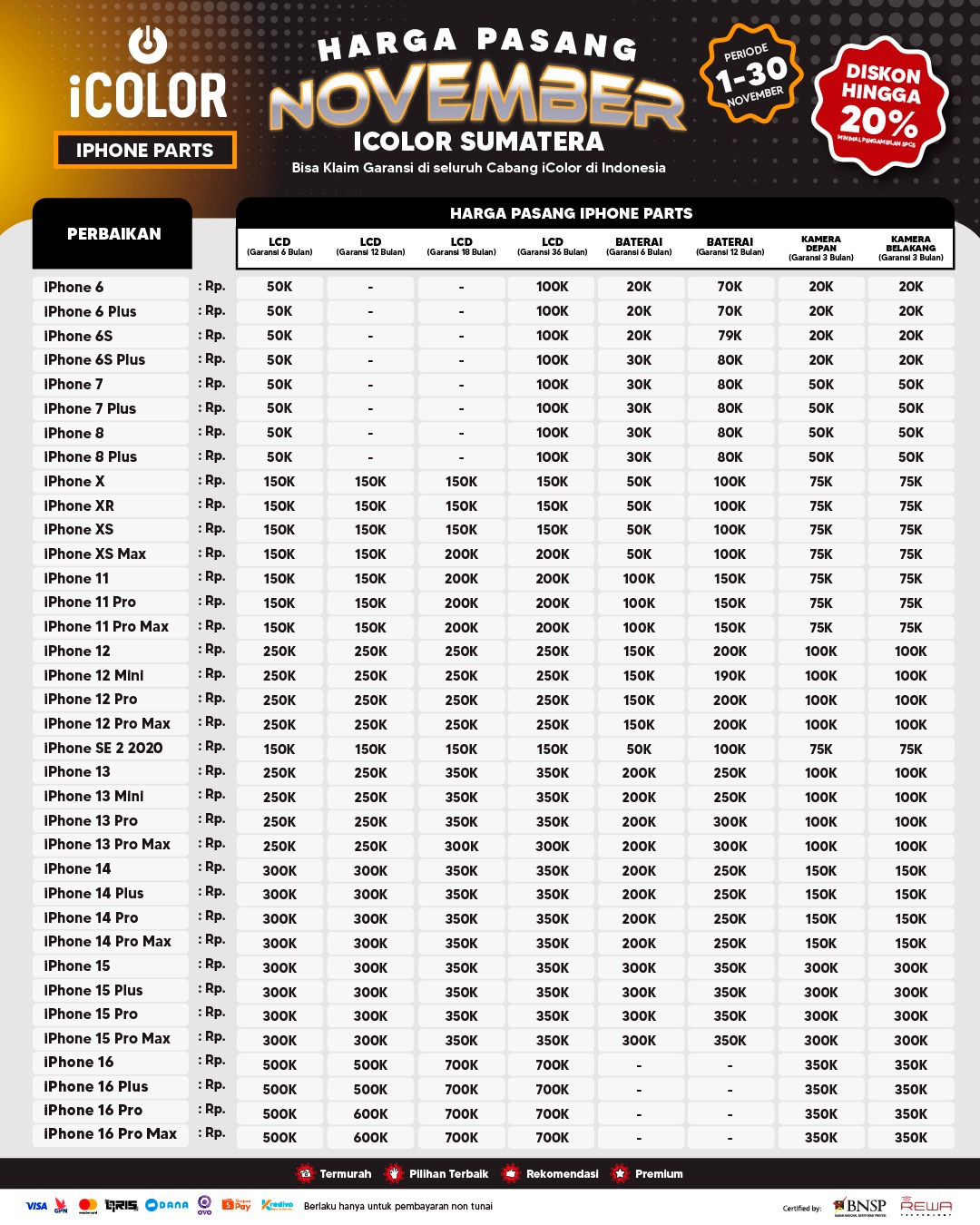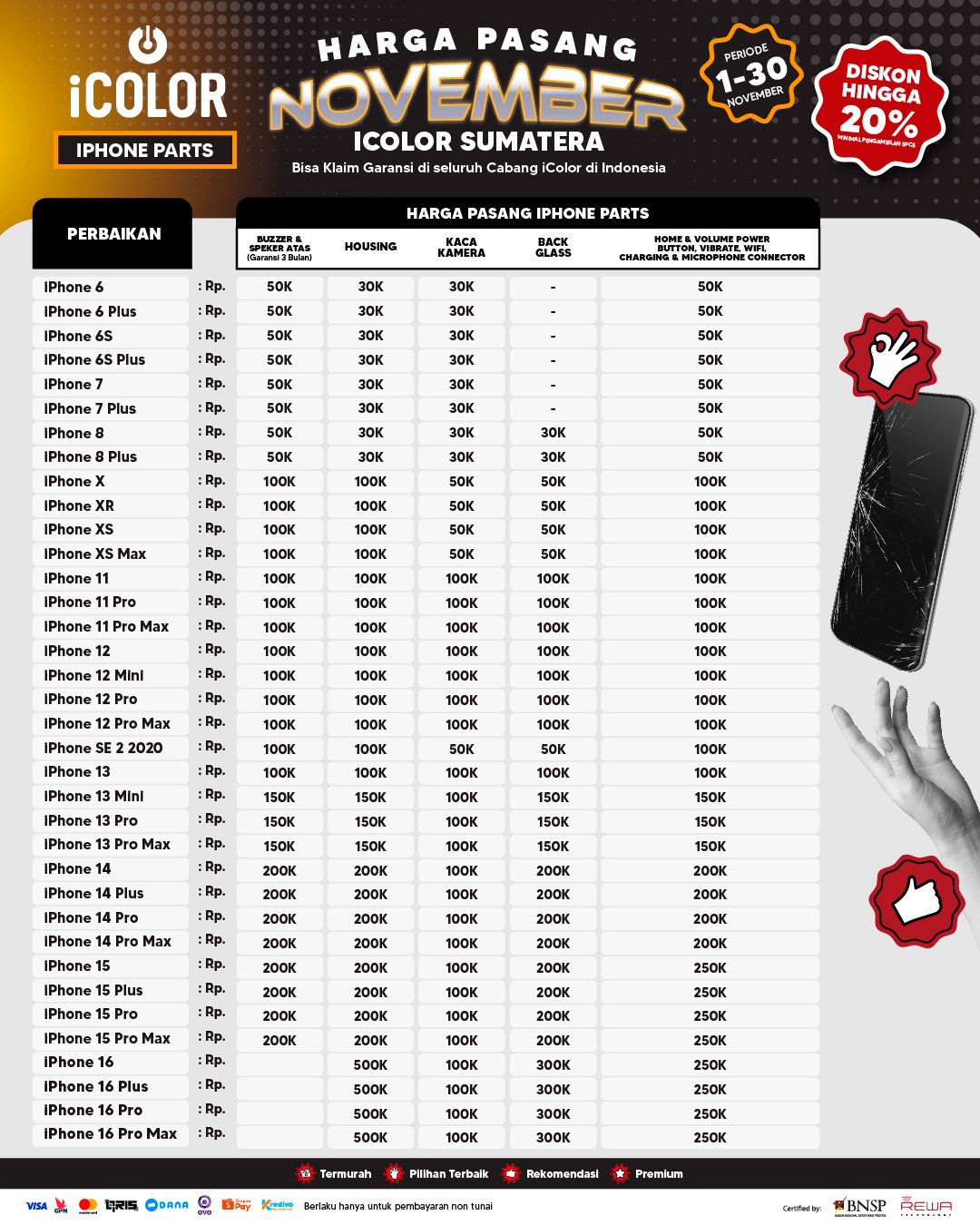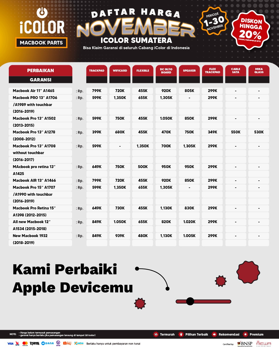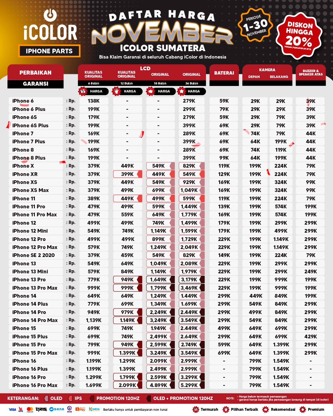 Kami menjanjikan harga yang ditawarkan dapat bersaing dan tetap mengutamakan kualitas dari sparepart yang kami sediakan, iColor memberikan harga service yang murah dan terjangkau untuk mencakup seluruh kalangan pengguna apple devices.