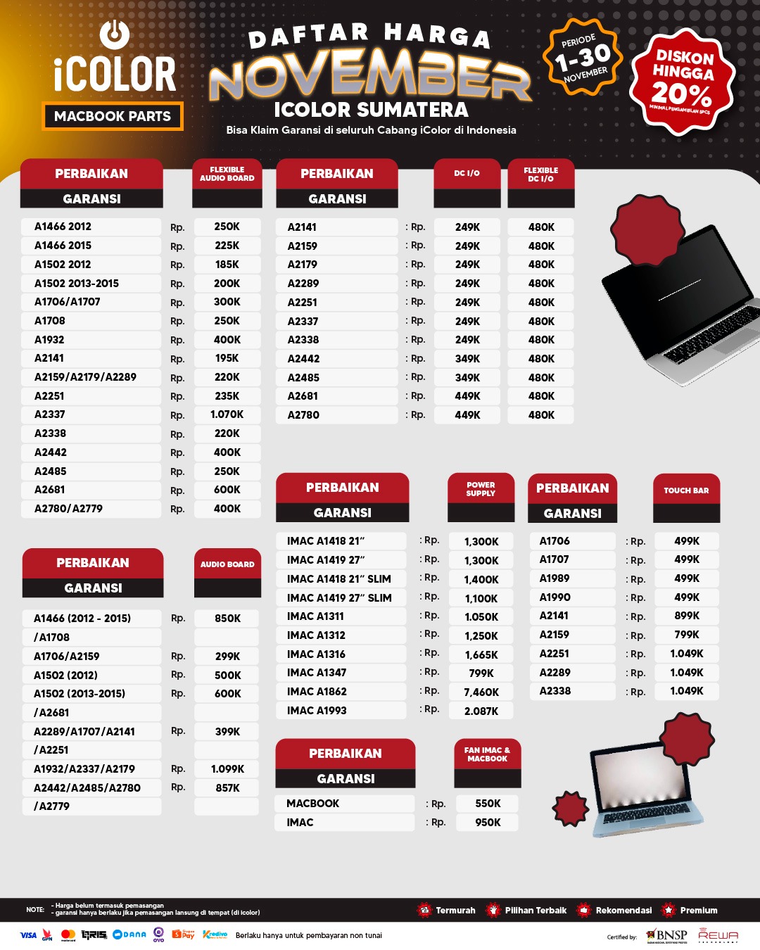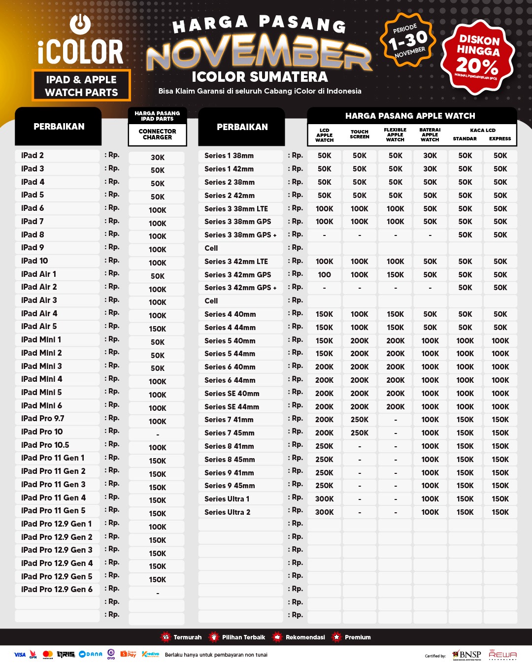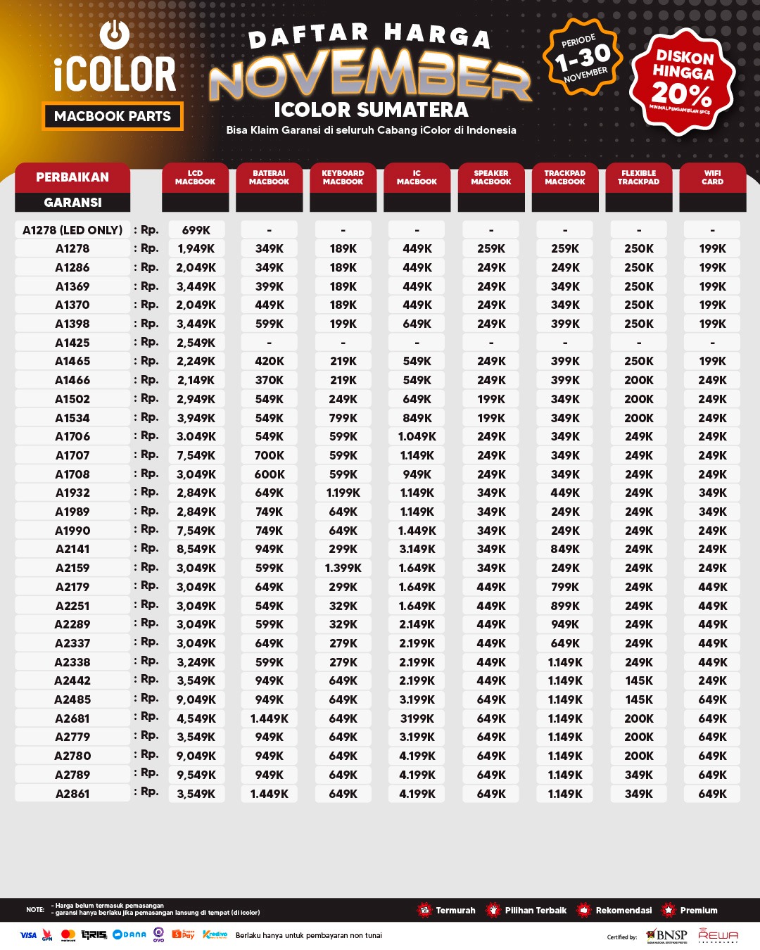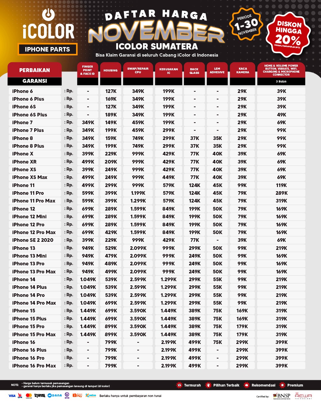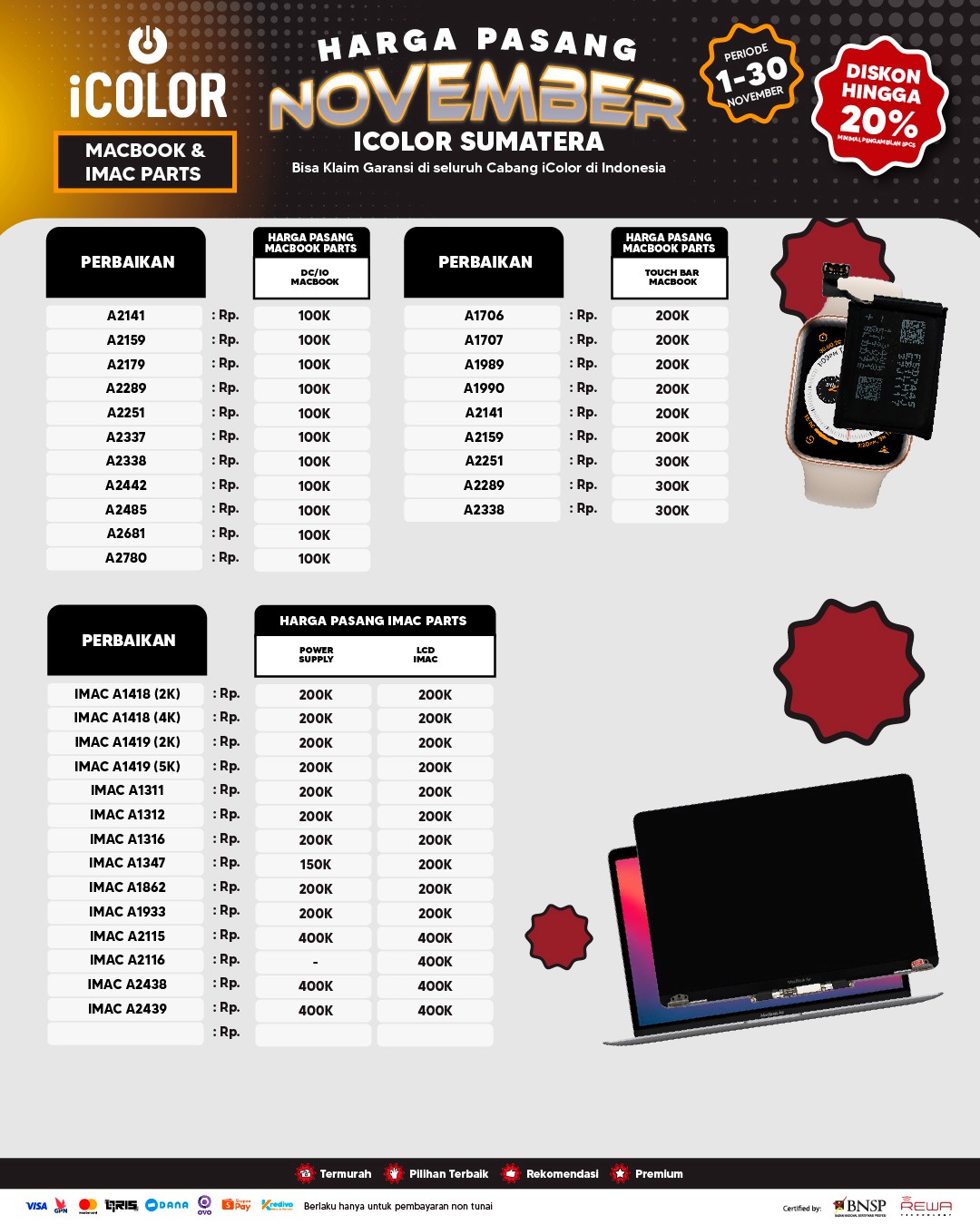 Kami menjanjikan harga yang ditawarkan dapat bersaing dan tetap mengutamakan kualitas dari sparepart yang kami sediakan, iColor memberikan harga service yang murah dan terjangkau untuk mencakup seluruh kalangan pengguna apple devices.