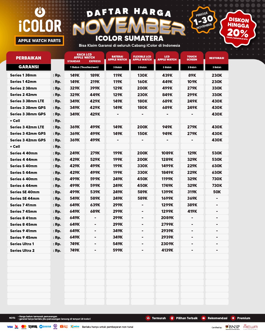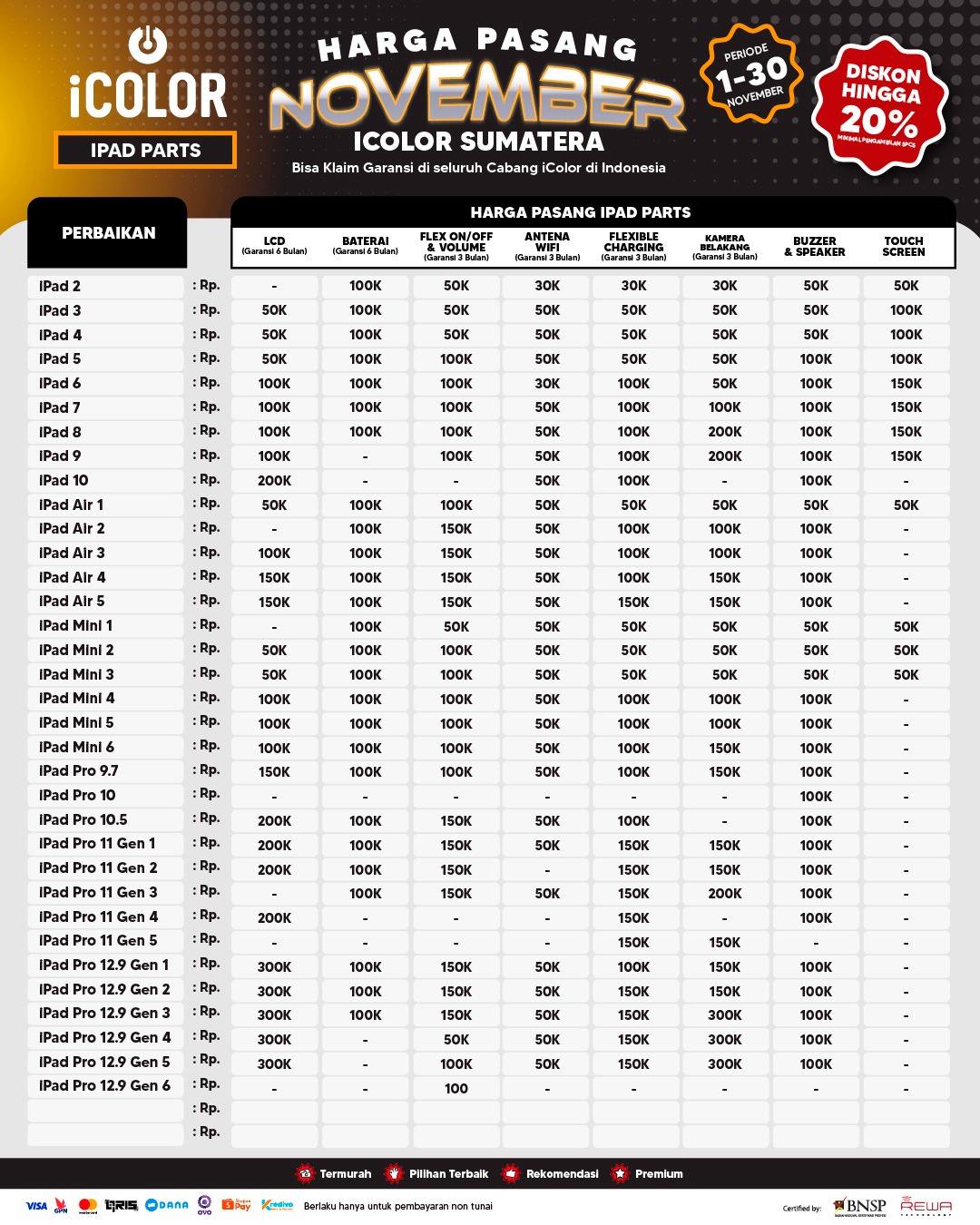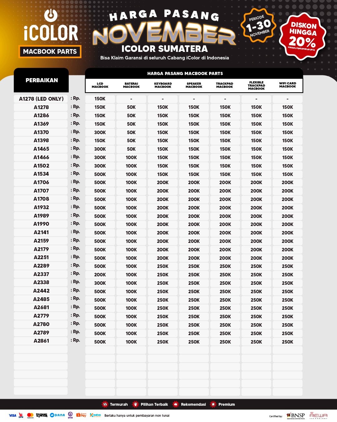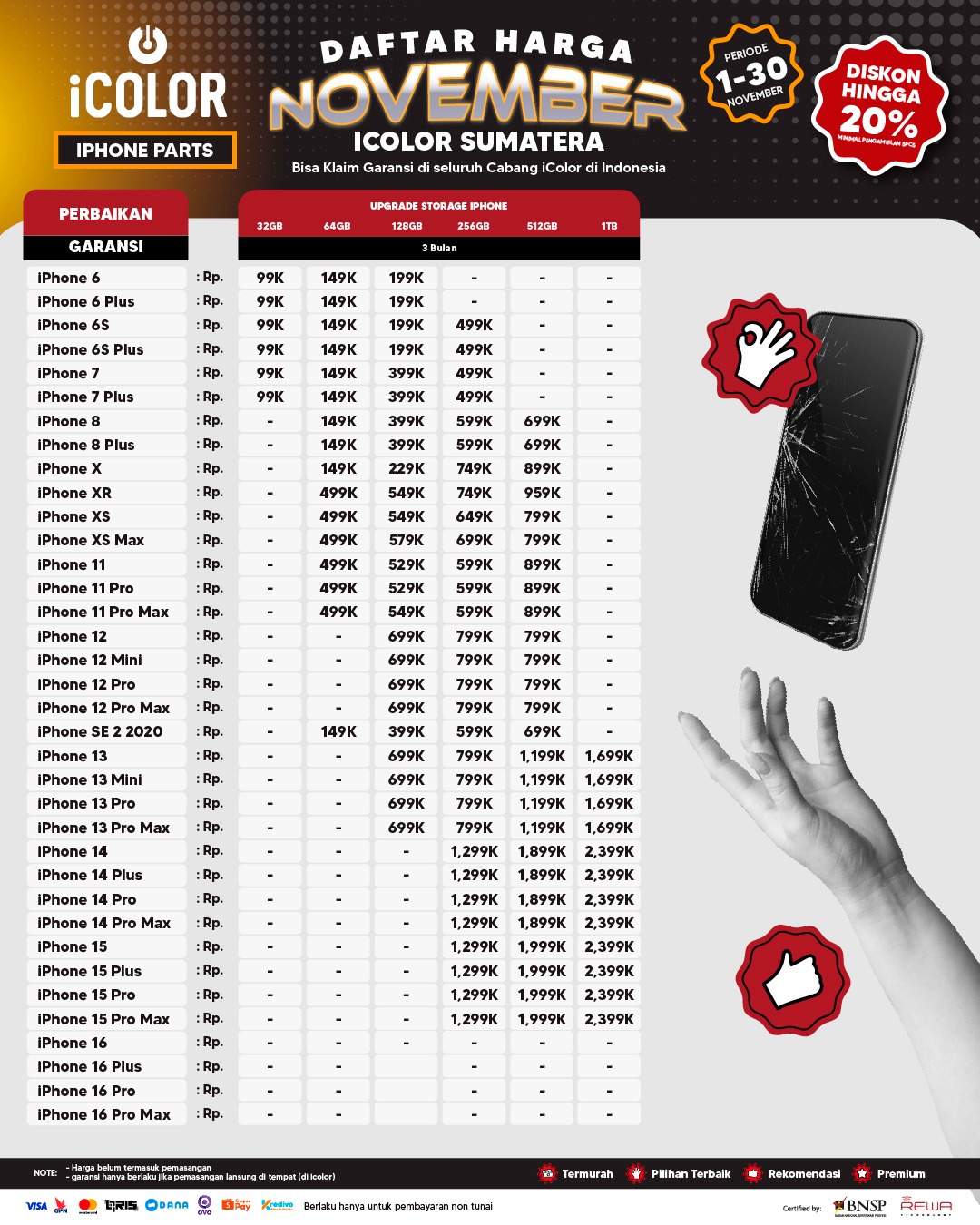 Kami menjanjikan harga yang ditawarkan dapat bersaing dan tetap mengutamakan kualitas dari sparepart yang kami sediakan, iColor memberikan harga service yang murah dan terjangkau untuk mencakup seluruh kalangan pengguna apple devices.