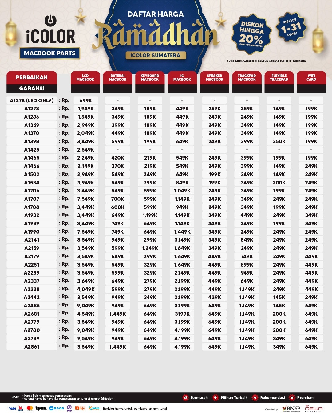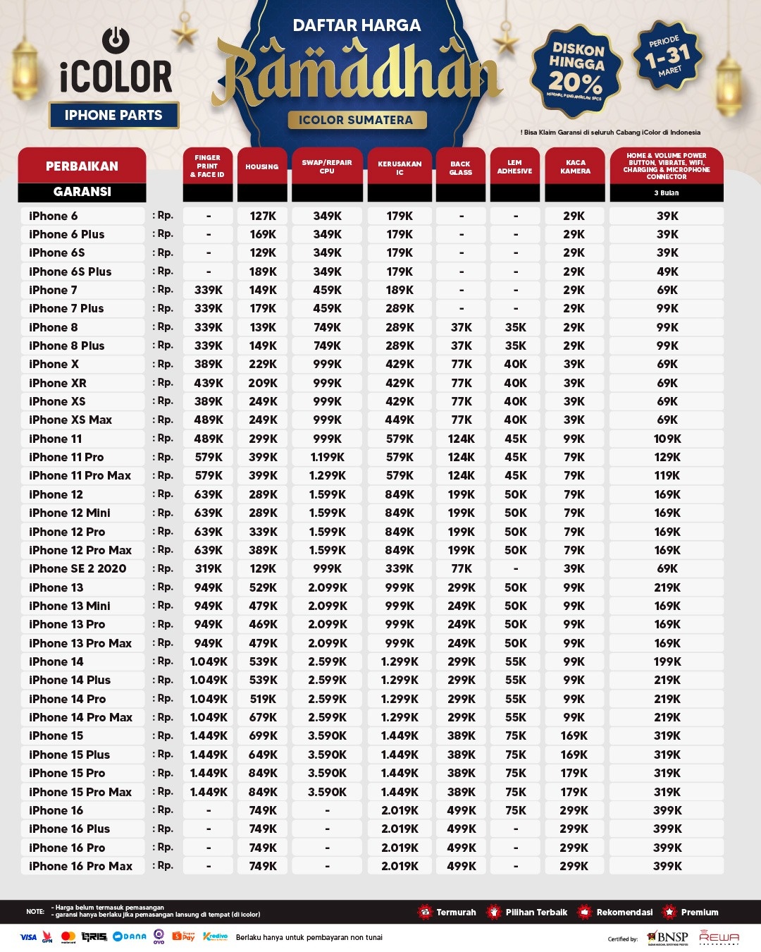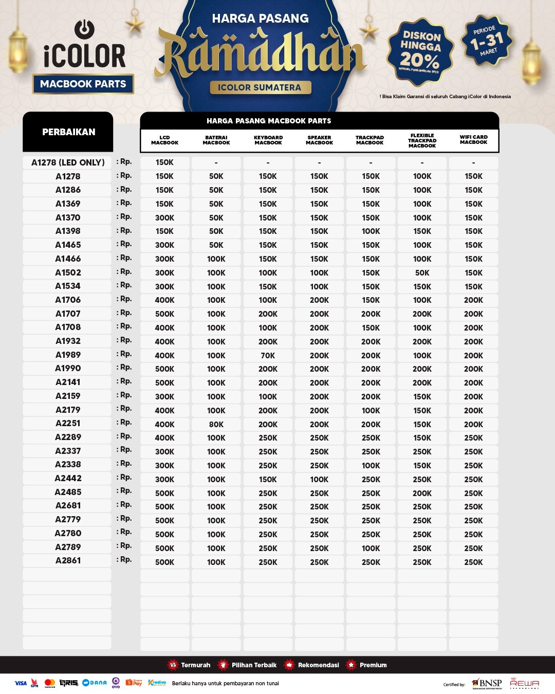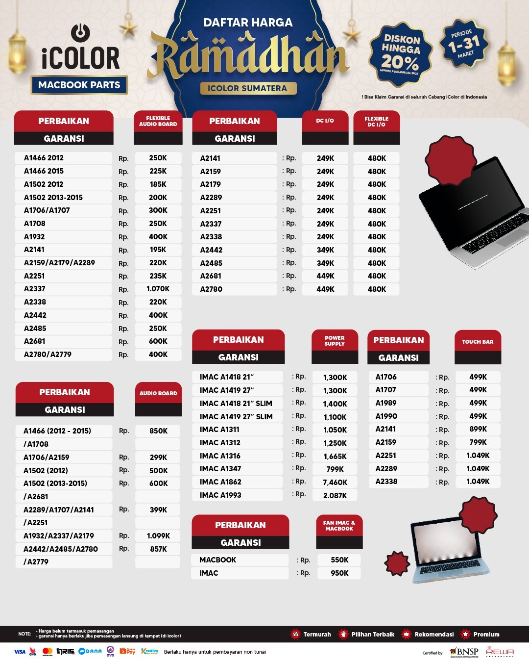 Kami menjanjikan harga yang ditawarkan dapat bersaing dan tetap mengutamakan kualitas dari sparepart yang kami sediakan, iColor memberikan harga service yang murah dan terjangkau untuk mencakup seluruh kalangan pengguna apple devices.