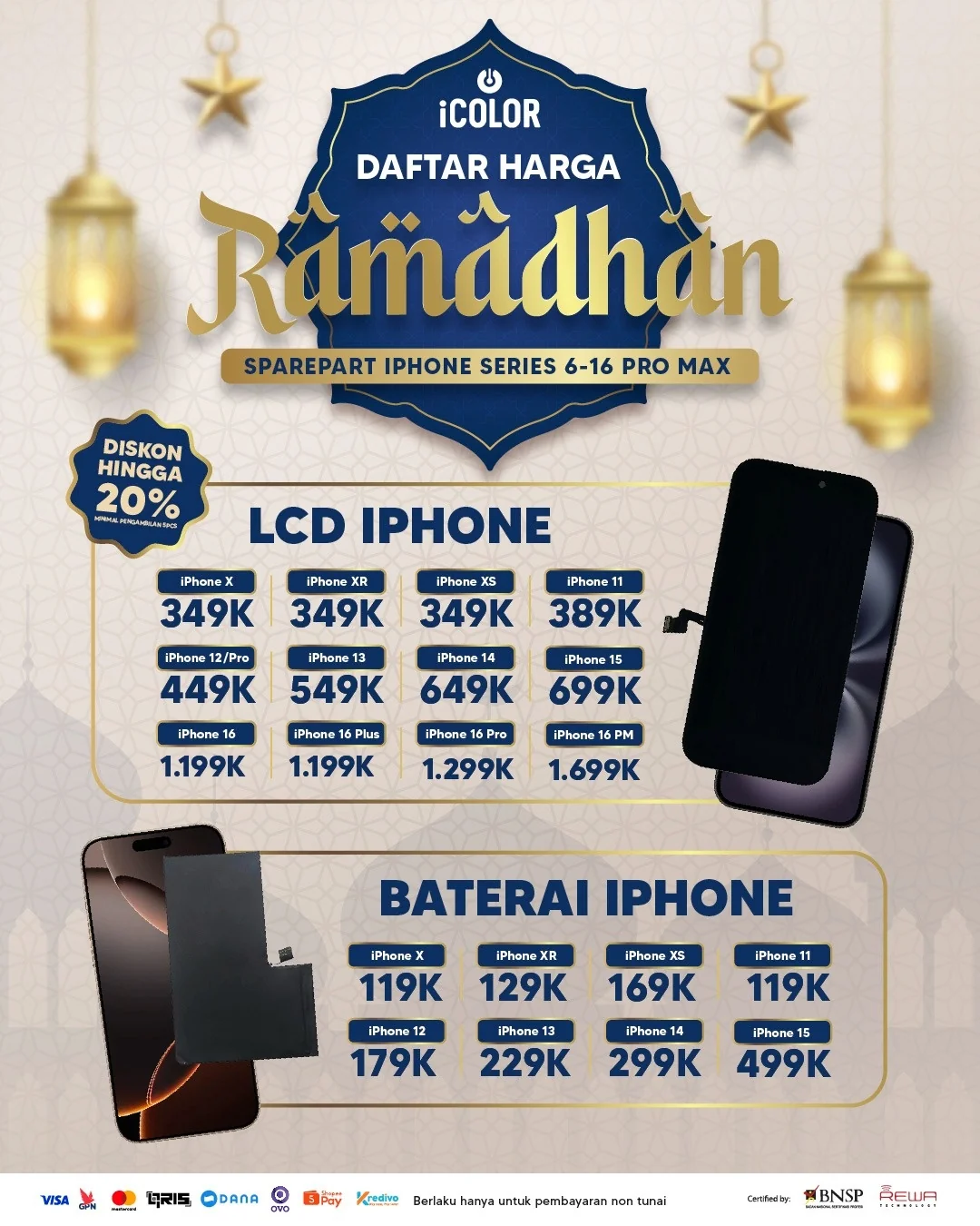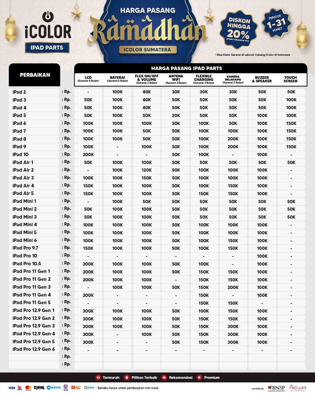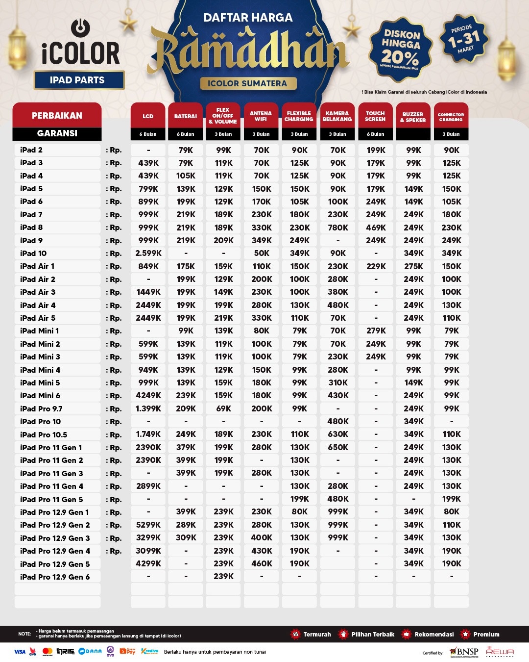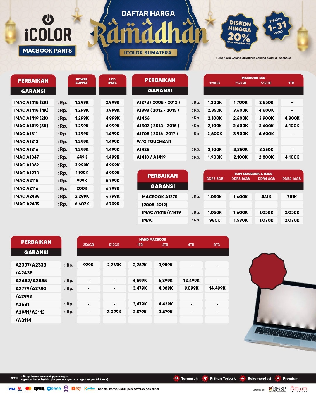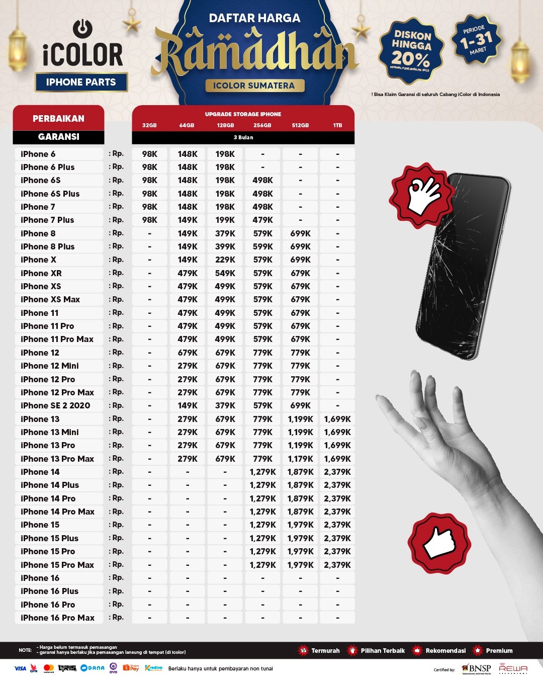 Kami menjanjikan harga yang ditawarkan dapat bersaing dan tetap mengutamakan kualitas dari sparepart yang kami sediakan, iColor memberikan harga service yang murah dan terjangkau untuk mencakup seluruh kalangan pengguna apple devices.