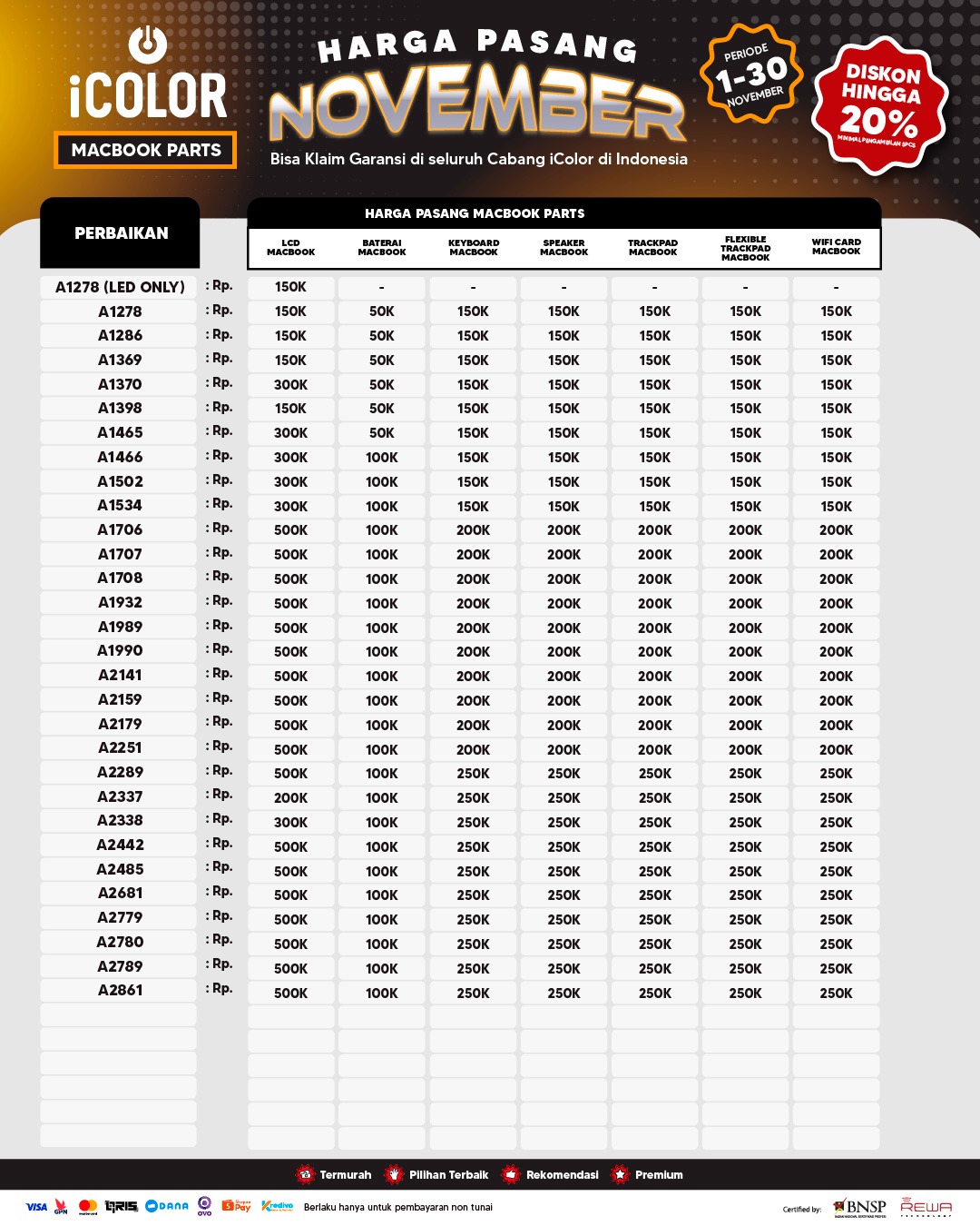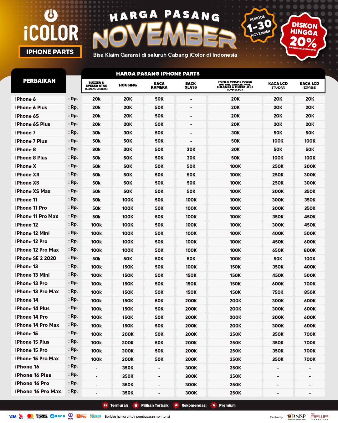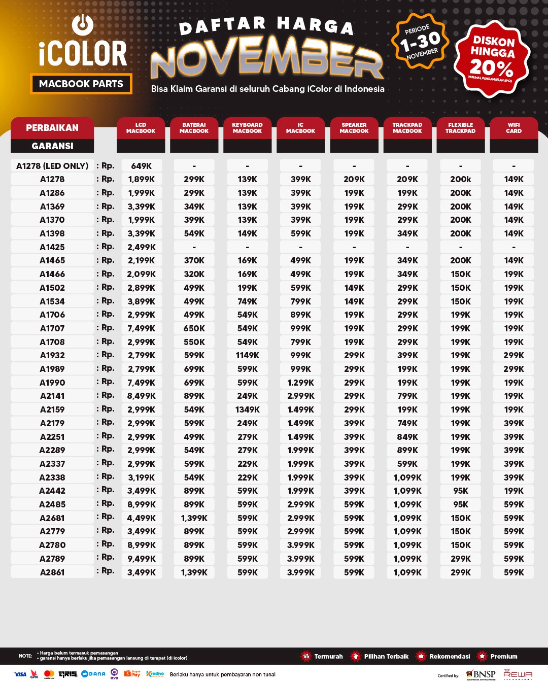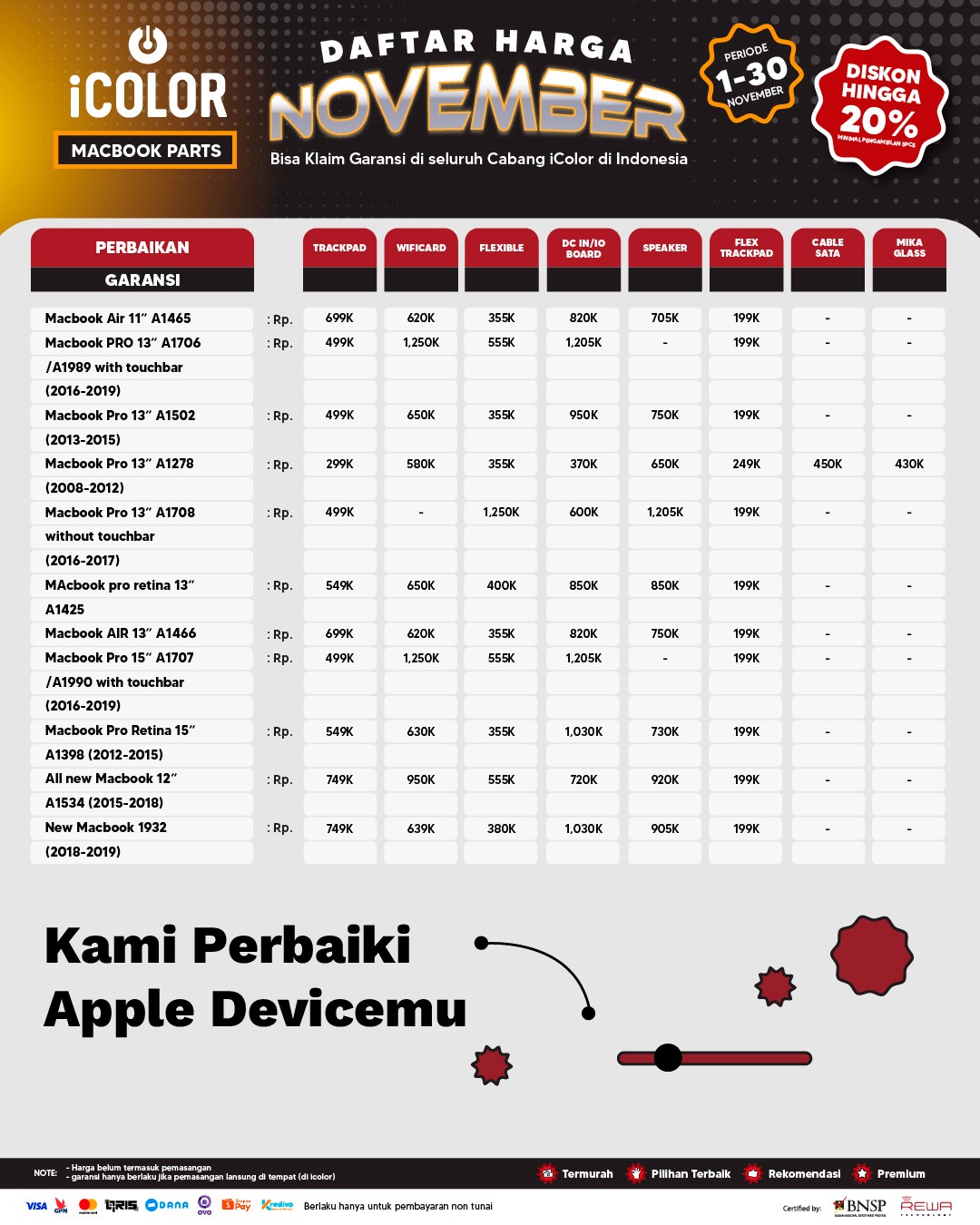 Kami menjanjikan harga yang ditawarkan dapat bersaing dan tetap mengutamakan kualitas dari sparepart yang kami sediakan, iColor memberikan harga service yang murah dan terjangkau untuk mencakup seluruh kalangan pengguna apple devices.