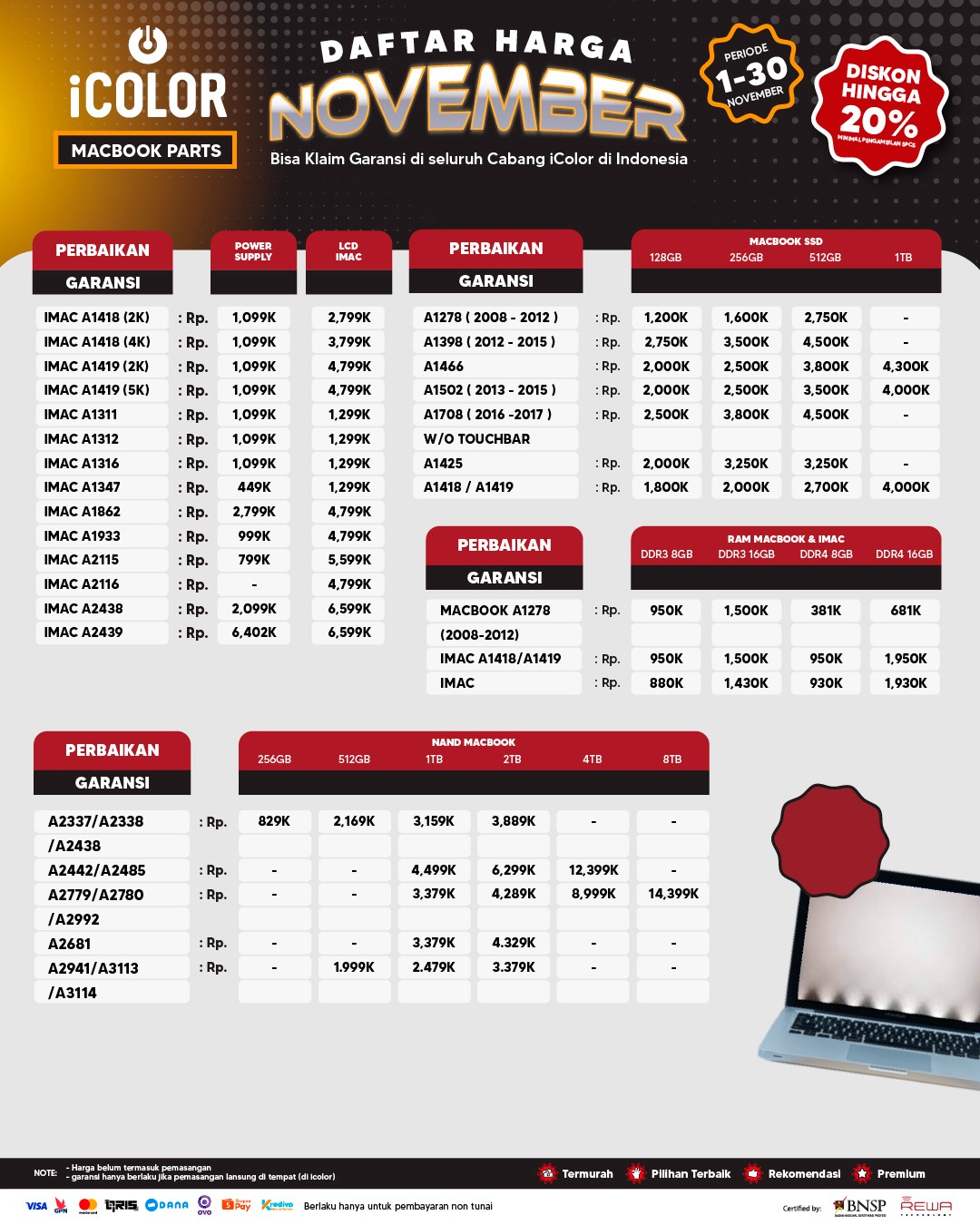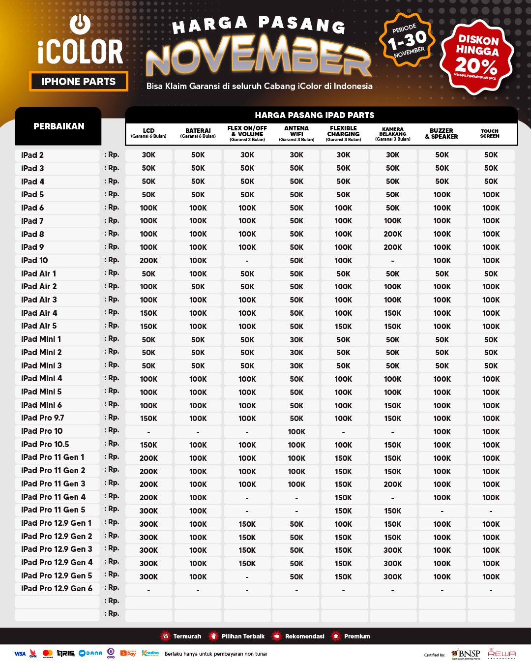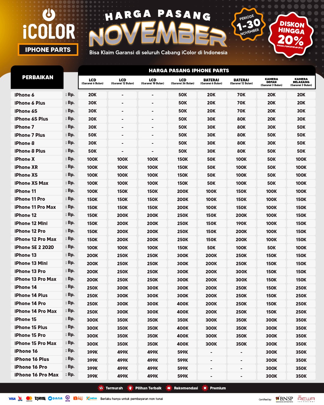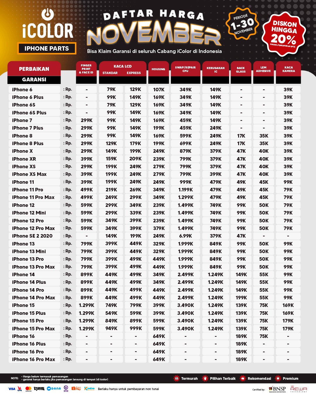 Kami menjanjikan harga yang ditawarkan dapat bersaing dan tetap mengutamakan kualitas dari sparepart yang kami sediakan, iColor memberikan harga service yang murah dan terjangkau untuk mencakup seluruh kalangan pengguna apple devices.