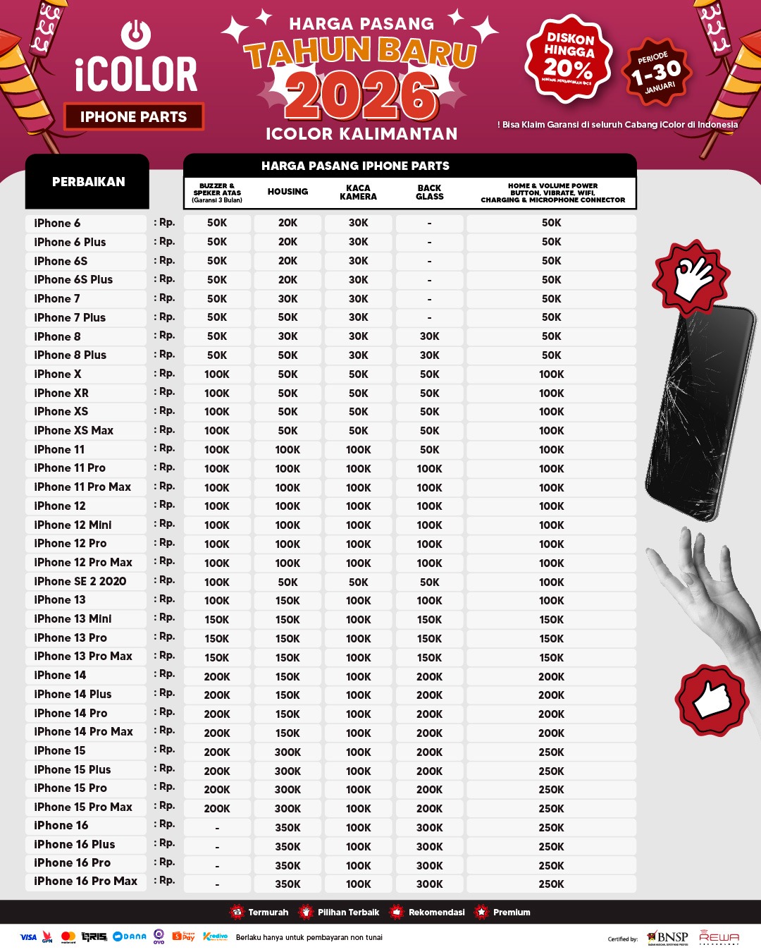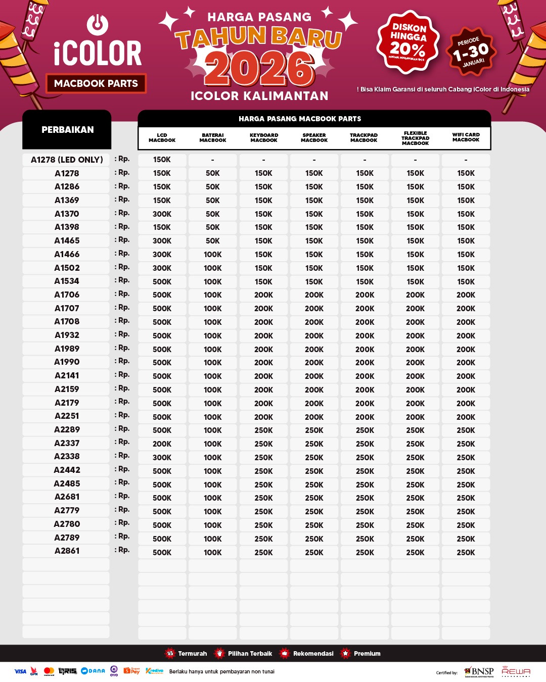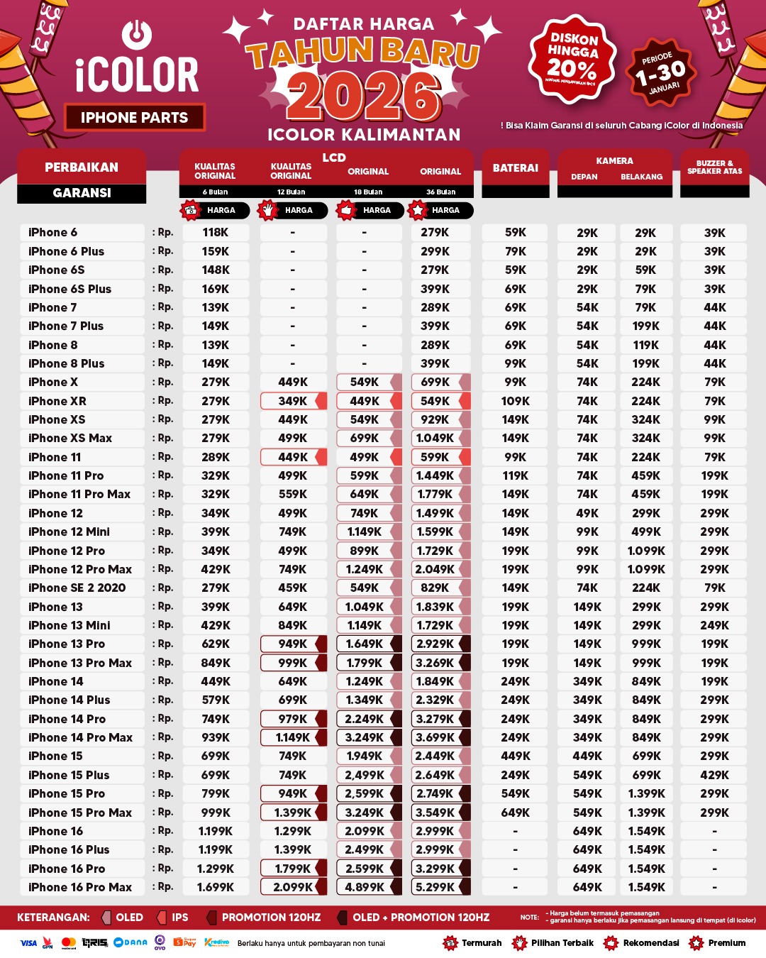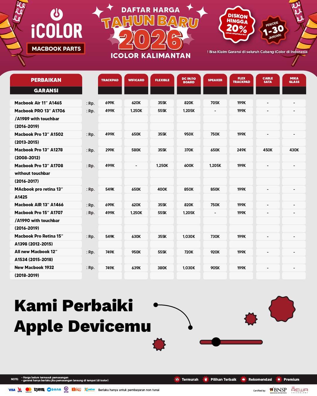 Kami menjanjikan harga yang ditawarkan dapat bersaing dan tetap mengutamakan kualitas dari sparepart yang kami sediakan, iColor memberikan harga service yang murah dan terjangkau untuk mencakup seluruh kalangan pengguna apple devices.