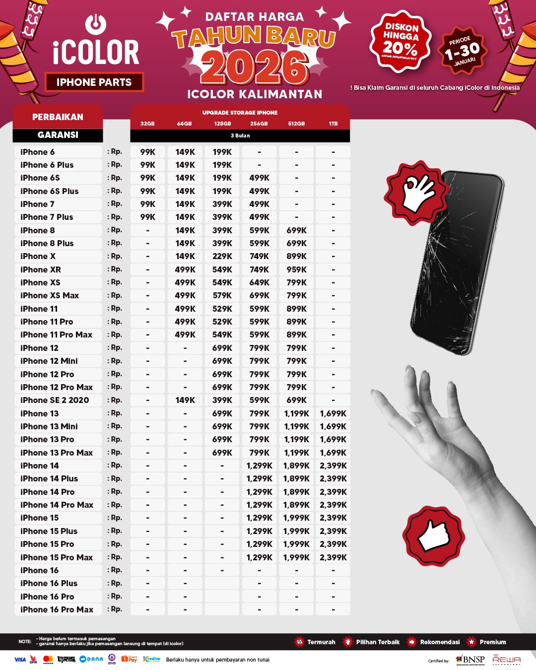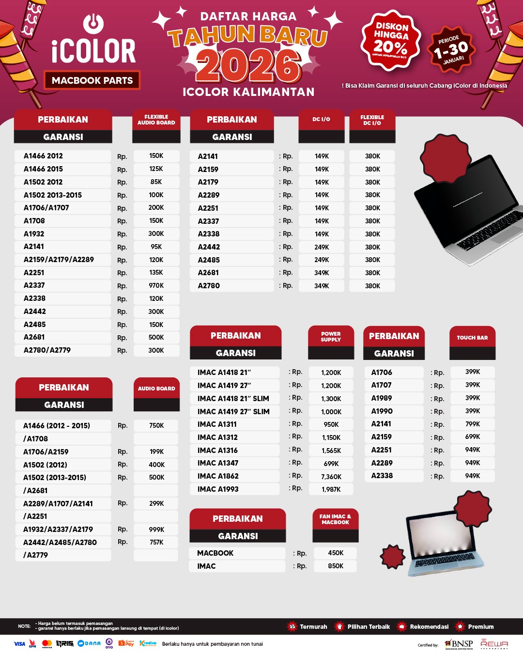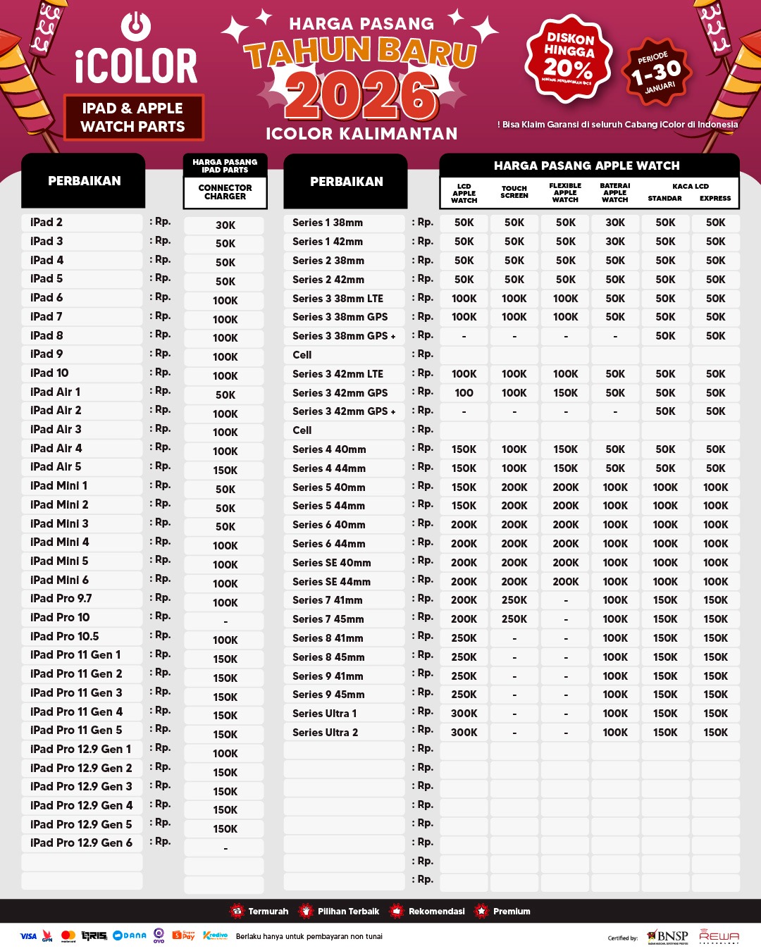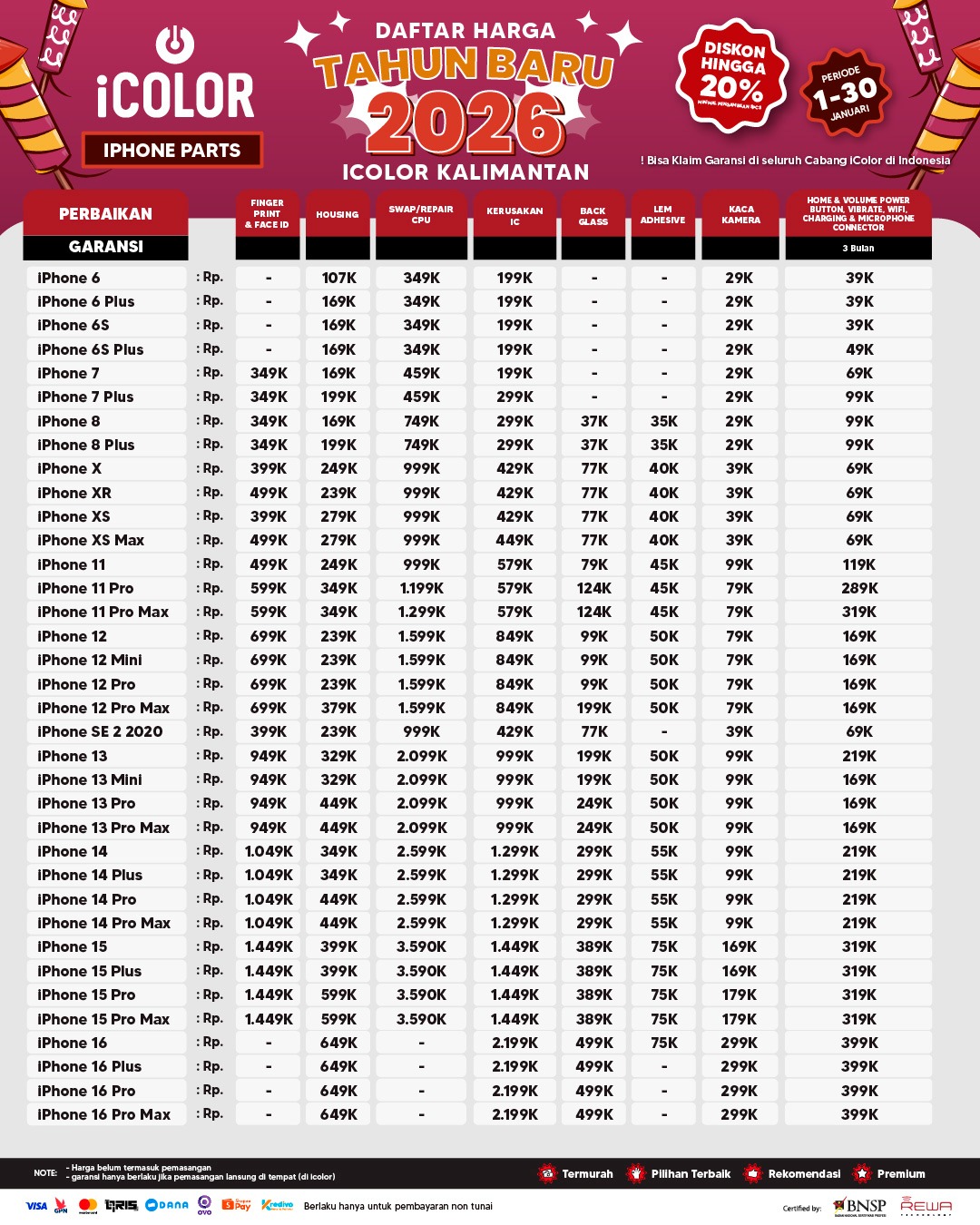 Kami menjanjikan harga yang ditawarkan dapat bersaing dan tetap mengutamakan kualitas dari sparepart yang kami sediakan, iColor memberikan harga service yang murah dan terjangkau untuk mencakup seluruh kalangan pengguna apple devices.