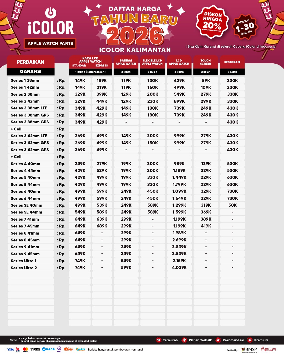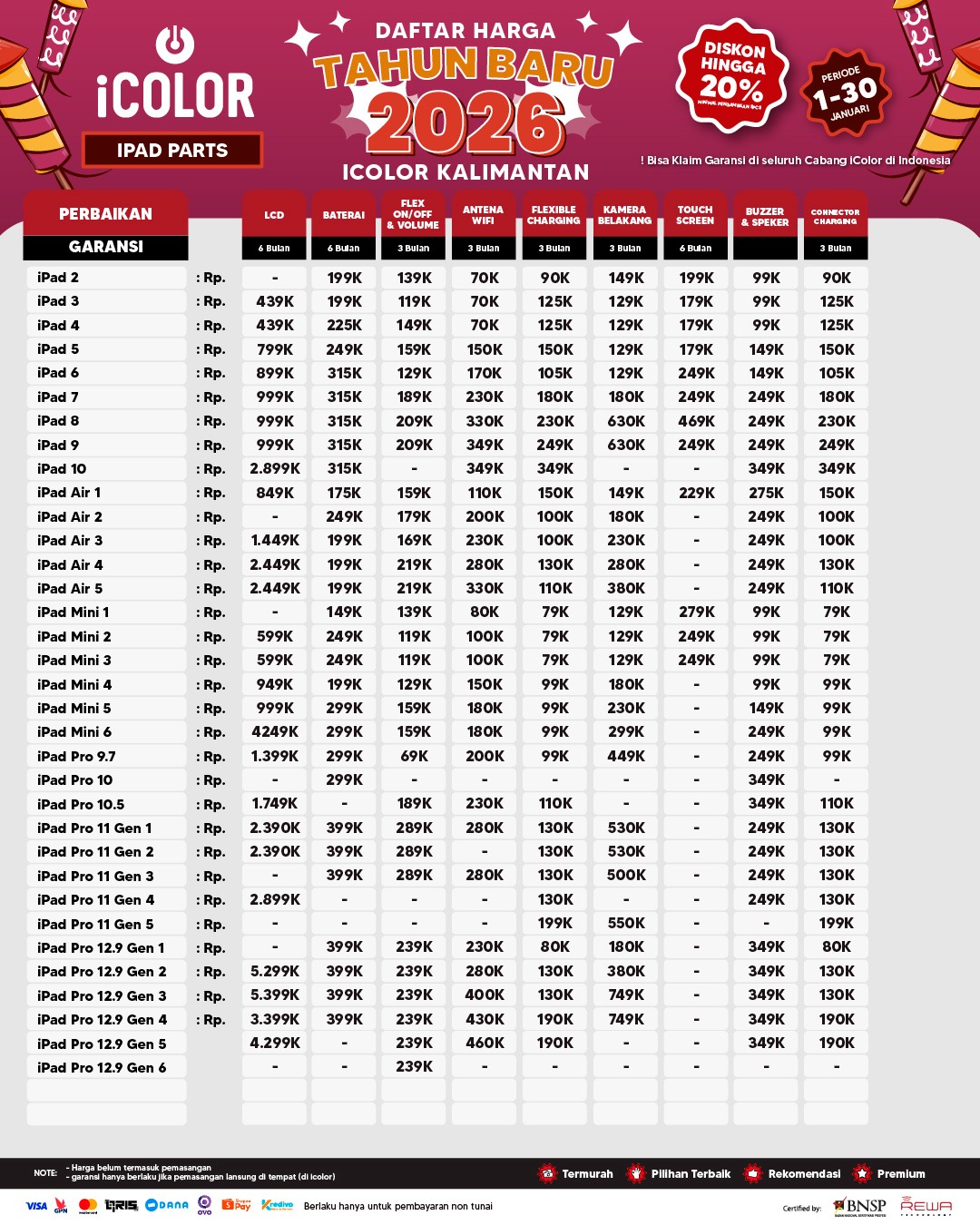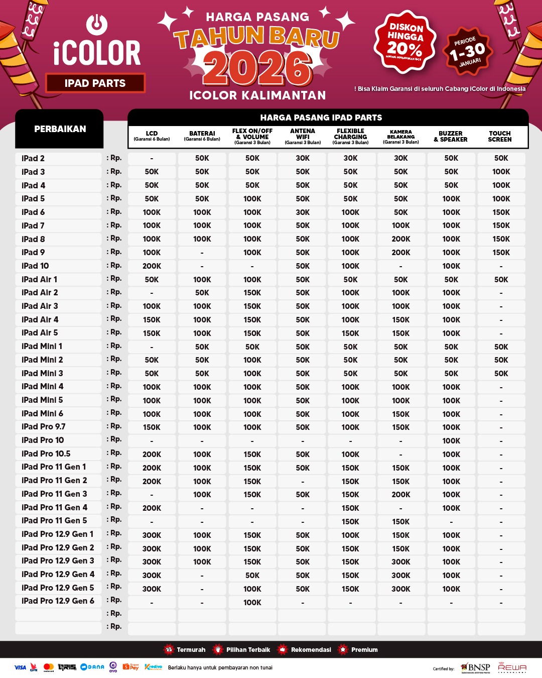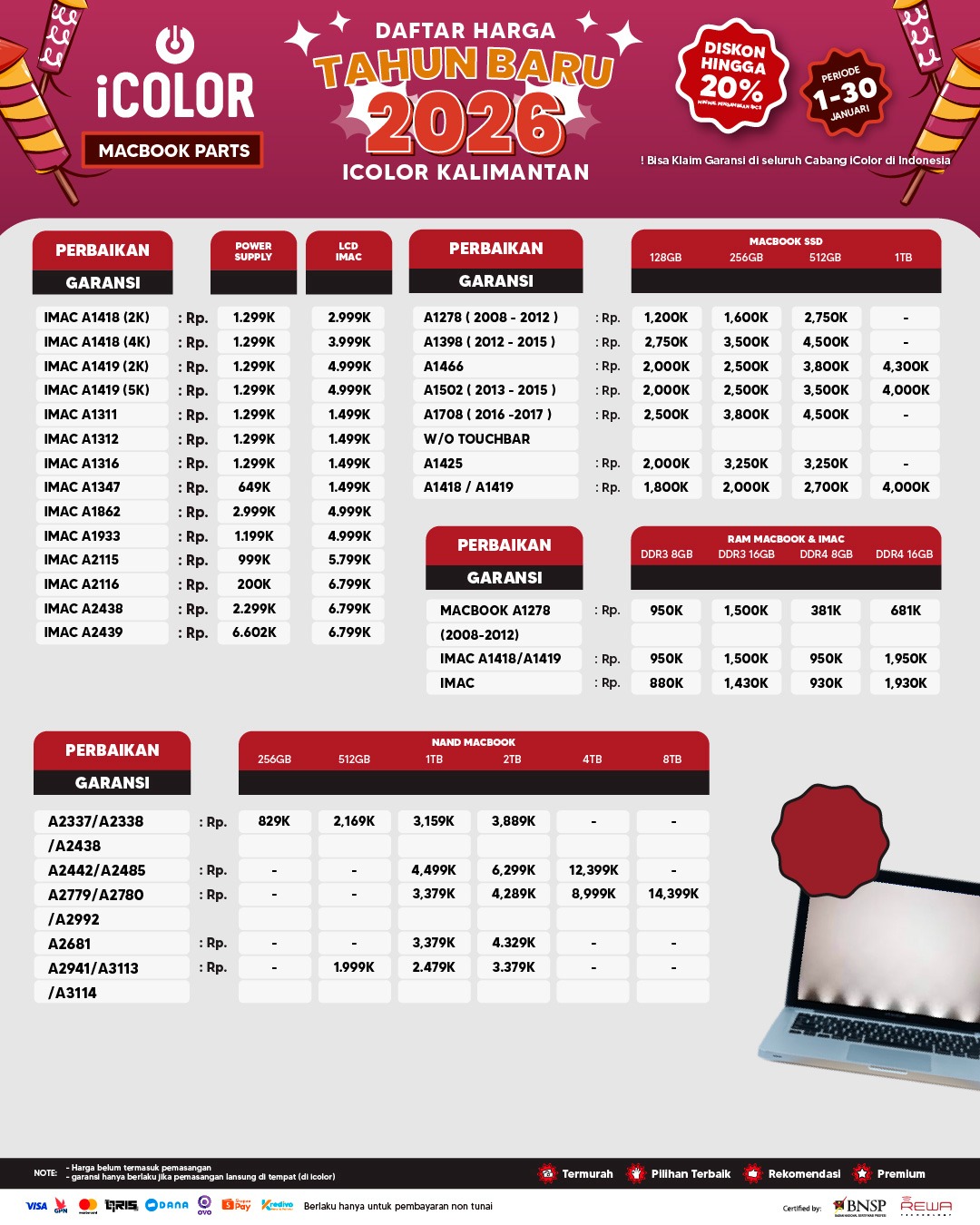 Kami menjanjikan harga yang ditawarkan dapat bersaing dan tetap mengutamakan kualitas dari sparepart yang kami sediakan, iColor memberikan harga service yang murah dan terjangkau untuk mencakup seluruh kalangan pengguna apple devices.