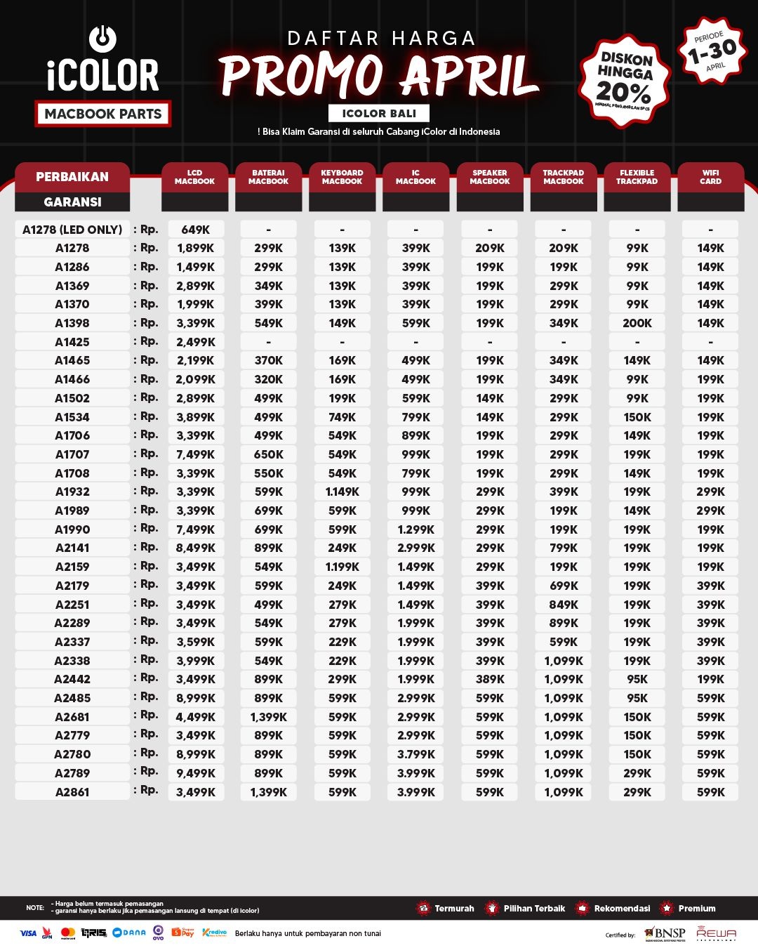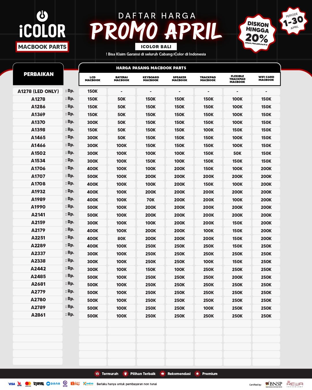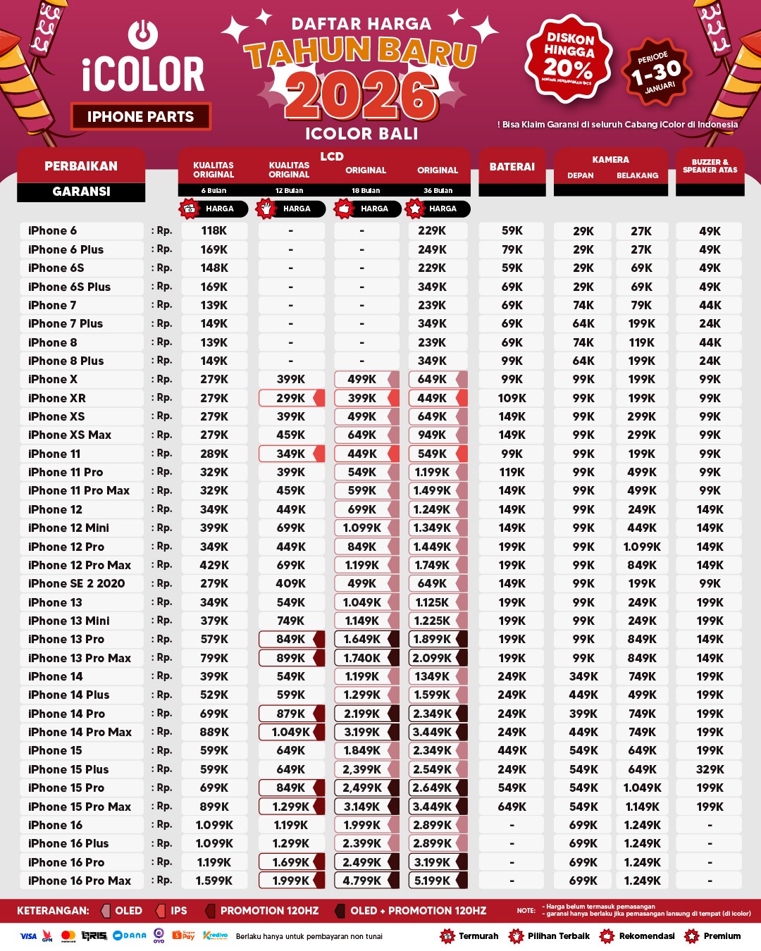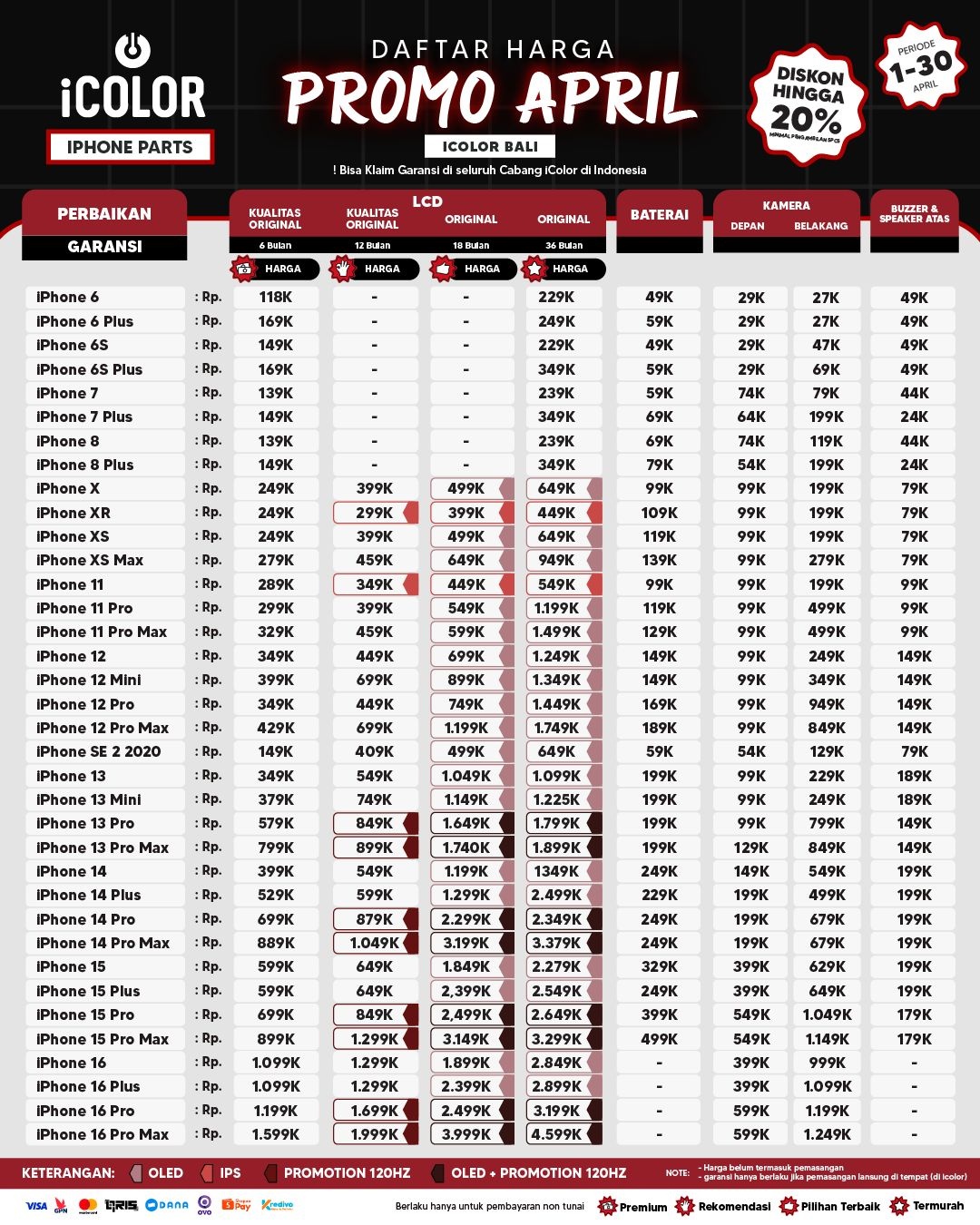 Kami menjanjikan harga yang ditawarkan dapat bersaing dan tetap mengutamakan kualitas dari sparepart yang kami sediakan, iColor memberikan harga service yang murah dan terjangkau untuk mencakup seluruh kalangan pengguna apple devices.