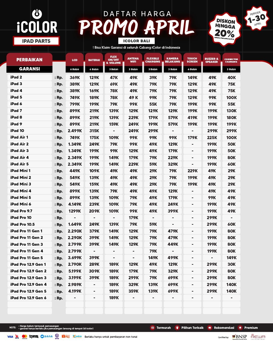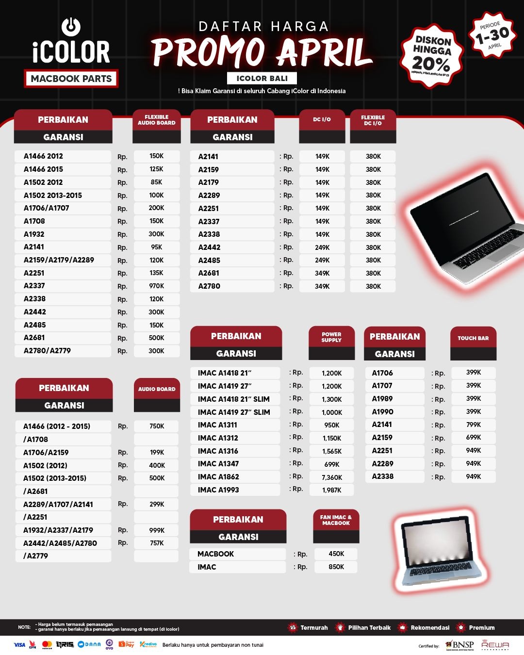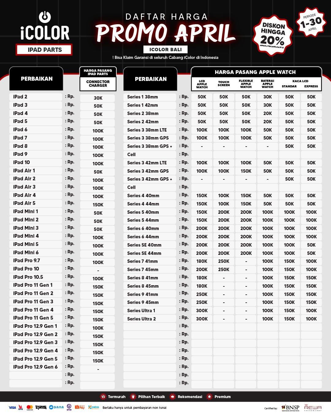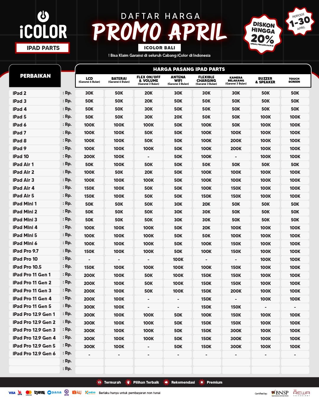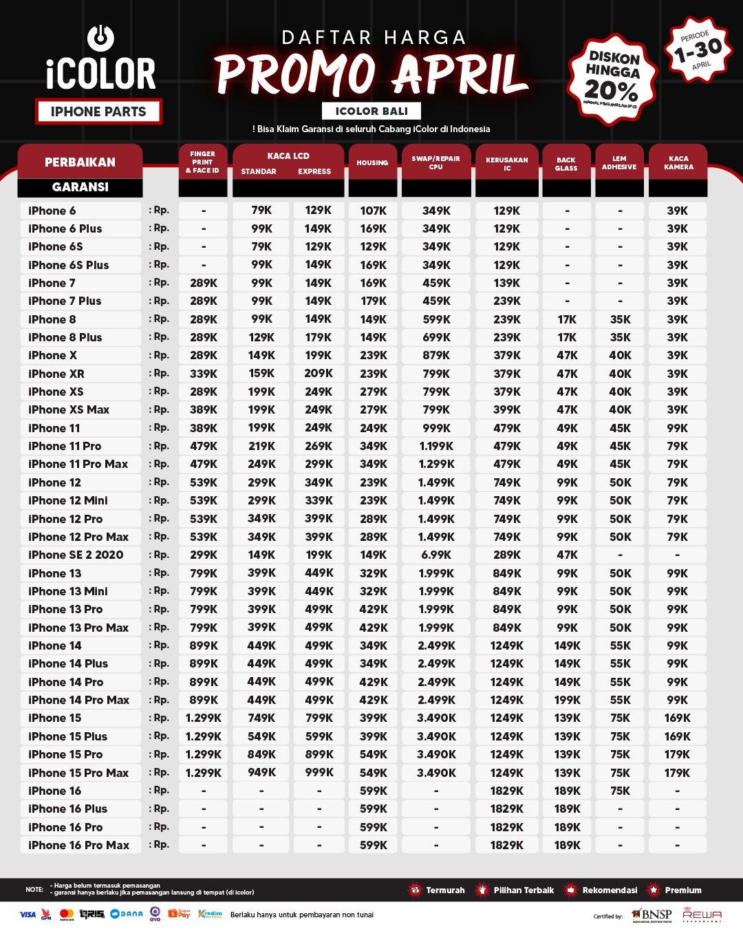 Kami menjanjikan harga yang ditawarkan dapat bersaing dan tetap mengutamakan kualitas dari sparepart yang kami sediakan, iColor memberikan harga service yang murah dan terjangkau untuk mencakup seluruh kalangan pengguna apple devices.