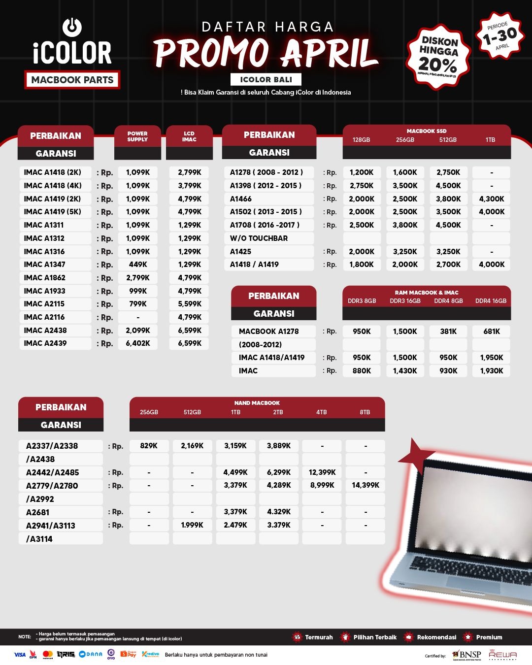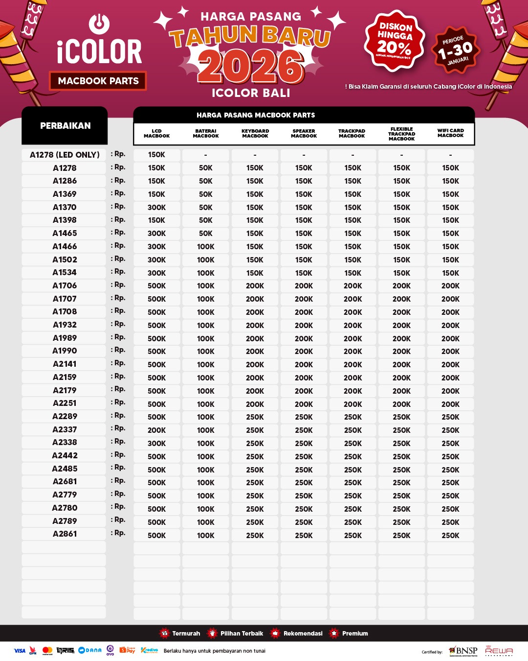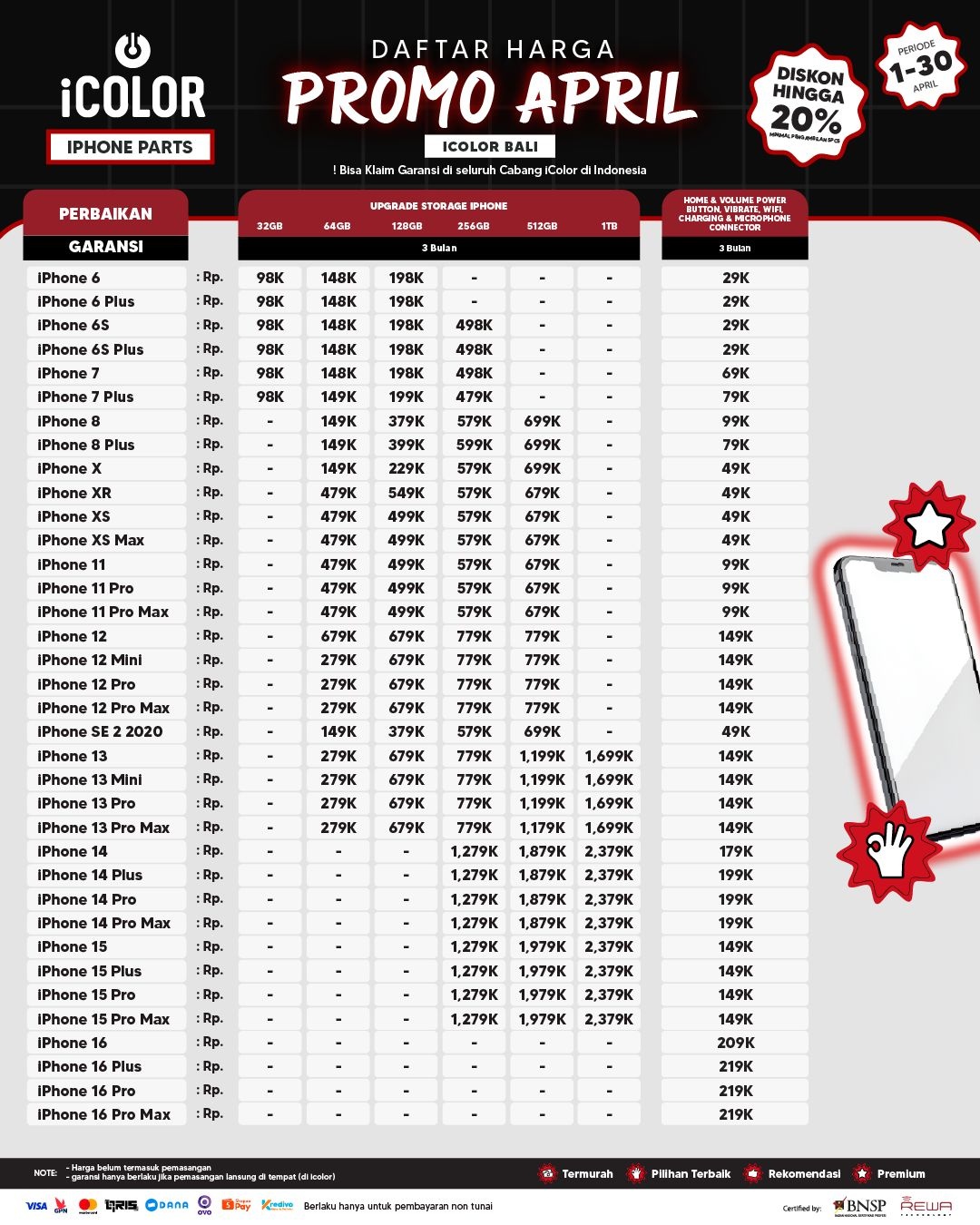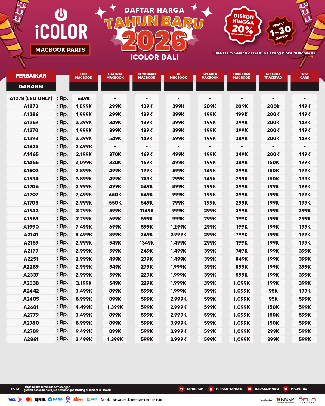 Kami menjanjikan harga yang ditawarkan dapat bersaing dan tetap mengutamakan kualitas dari sparepart yang kami sediakan, iColor memberikan harga service yang murah dan terjangkau untuk mencakup seluruh kalangan pengguna apple devices.