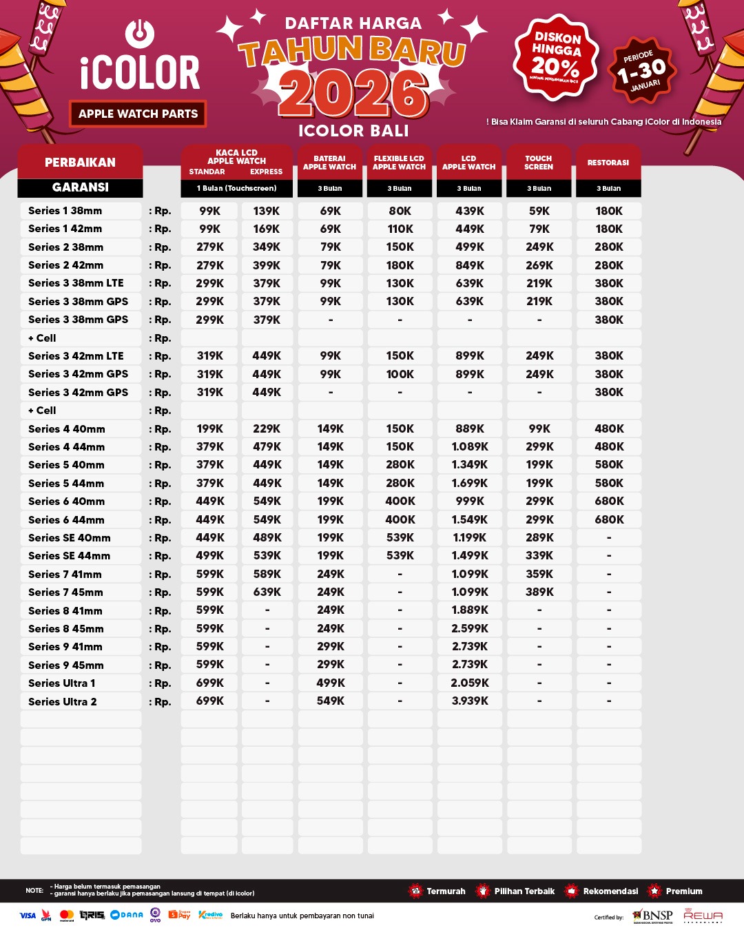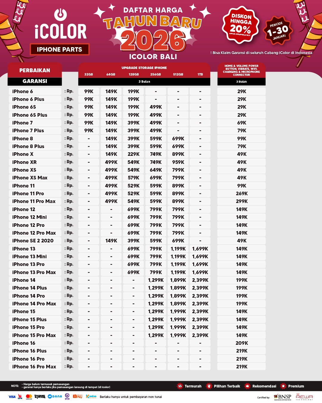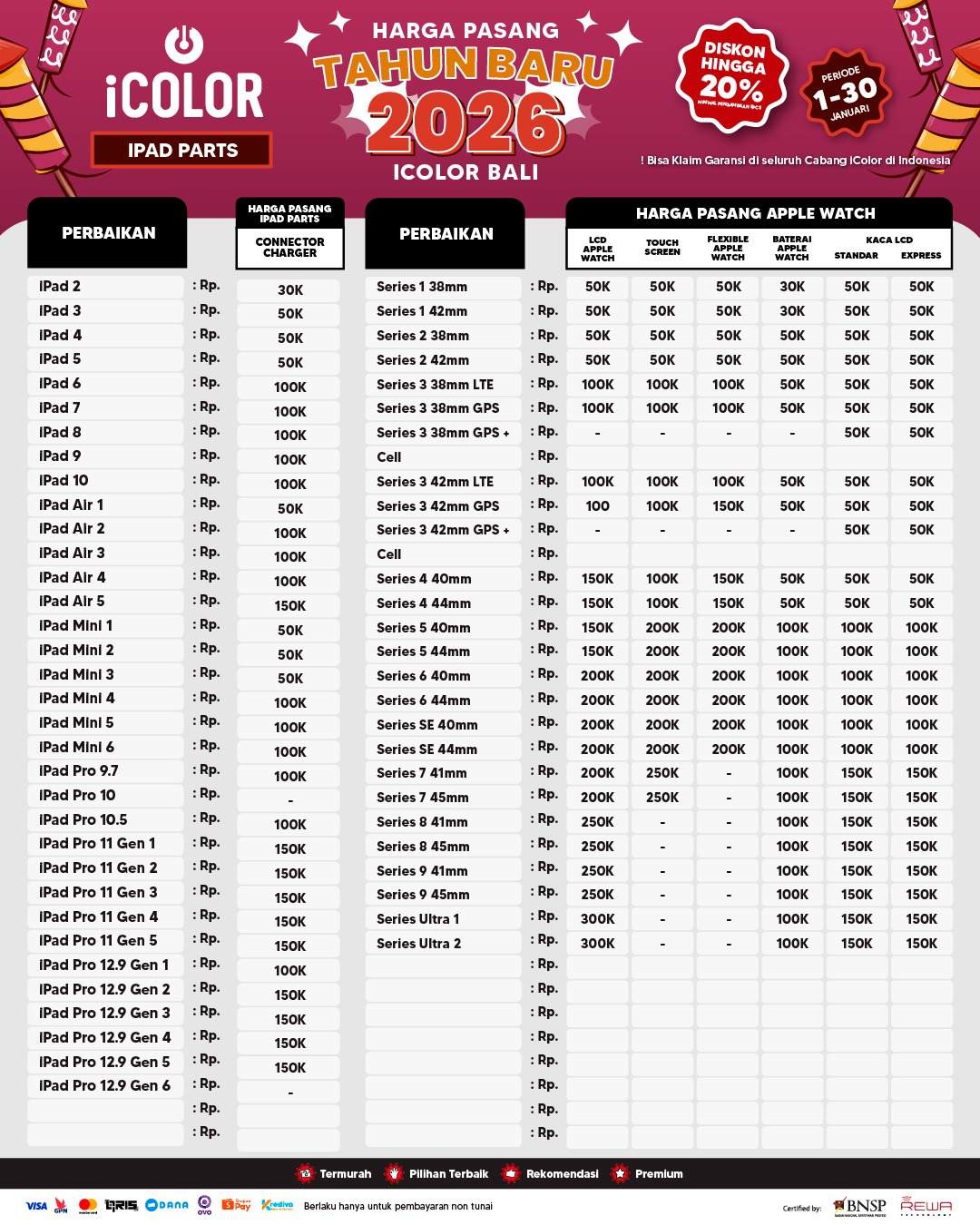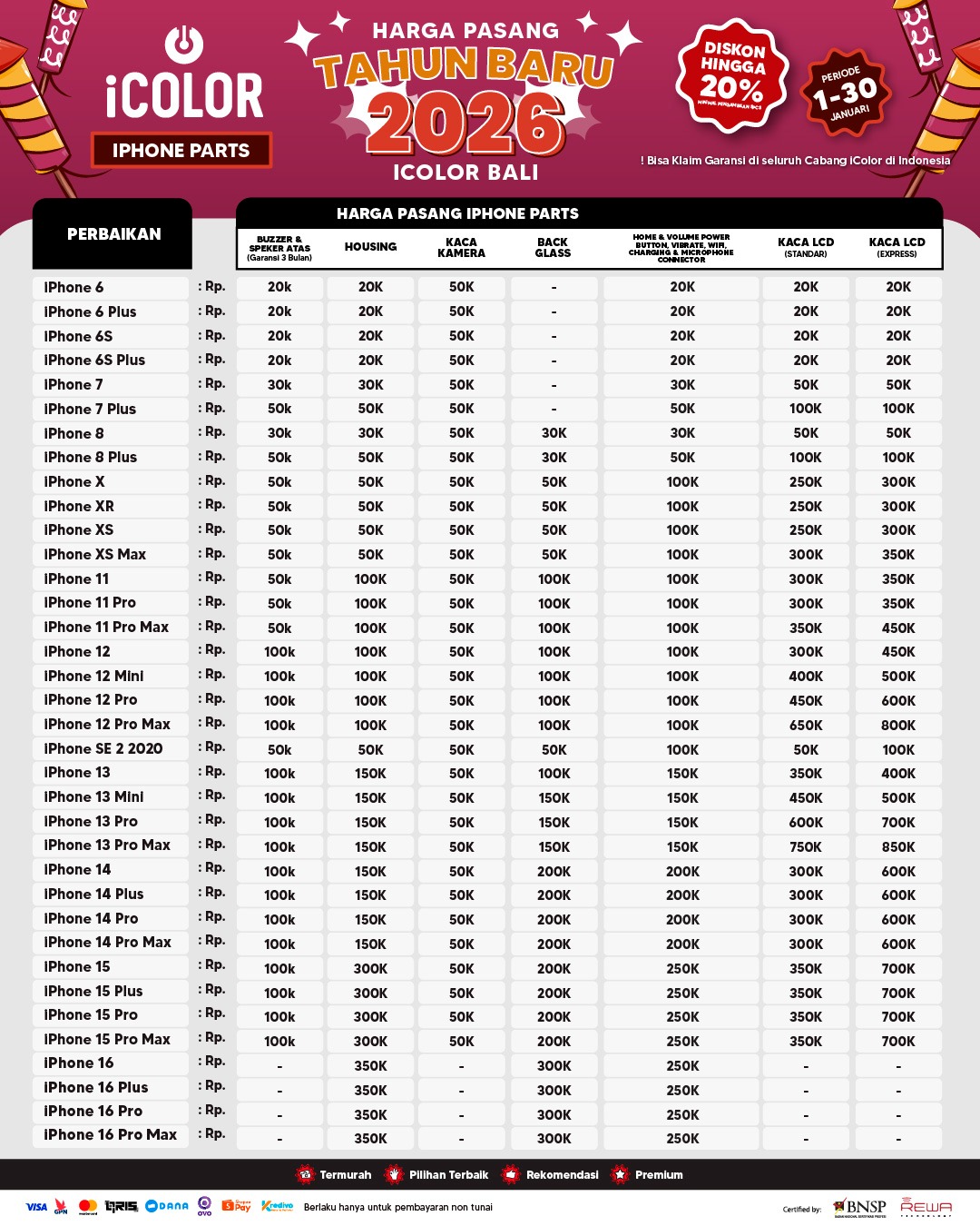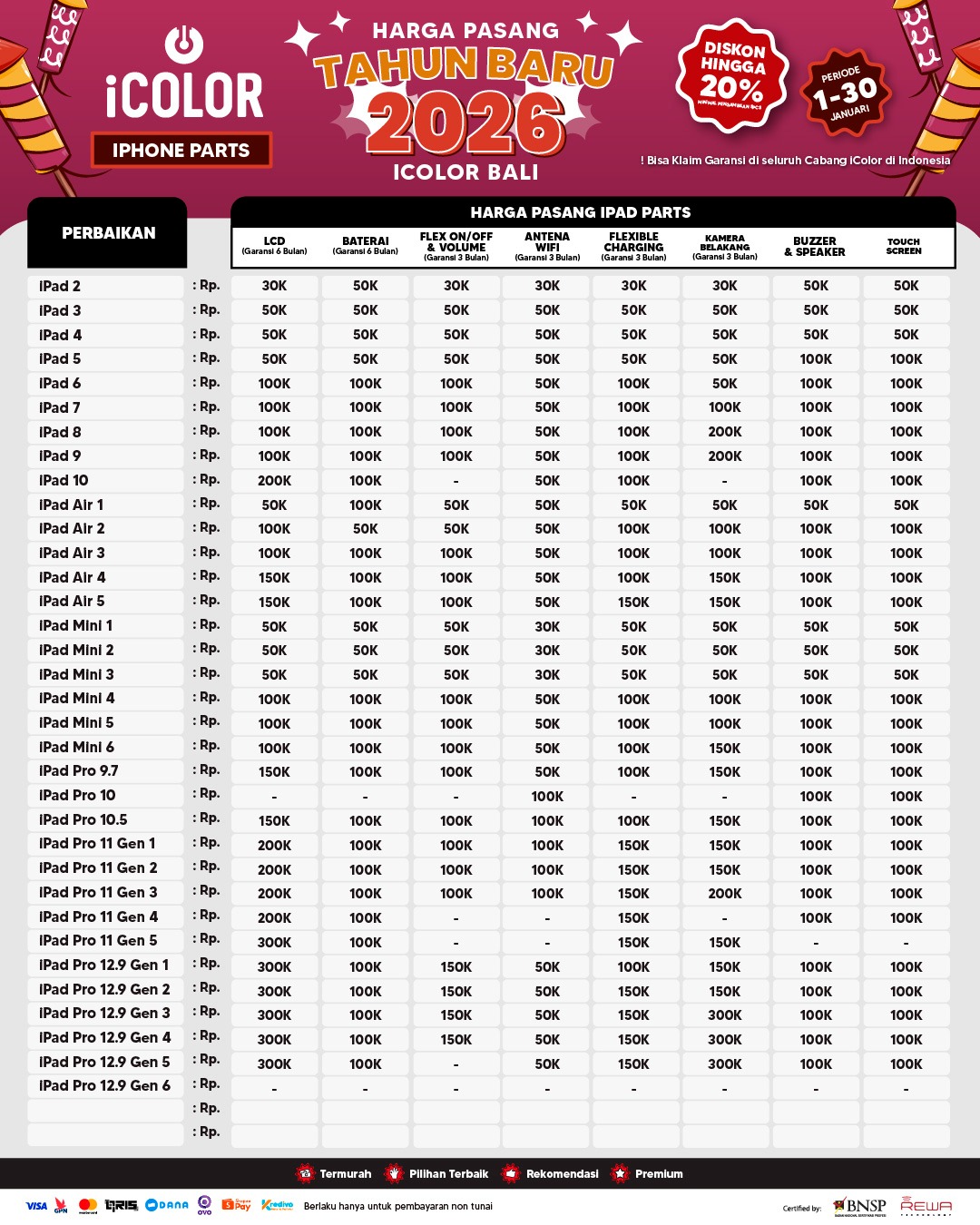Kami menjanjikan harga yang ditawarkan dapat bersaing dan tetap mengutamakan kualitas dari sparepart yang kami sediakan, iColor memberikan harga service yang murah dan terjangkau untuk mencakup seluruh kalangan pengguna apple devices.