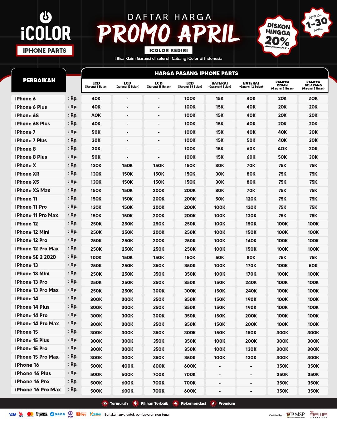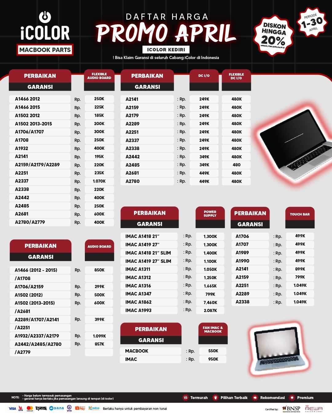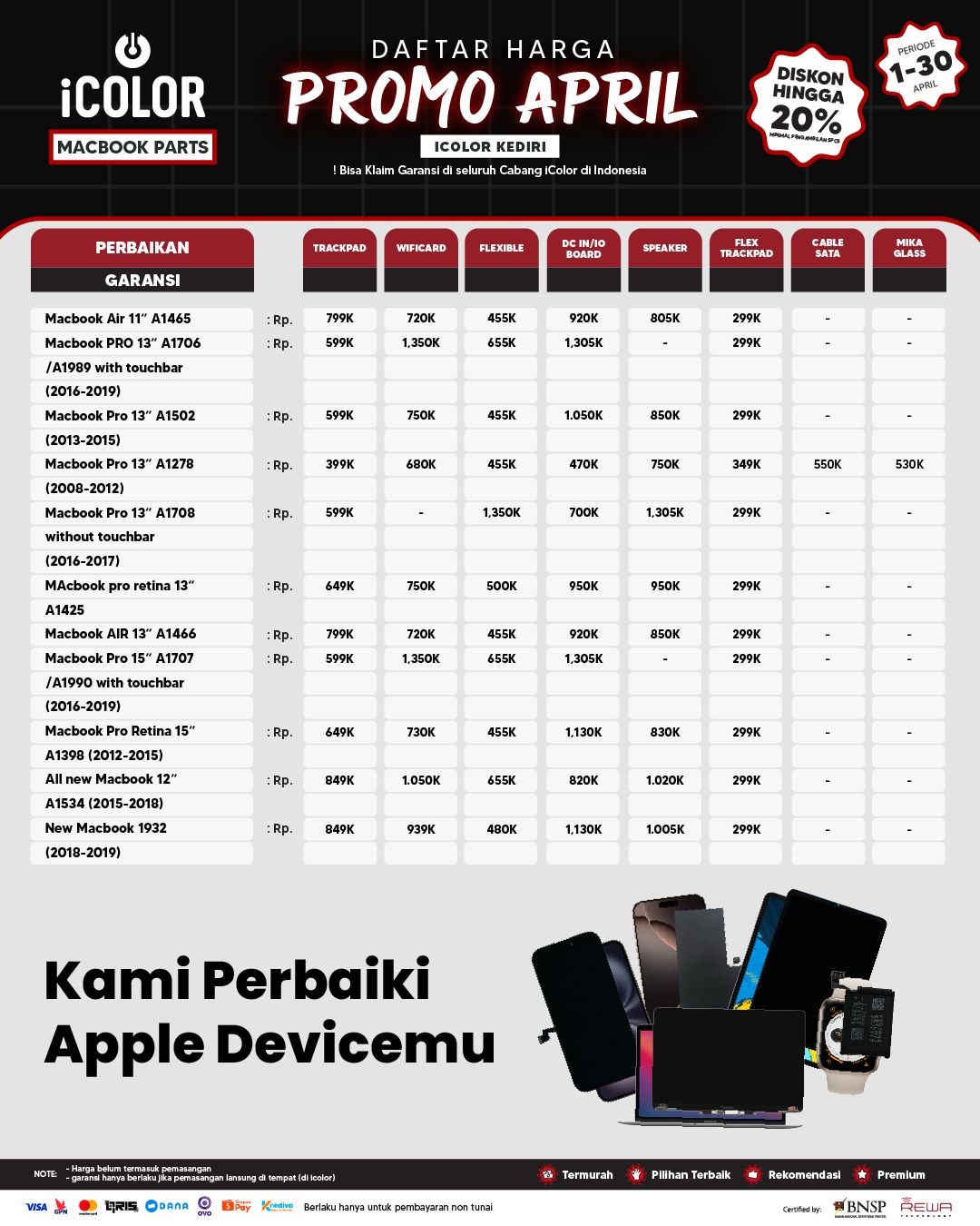 Kami menjanjikan harga yang ditawarkan dapat bersaing dan tetap mengutamakan kualitas dari sparepart yang kami sediakan, iColor memberikan harga service yang murah dan terjangkau untuk mencakup seluruh kalangan pengguna apple devices.
