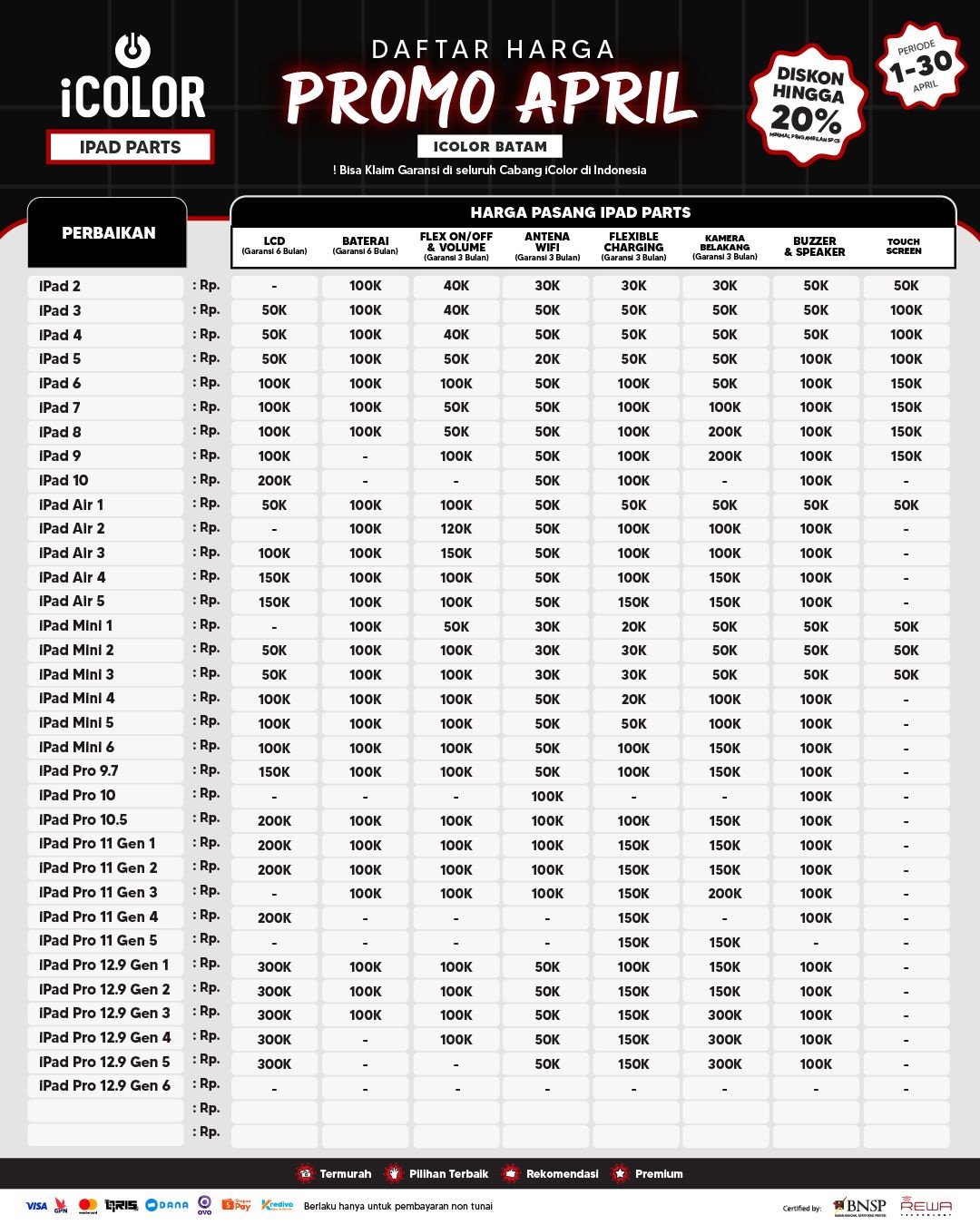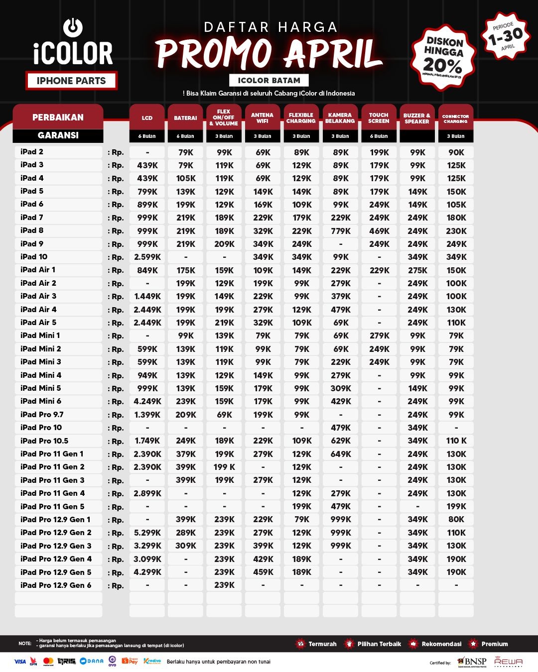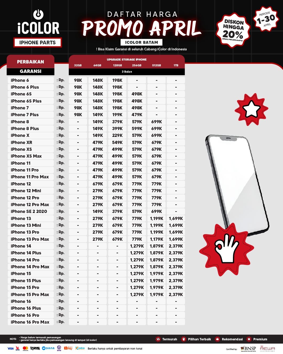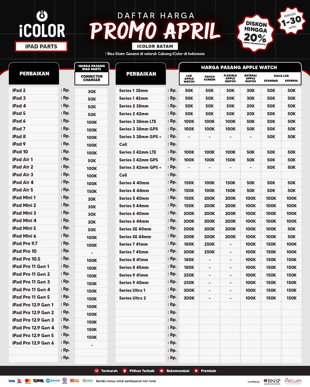 Kami menjanjikan harga yang ditawarkan dapat bersaing dan tetap mengutamakan kualitas dari sparepart yang kami sediakan, iColor memberikan harga service yang murah dan terjangkau untuk mencakup seluruh kalangan pengguna apple devices.