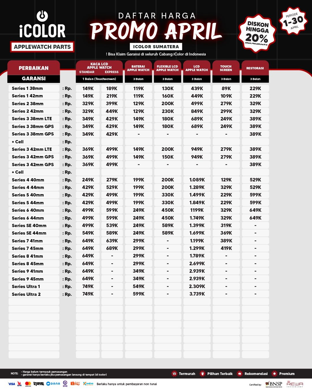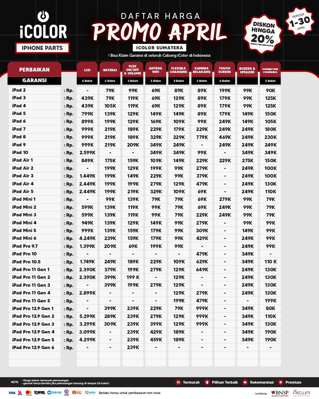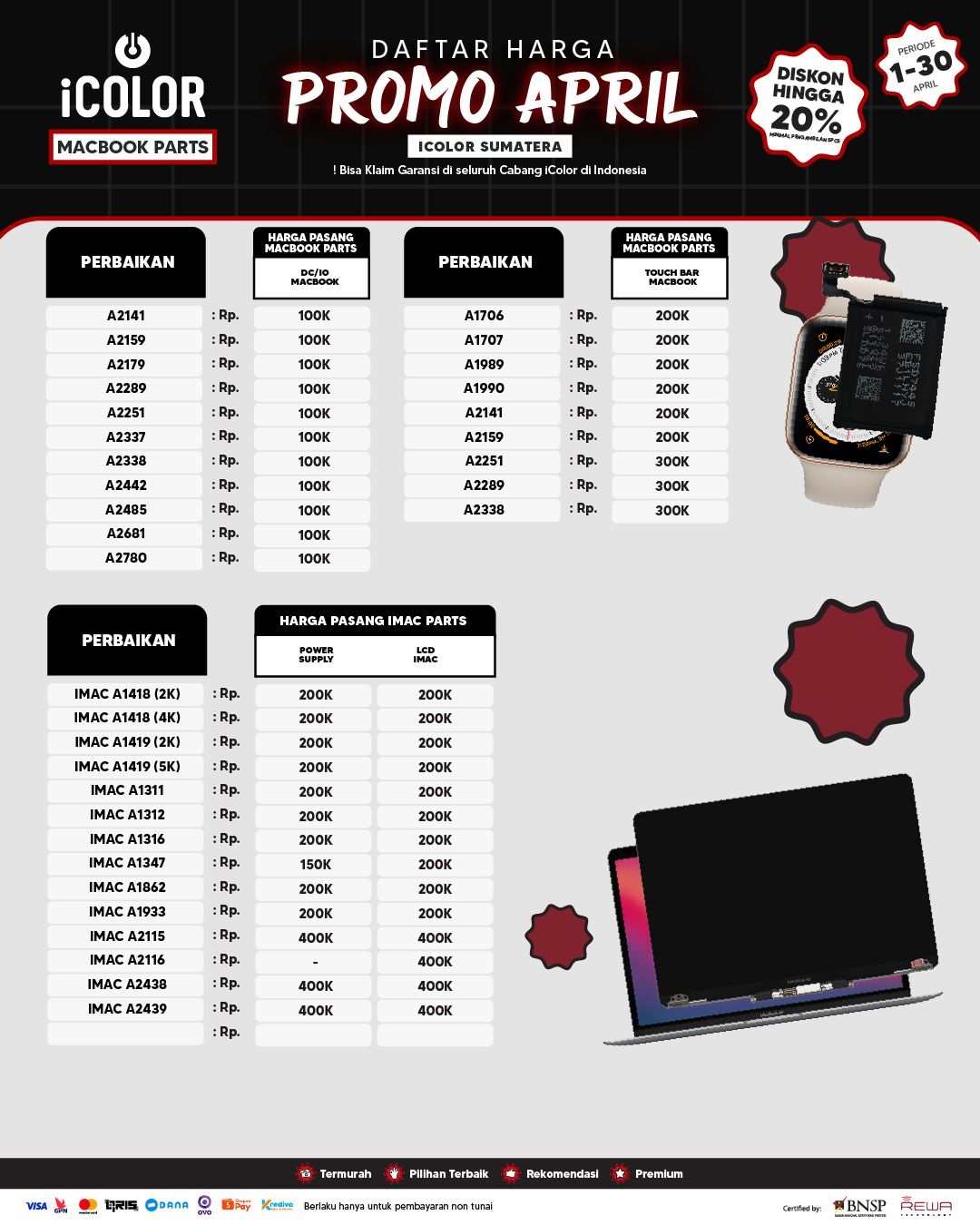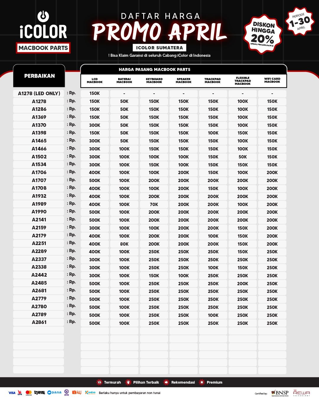 Kami menjanjikan harga yang ditawarkan dapat bersaing dan tetap mengutamakan kualitas dari sparepart yang kami sediakan, iColor memberikan harga service yang murah dan terjangkau untuk mencakup seluruh kalangan pengguna apple devices.