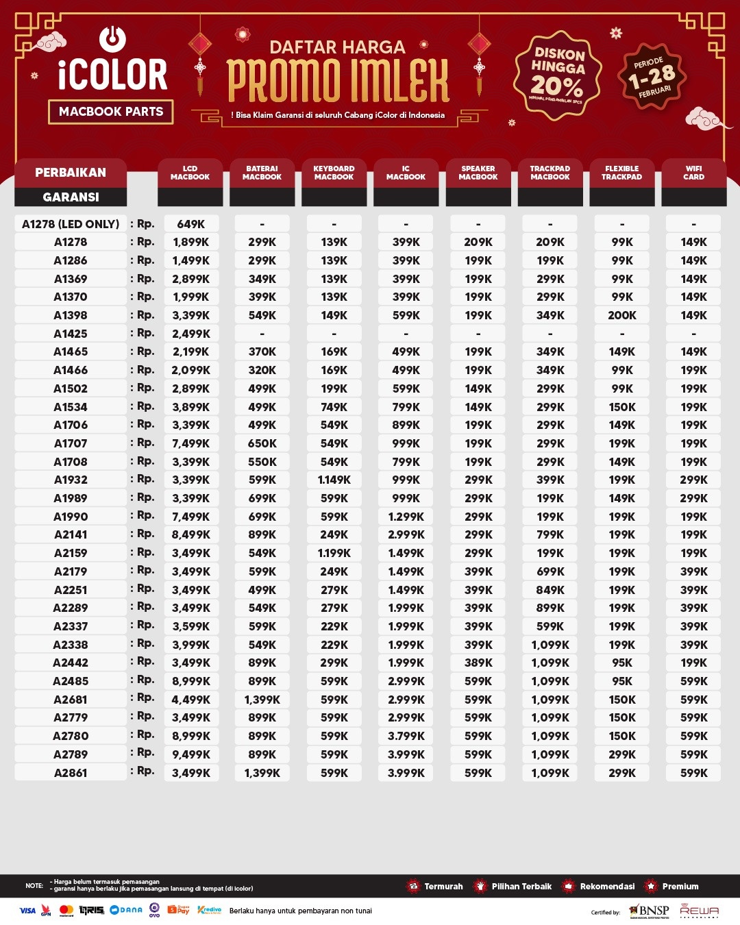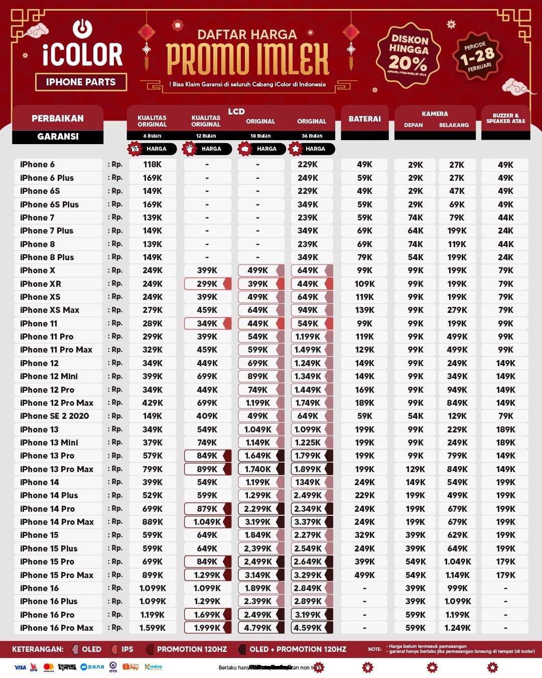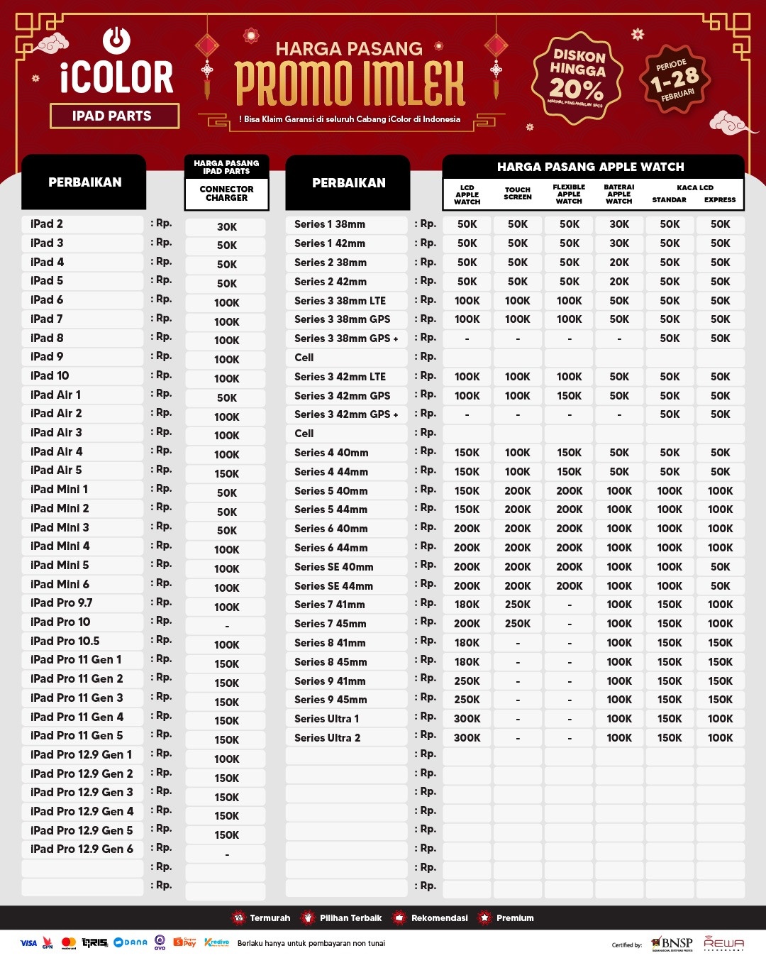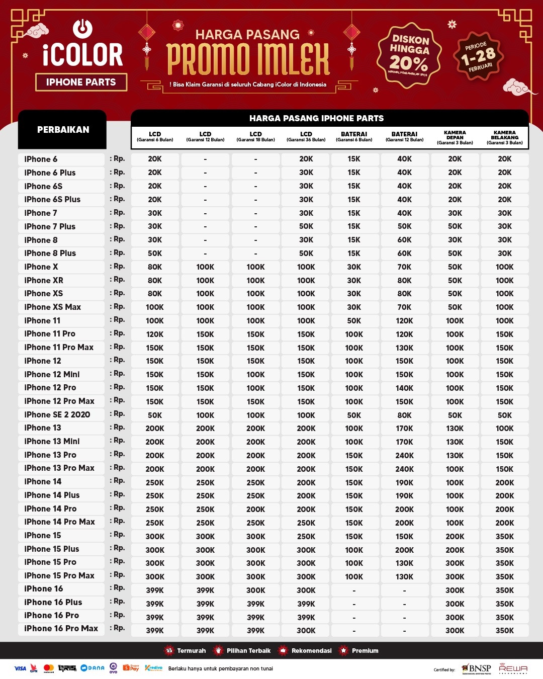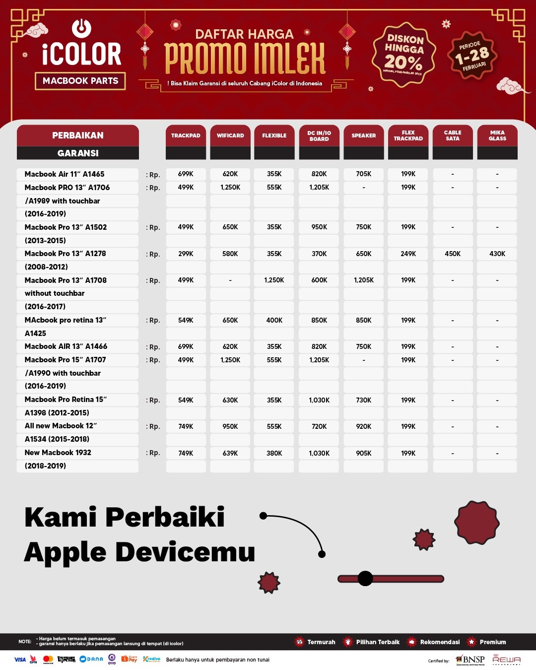 Kami menjanjikan harga yang ditawarkan dapat bersaing dan tetap mengutamakan kualitas dari sparepart yang kami sediakan, iColor memberikan harga service yang murah dan terjangkau untuk mencakup seluruh kalangan pengguna apple devices.