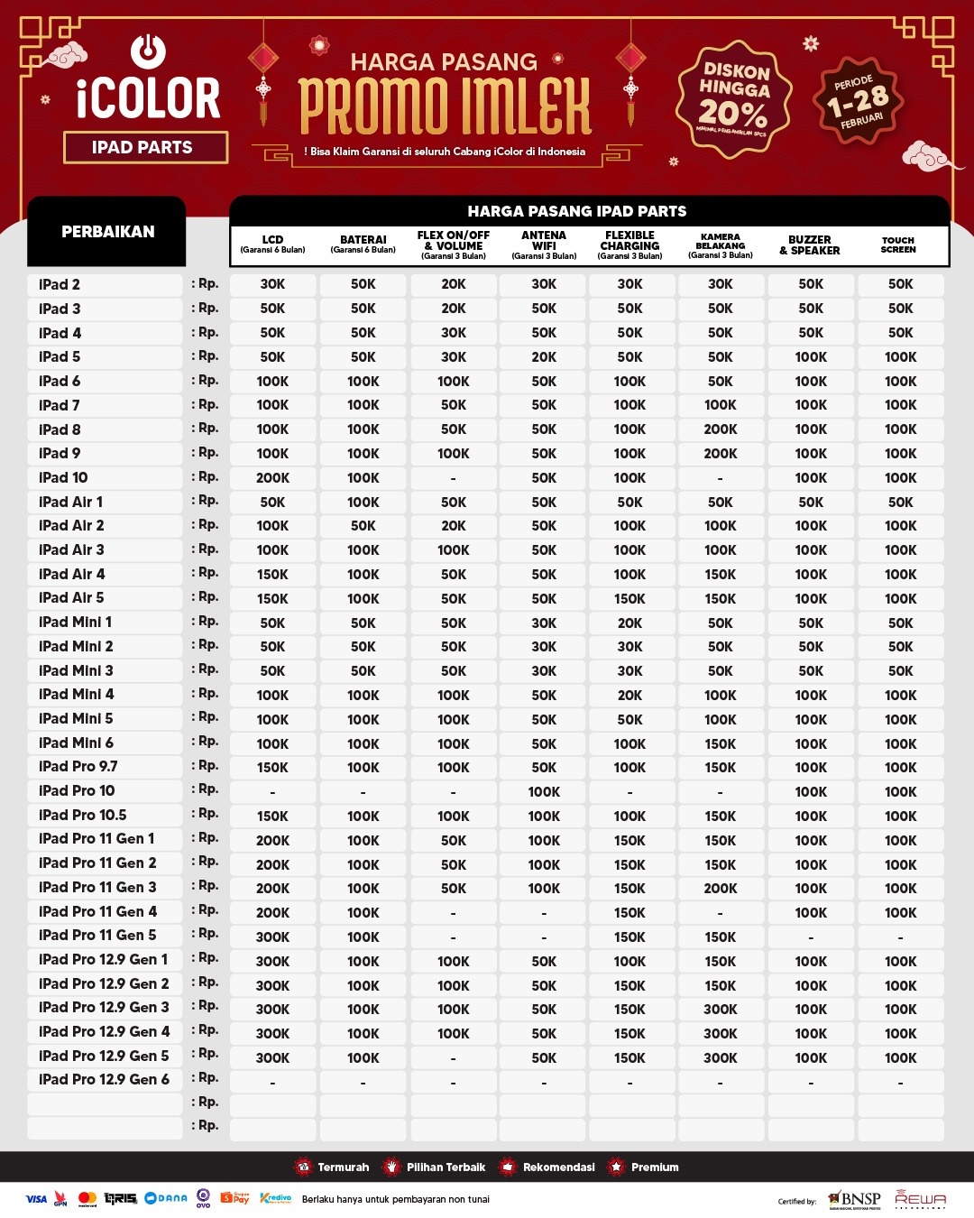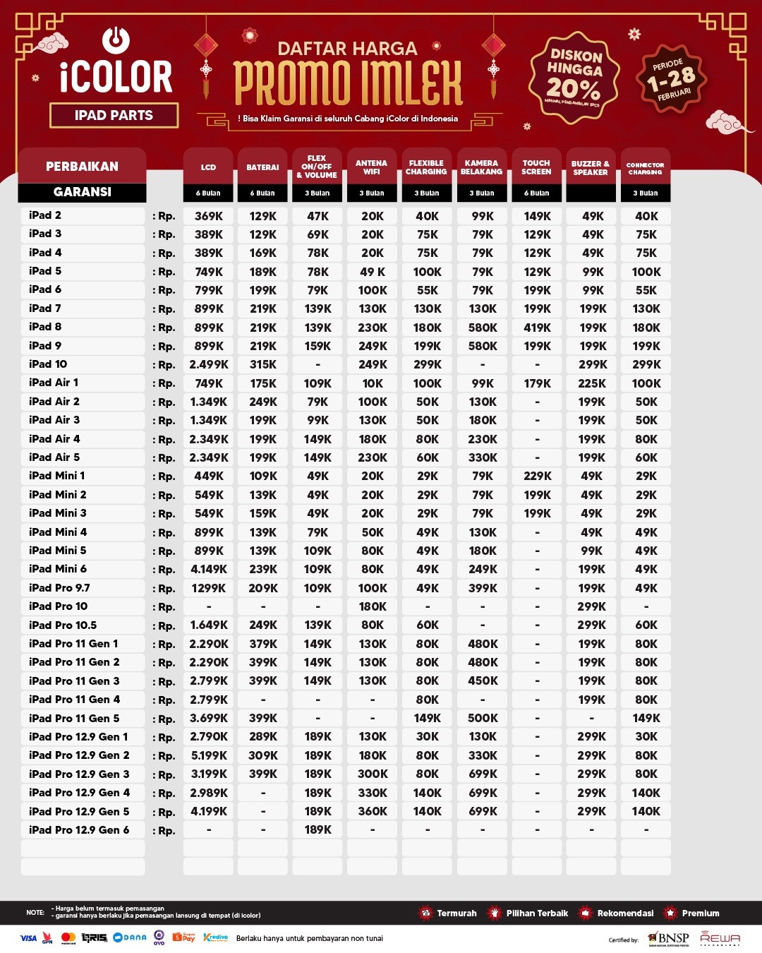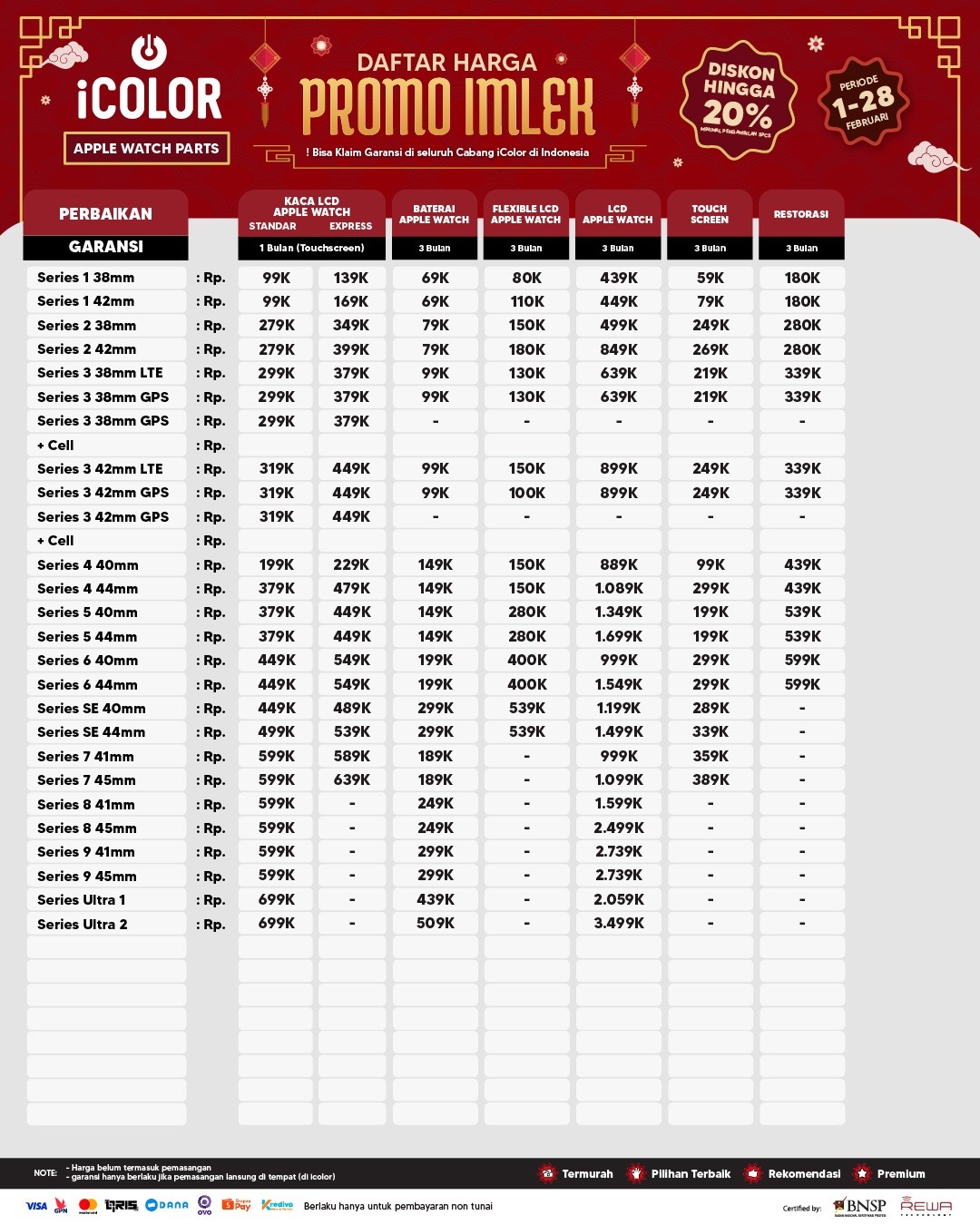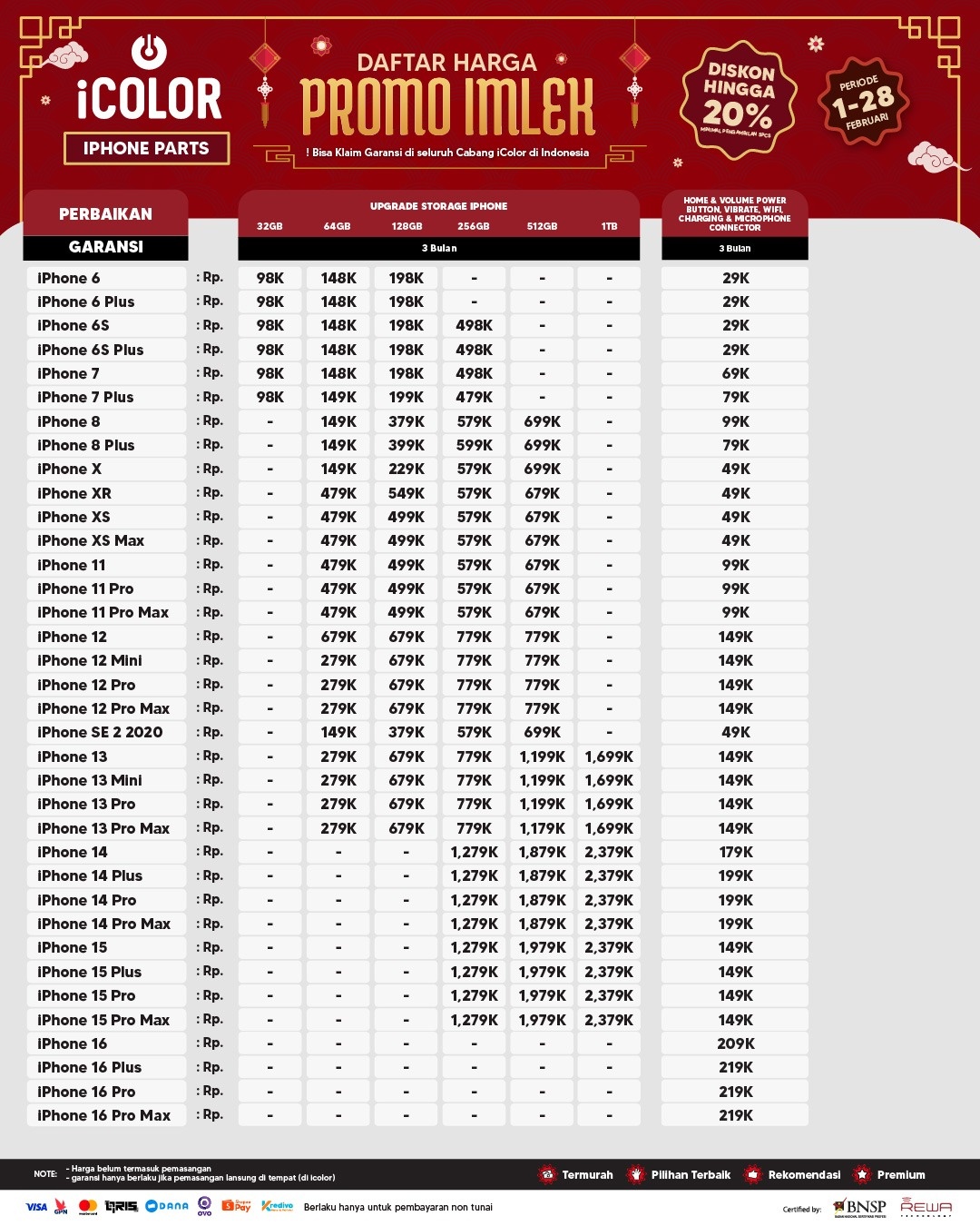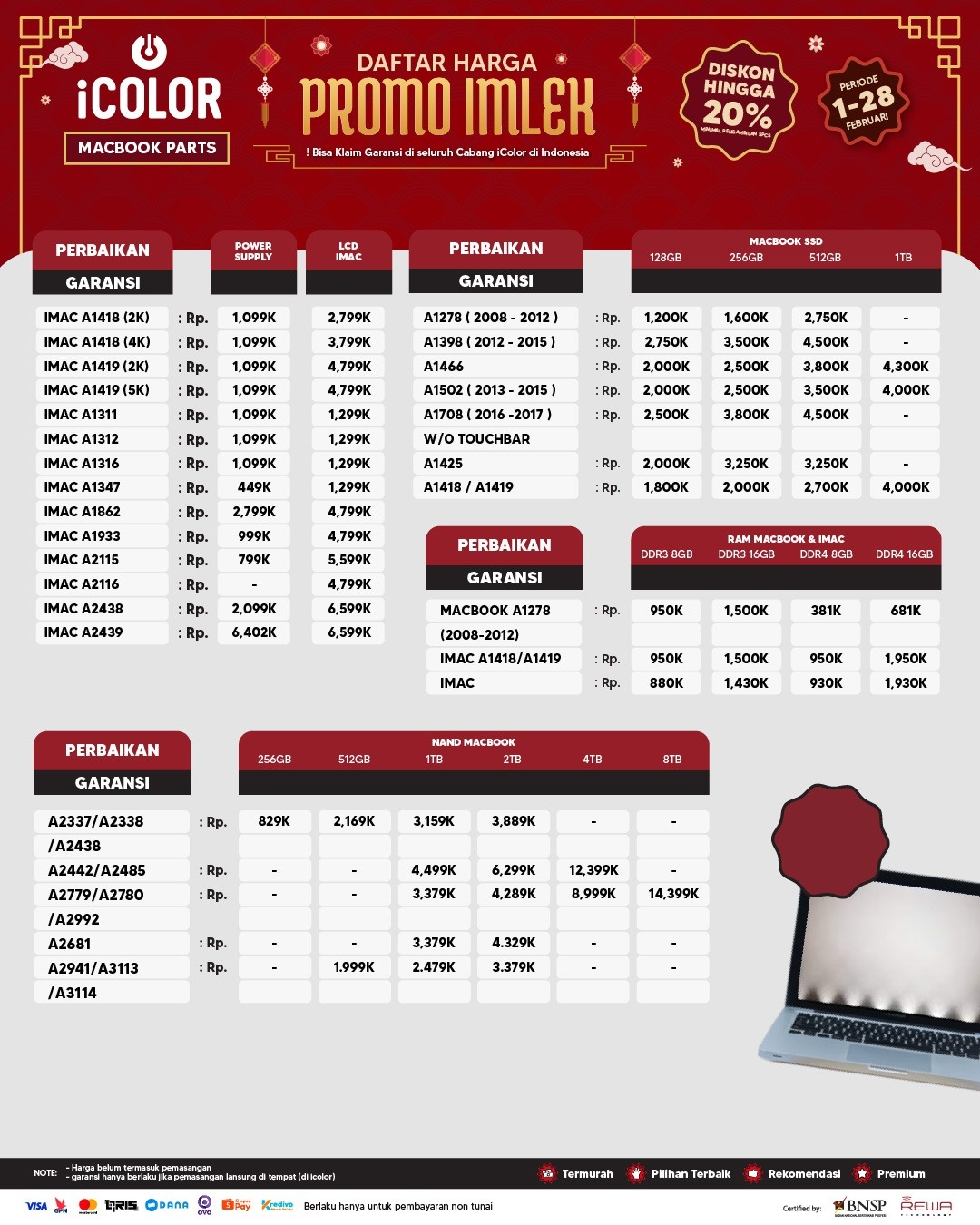 Kami menjanjikan harga yang ditawarkan dapat bersaing dan tetap mengutamakan kualitas dari sparepart yang kami sediakan, iColor memberikan harga service yang murah dan terjangkau untuk mencakup seluruh kalangan pengguna apple devices.