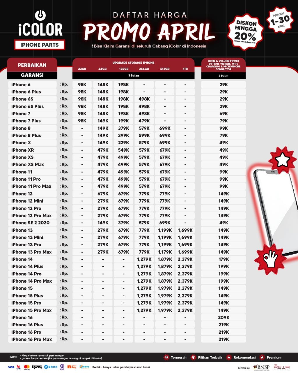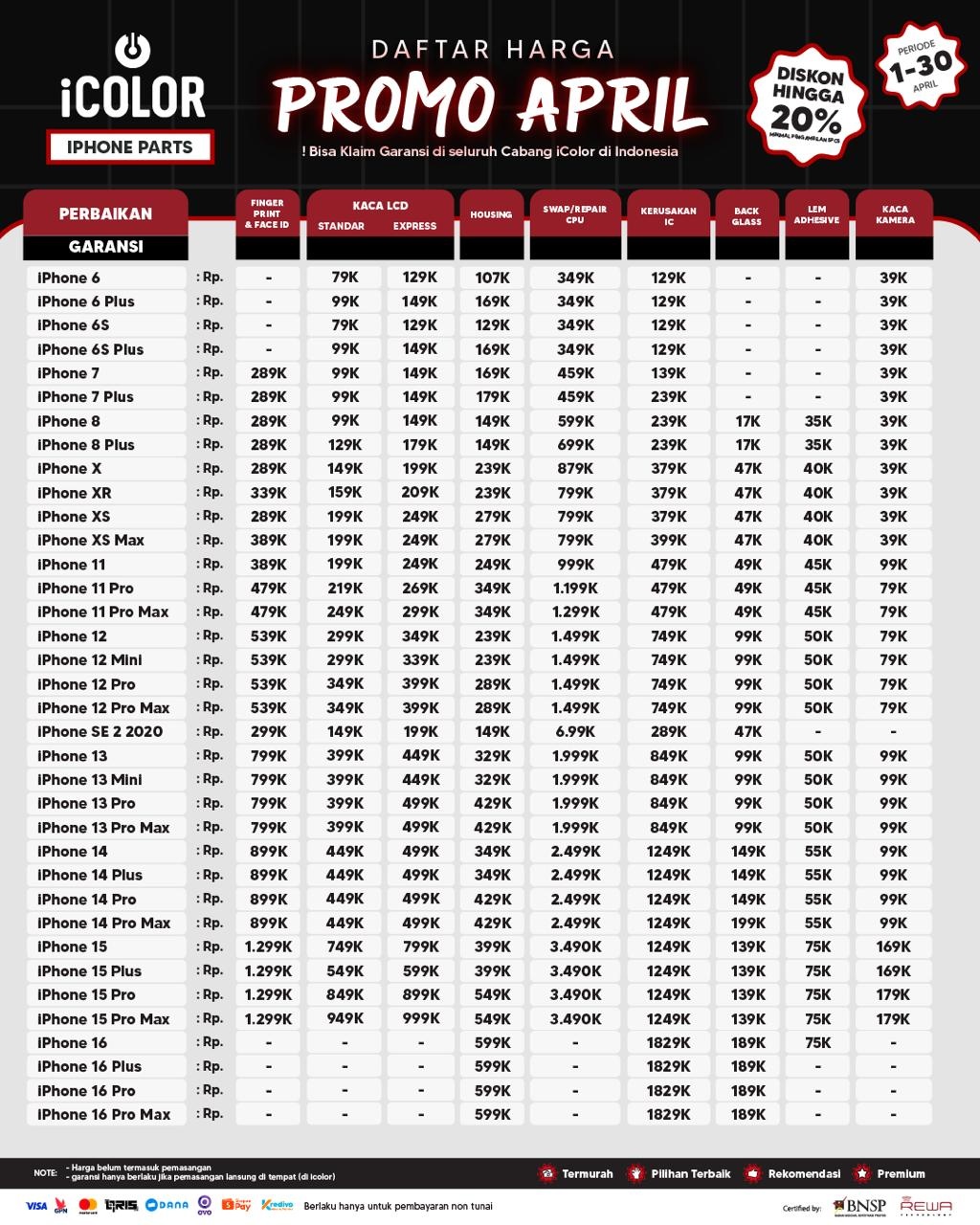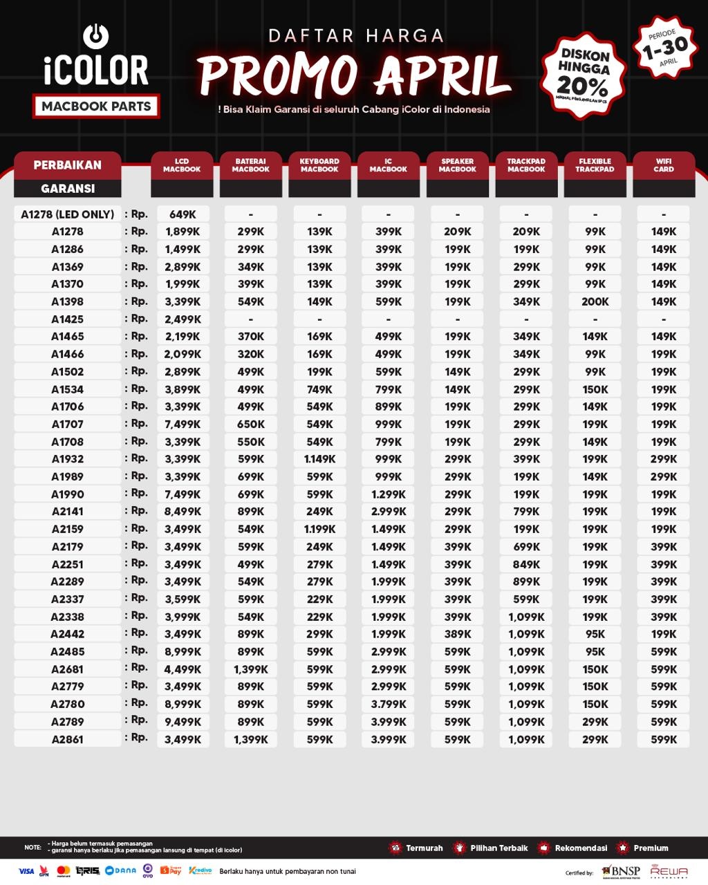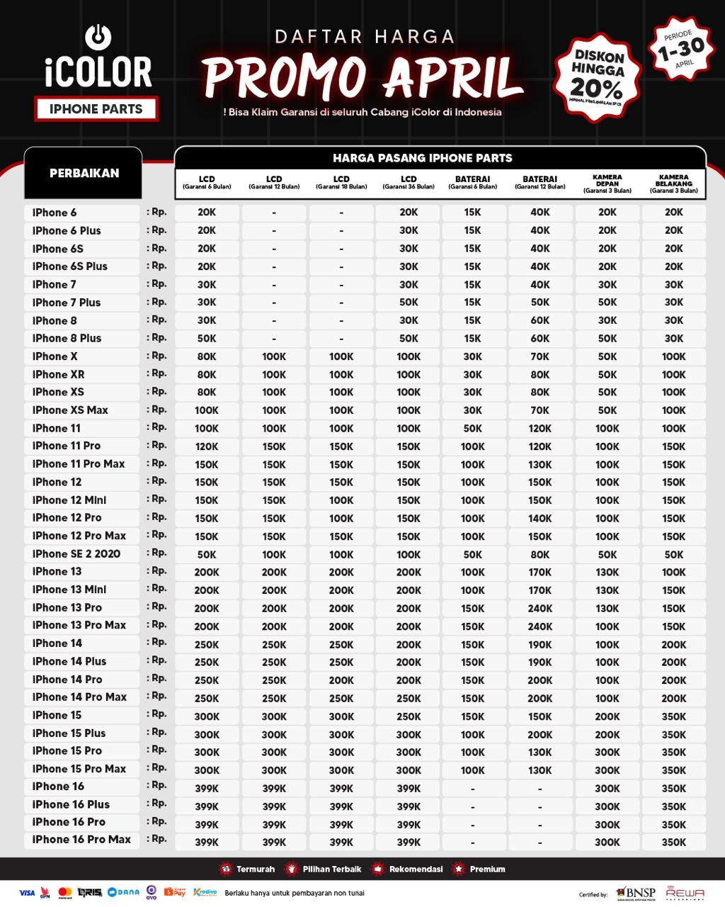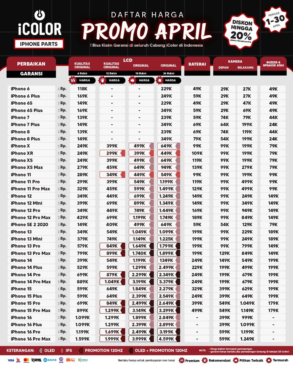 Kami menjanjikan harga yang ditawarkan dapat bersaing dan tetap mengutamakan kualitas dari sparepart yang kami sediakan, iColor memberikan harga service yang murah dan terjangkau untuk mencakup seluruh kalangan pengguna apple devices.