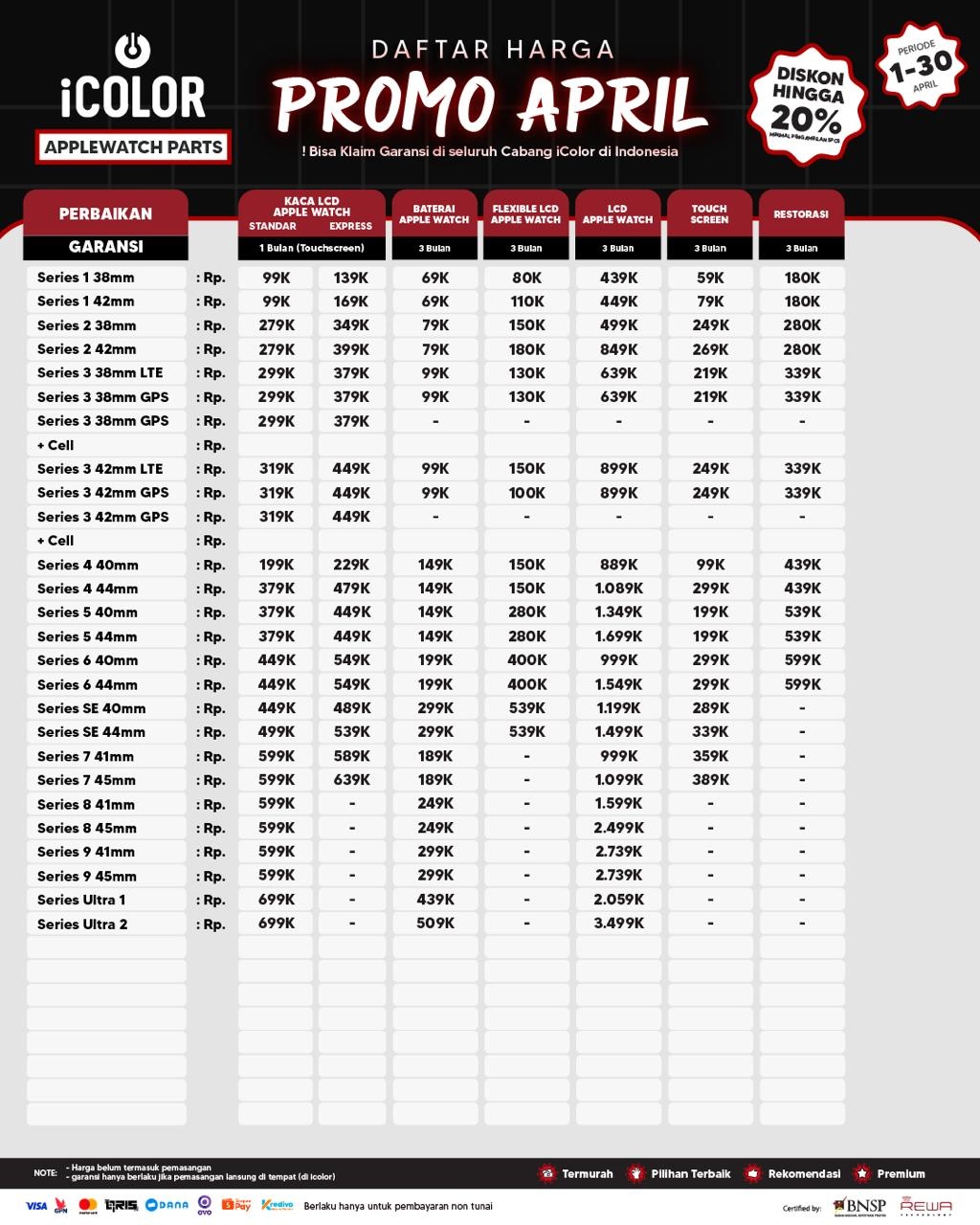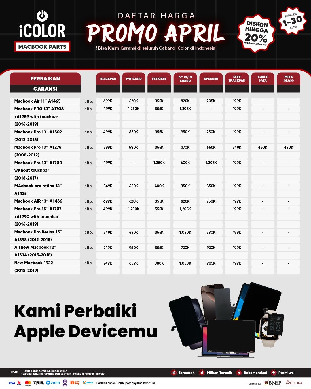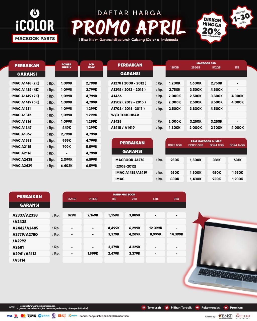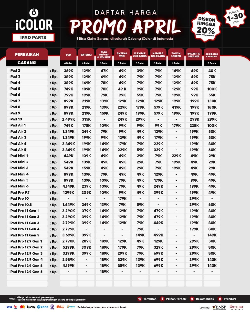 Kami menjanjikan harga yang ditawarkan dapat bersaing dan tetap mengutamakan kualitas dari sparepart yang kami sediakan, iColor memberikan harga service yang murah dan terjangkau untuk mencakup seluruh kalangan pengguna apple devices.