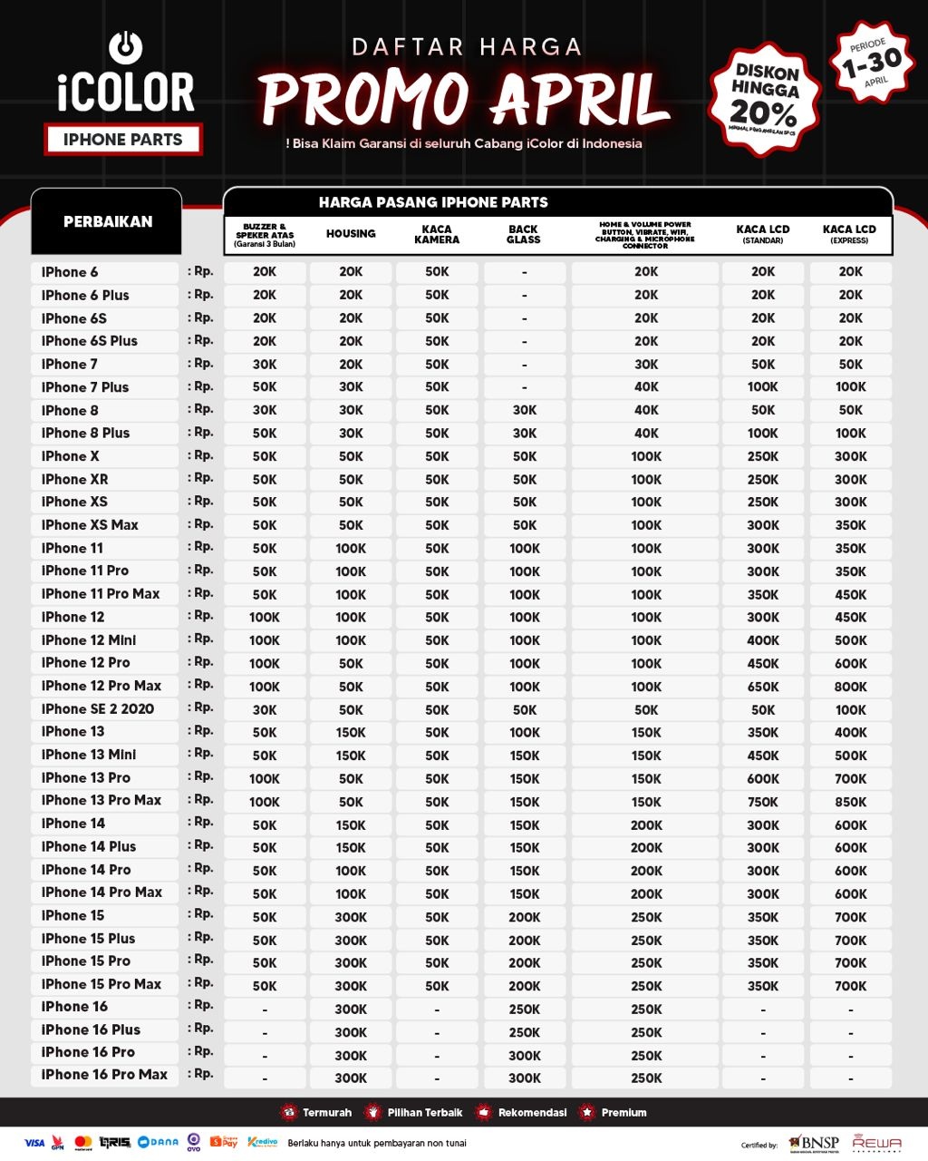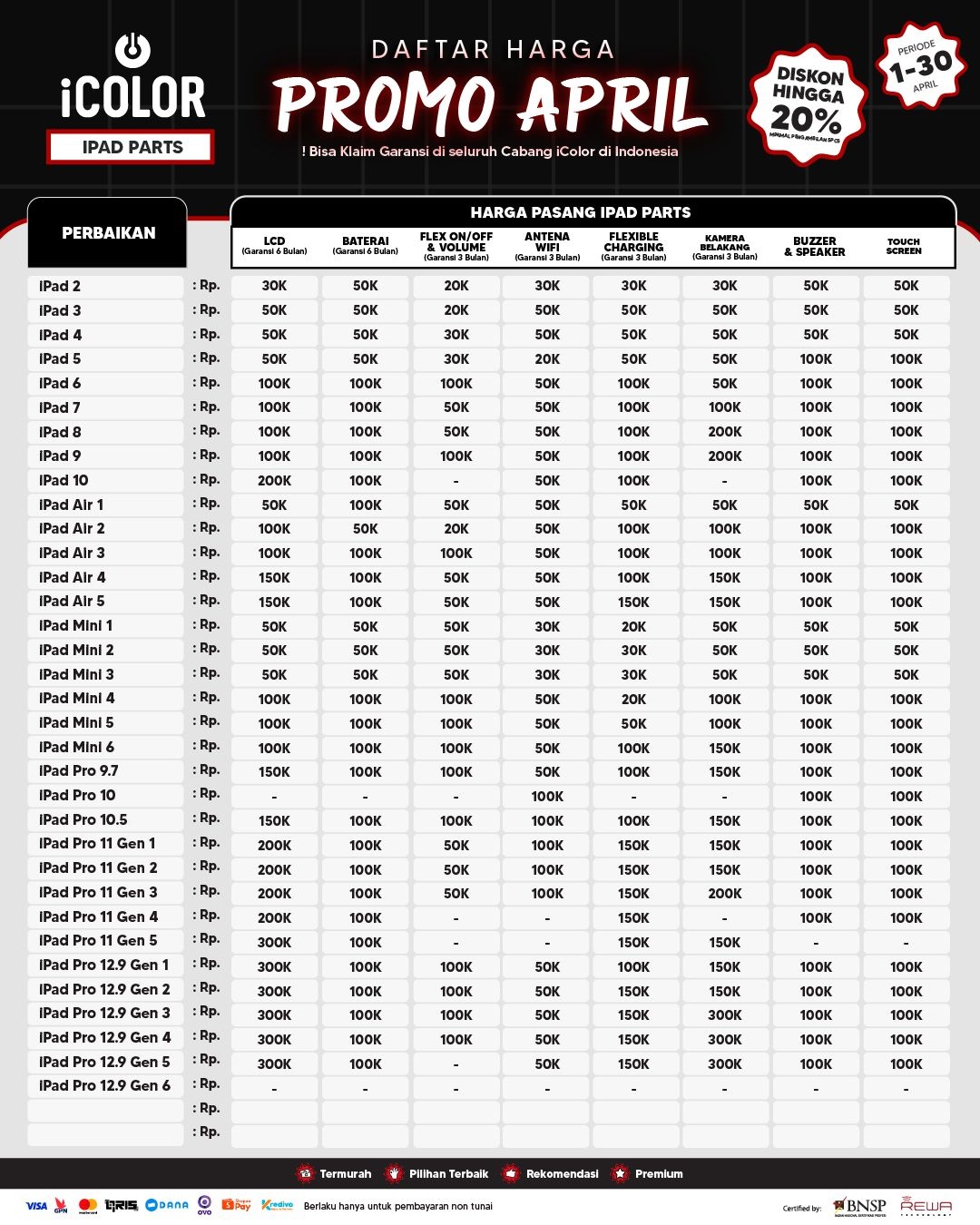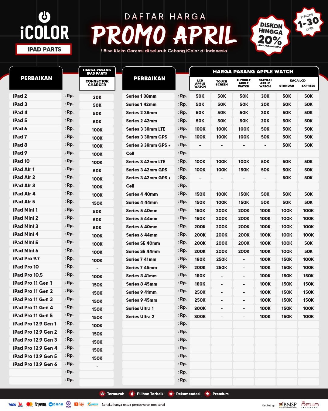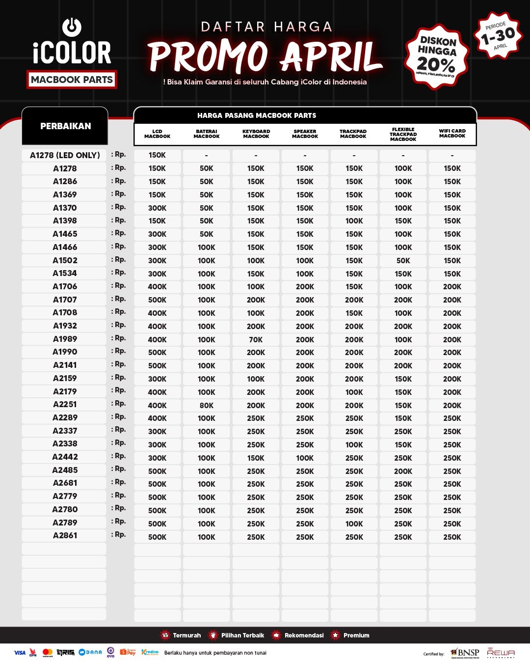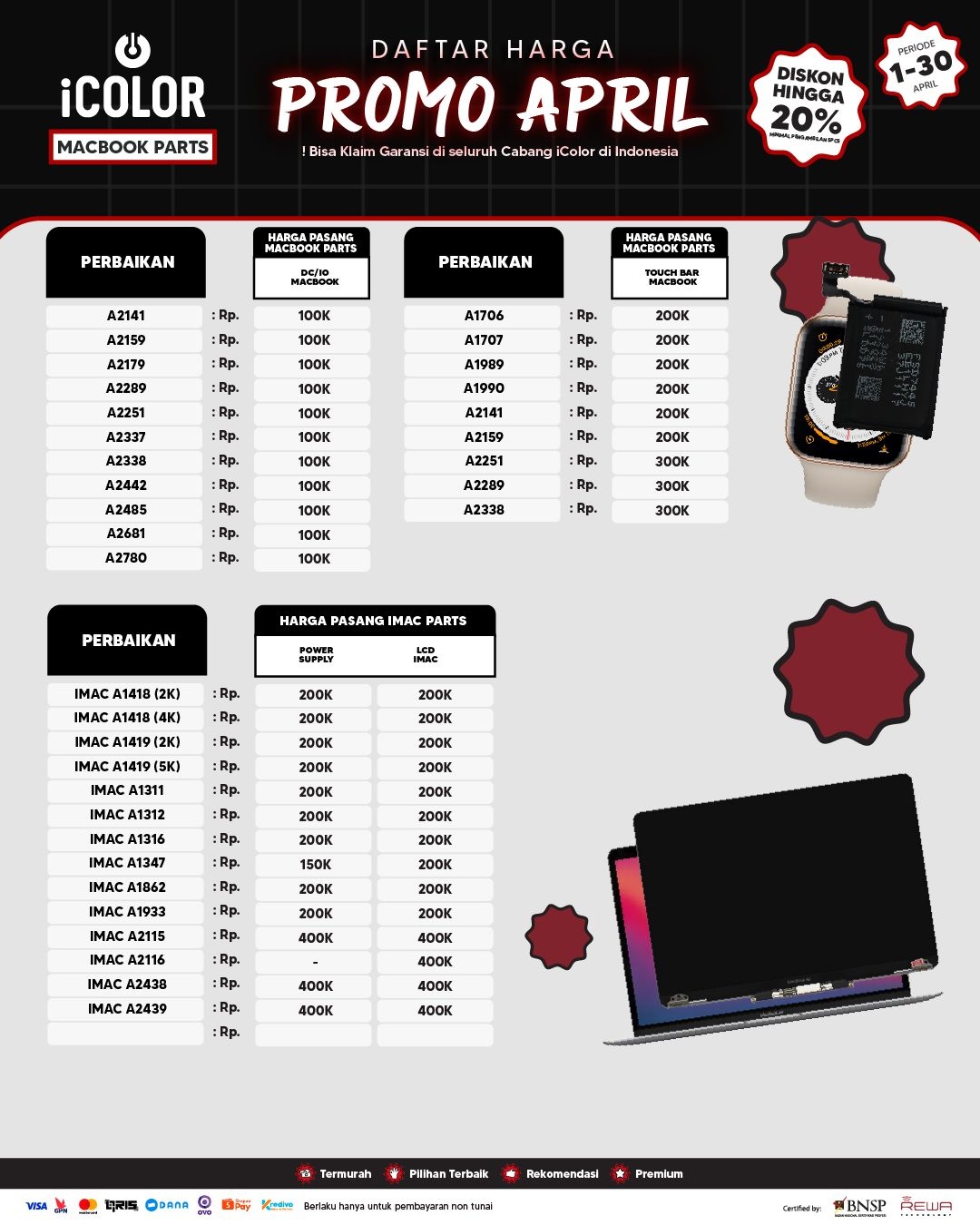 Kami menjanjikan harga yang ditawarkan dapat bersaing dan tetap mengutamakan kualitas dari sparepart yang kami sediakan, iColor memberikan harga service yang murah dan terjangkau untuk mencakup seluruh kalangan pengguna apple devices.