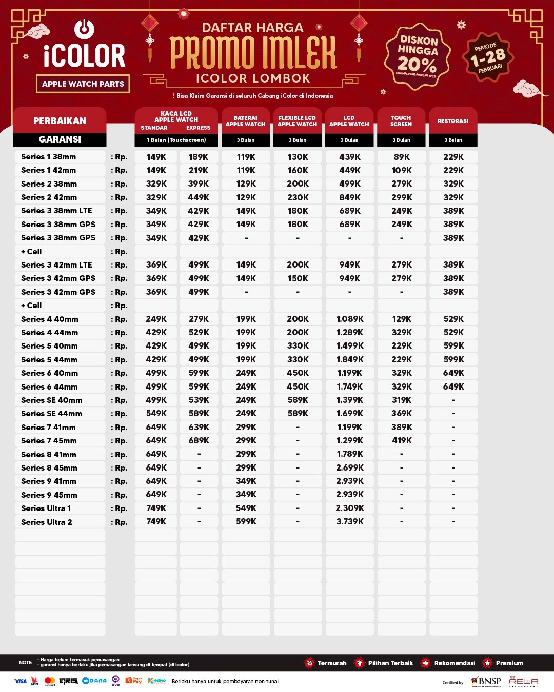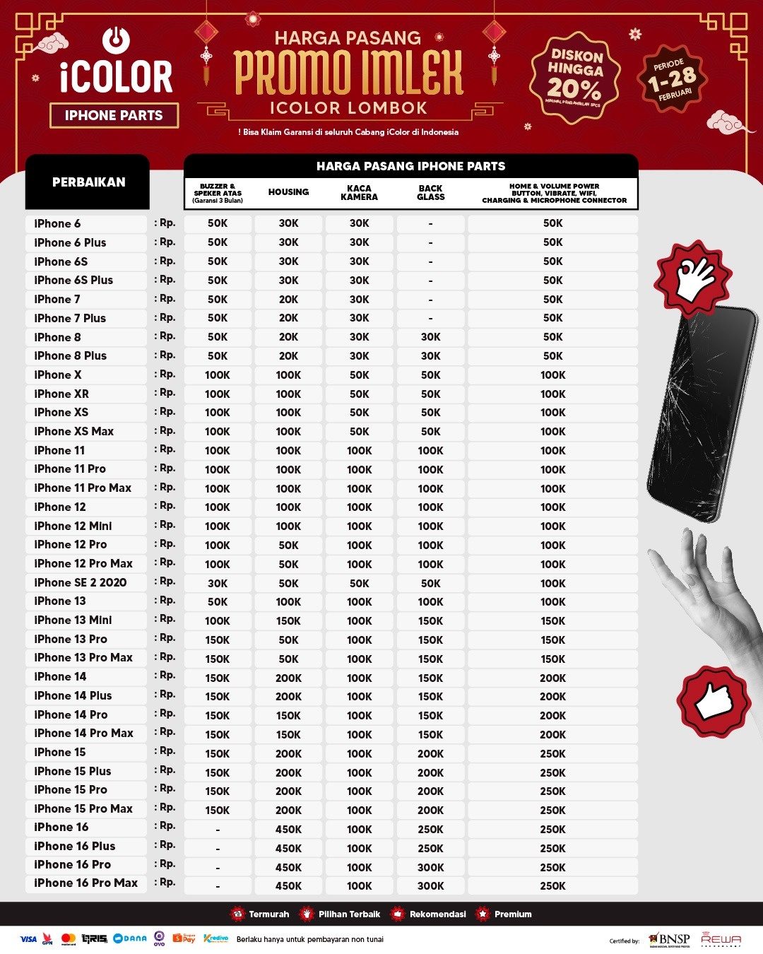 Kami menjanjikan harga yang ditawarkan dapat bersaing dan tetap mengutamakan kualitas dari sparepart yang kami sediakan, iColor memberikan harga service yang murah dan terjangkau untuk mencakup seluruh kalangan pengguna apple devices.