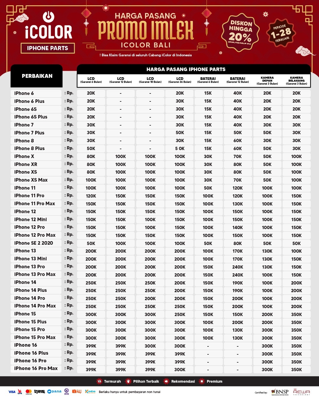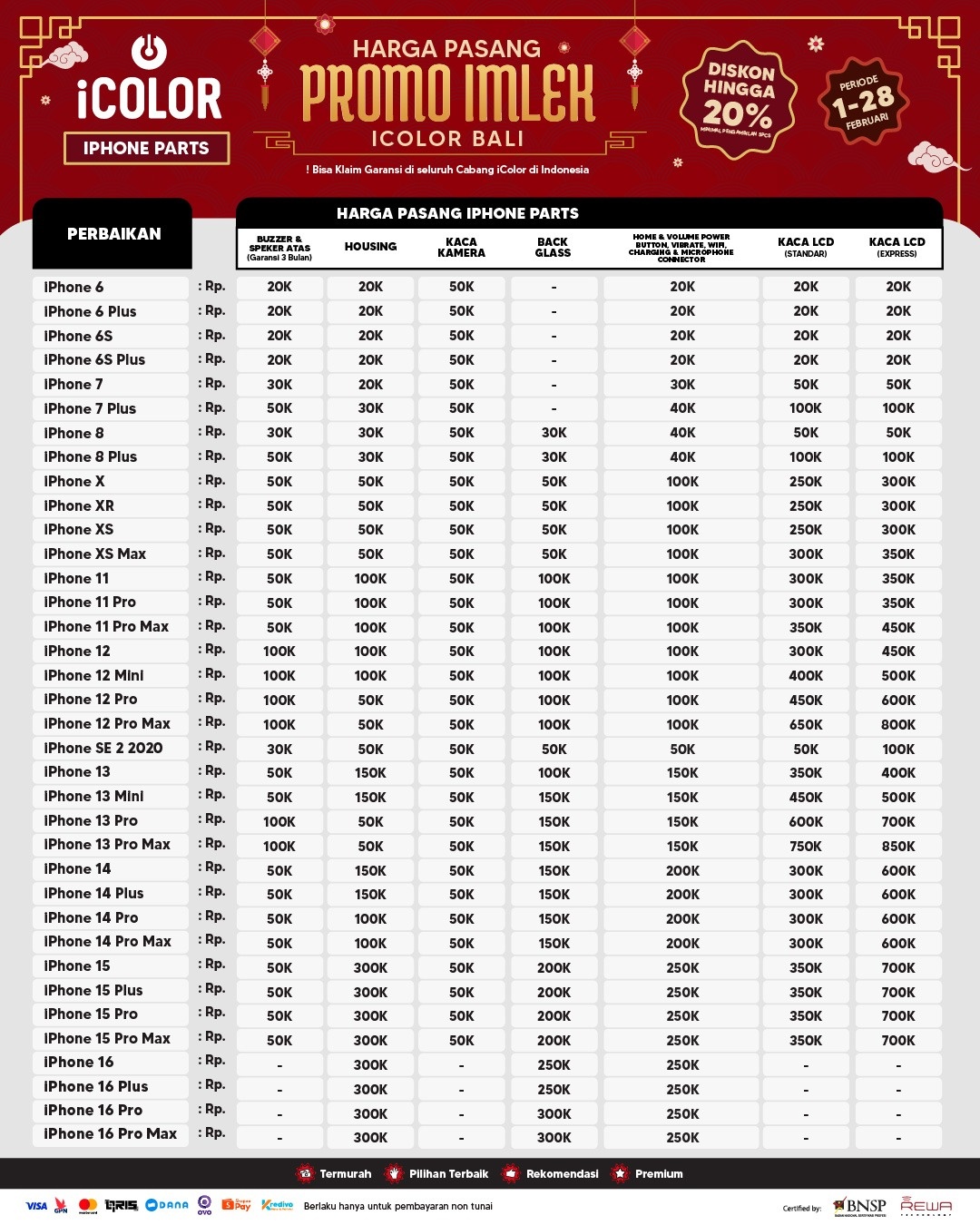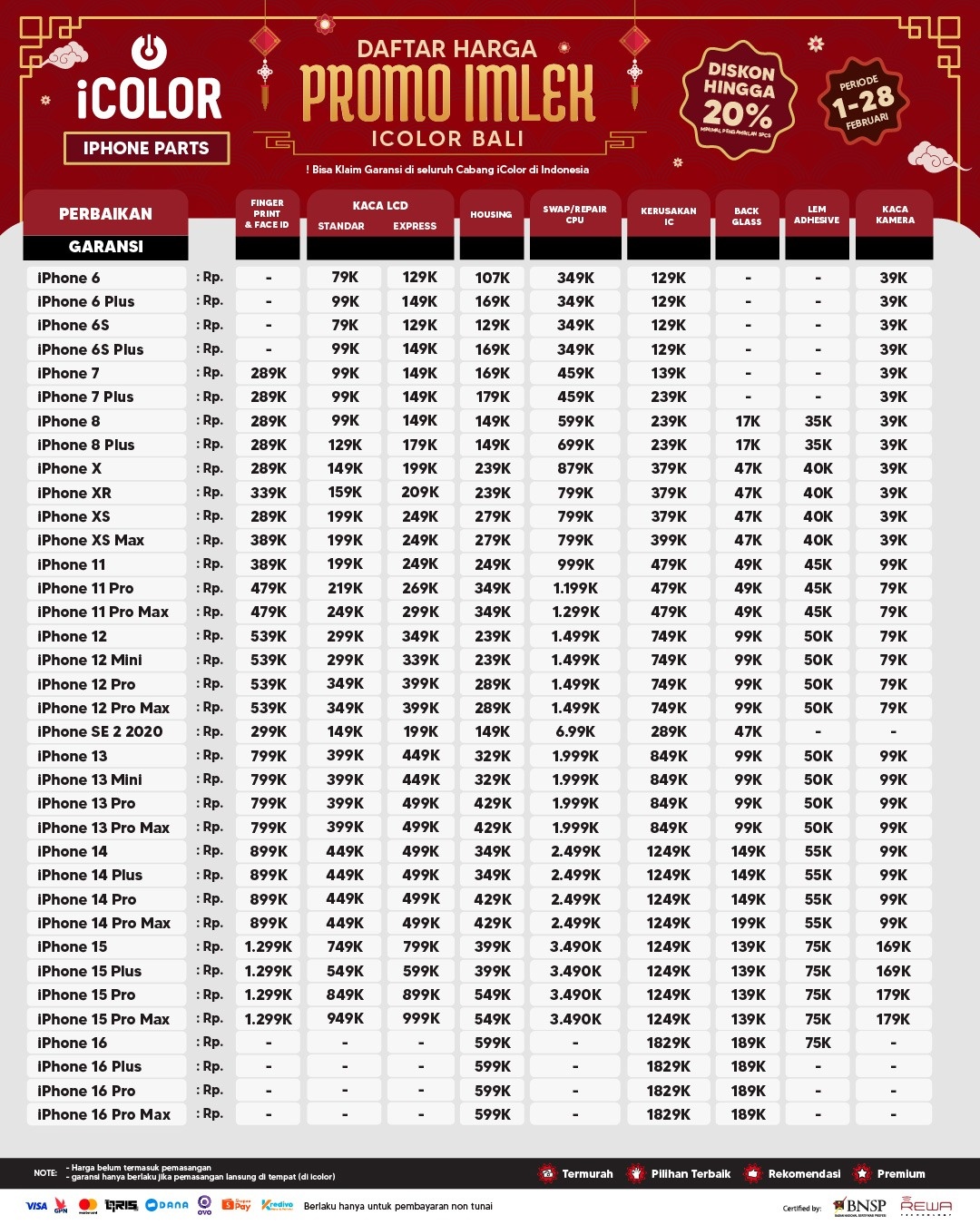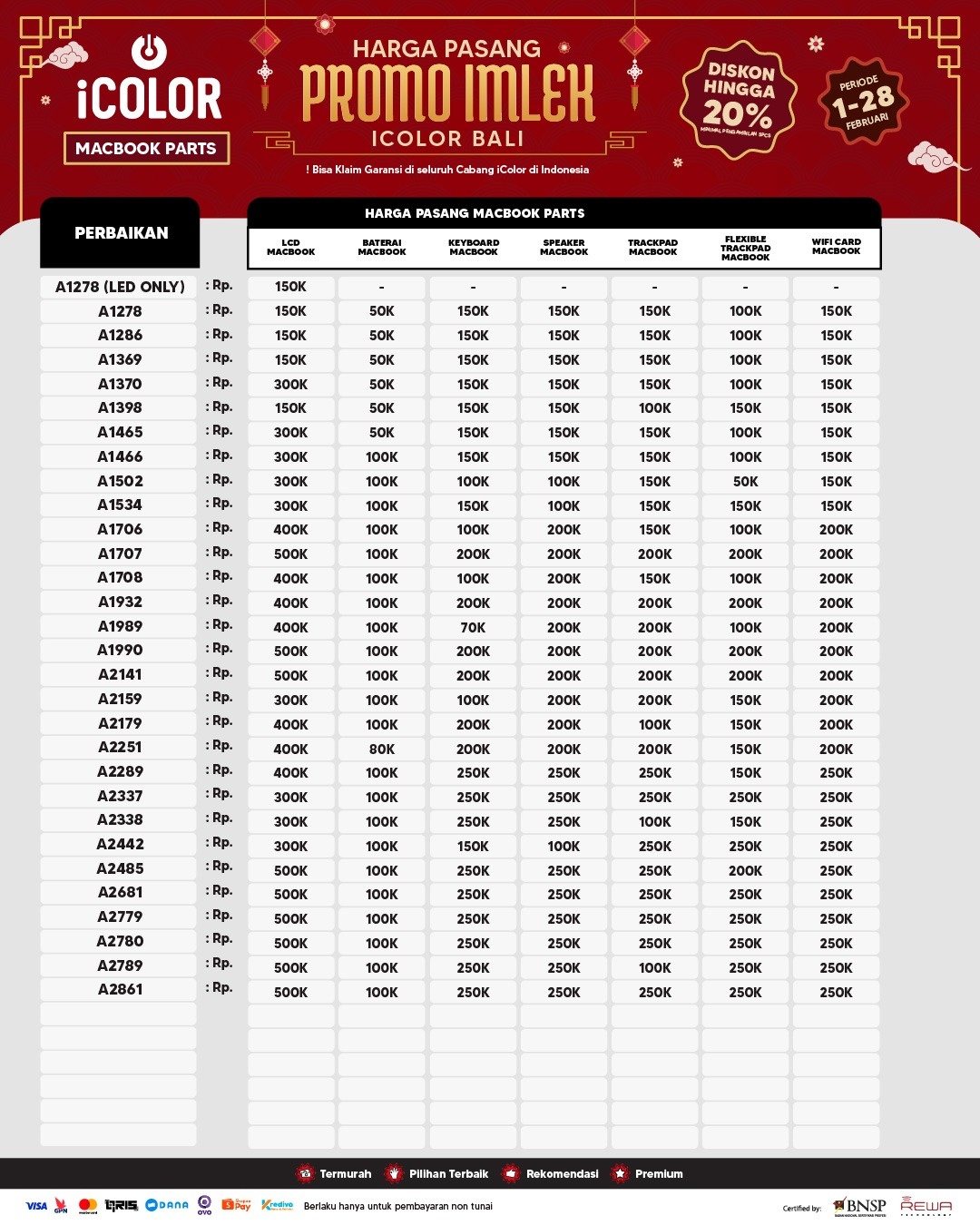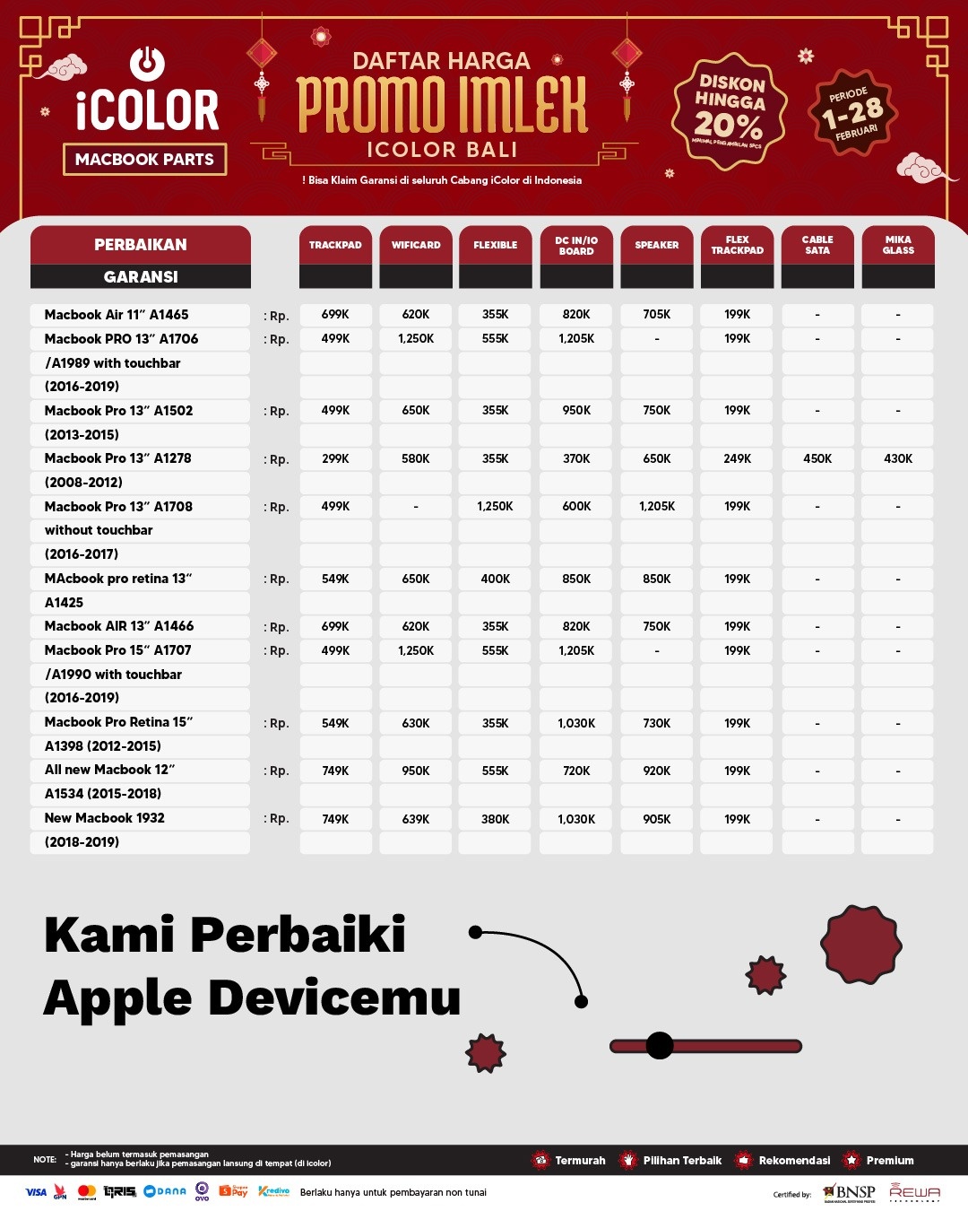 Kami menjanjikan harga yang ditawarkan dapat bersaing dan tetap mengutamakan kualitas dari sparepart yang kami sediakan, iColor memberikan harga service yang murah dan terjangkau untuk mencakup seluruh kalangan pengguna apple devices.