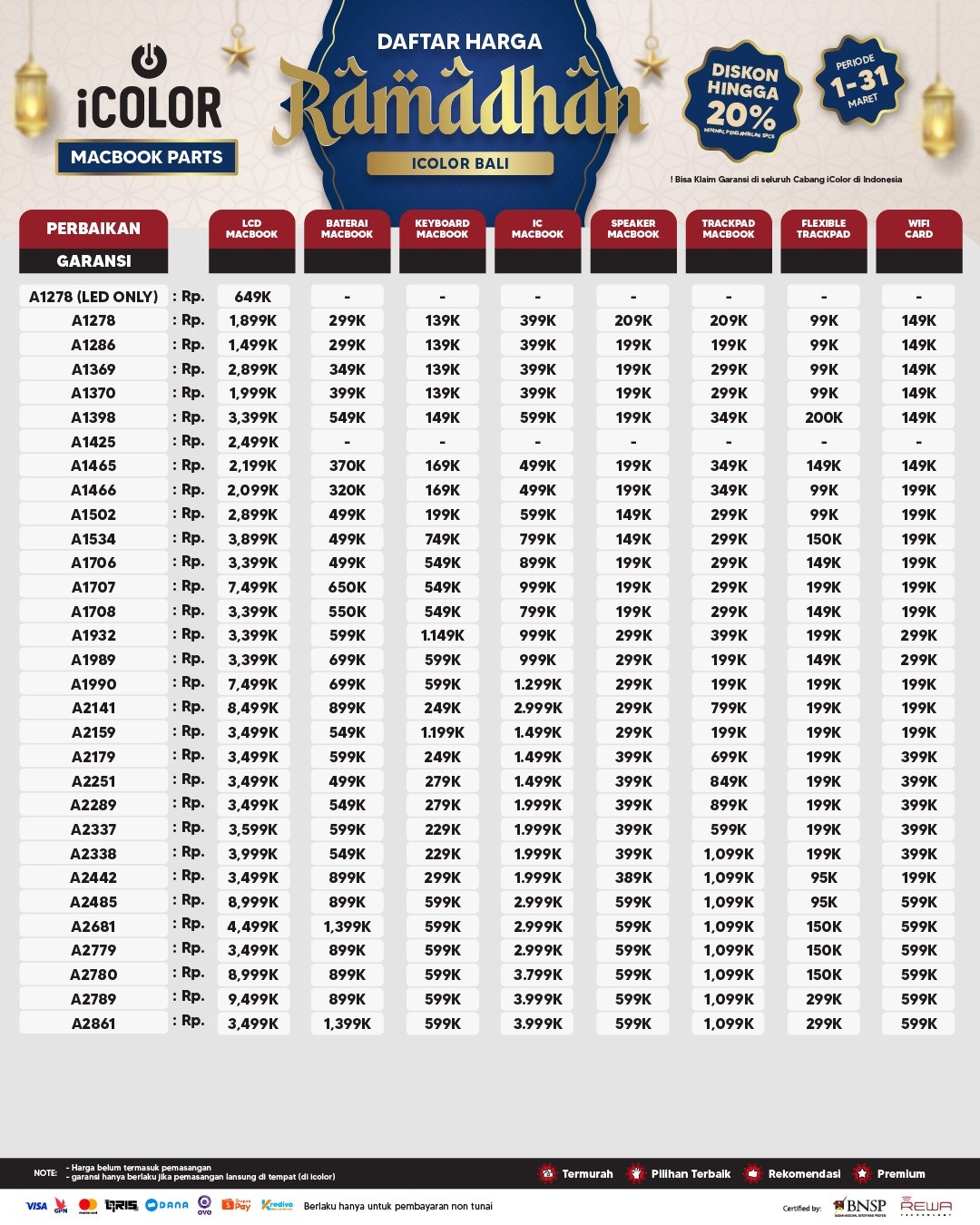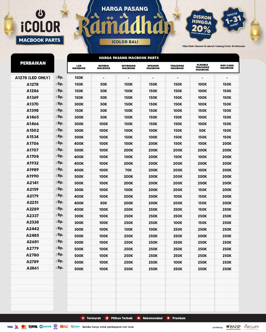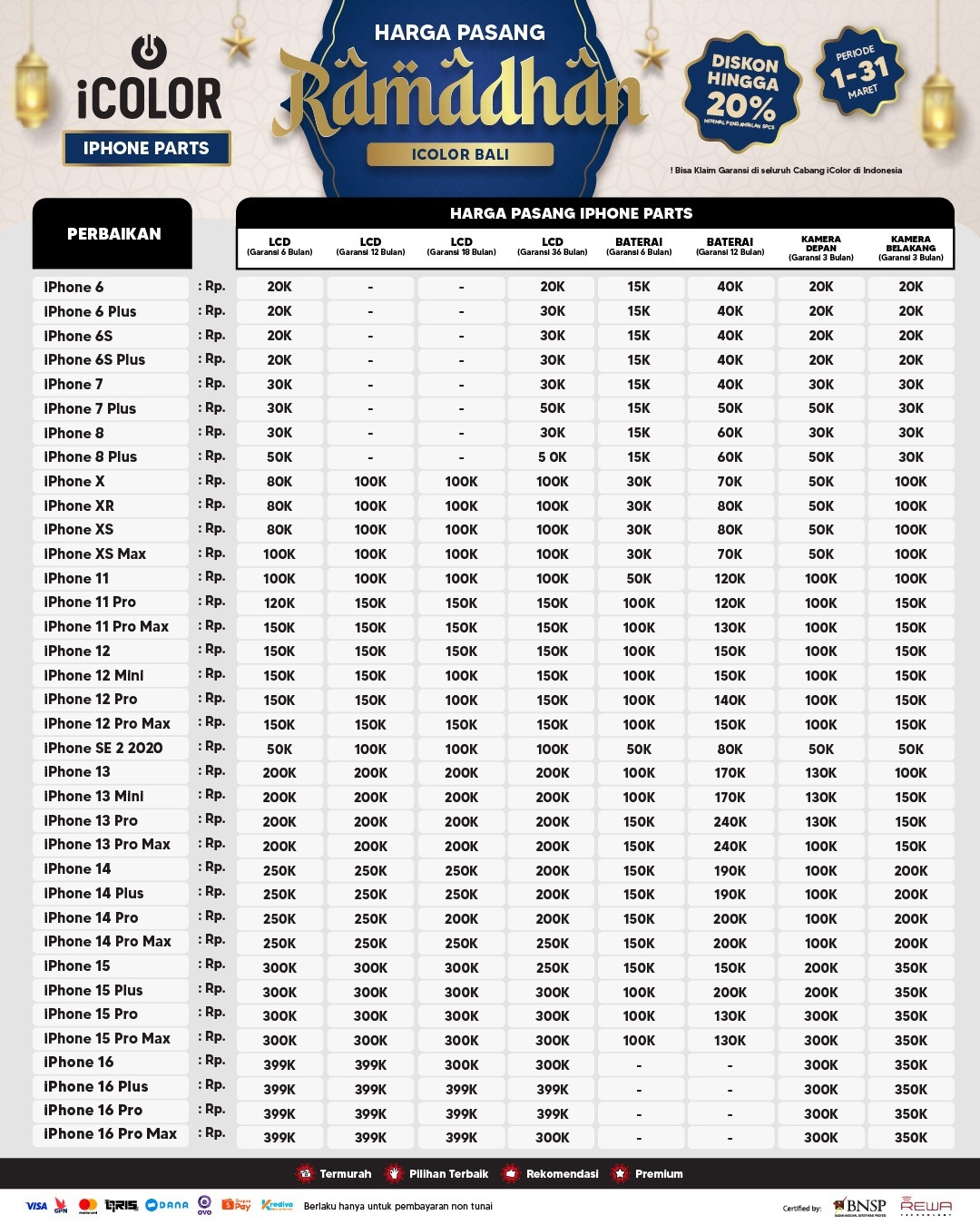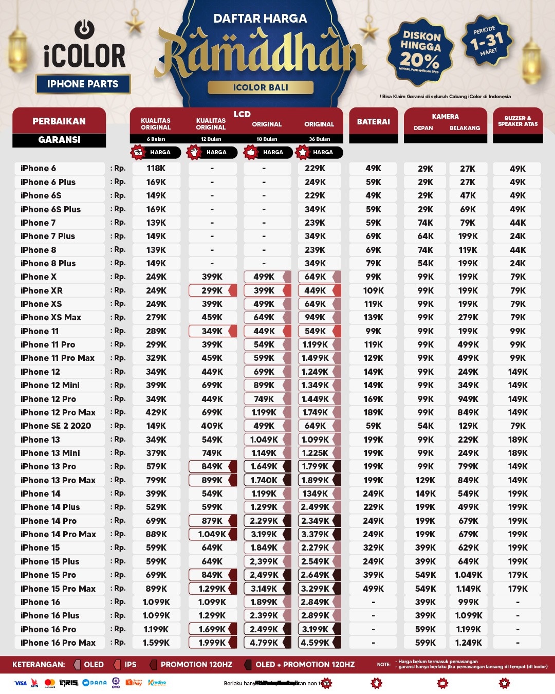 Kami menjanjikan harga yang ditawarkan dapat bersaing dan tetap mengutamakan kualitas dari sparepart yang kami sediakan, iColor memberikan harga service yang murah dan terjangkau untuk mencakup seluruh kalangan pengguna apple devices.
