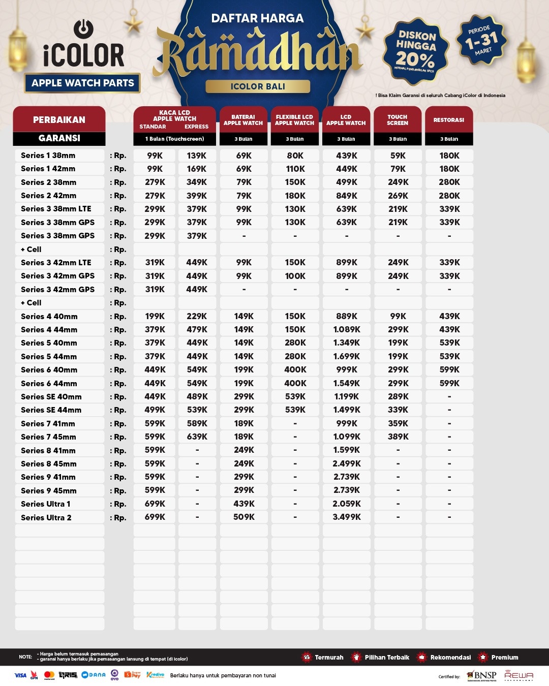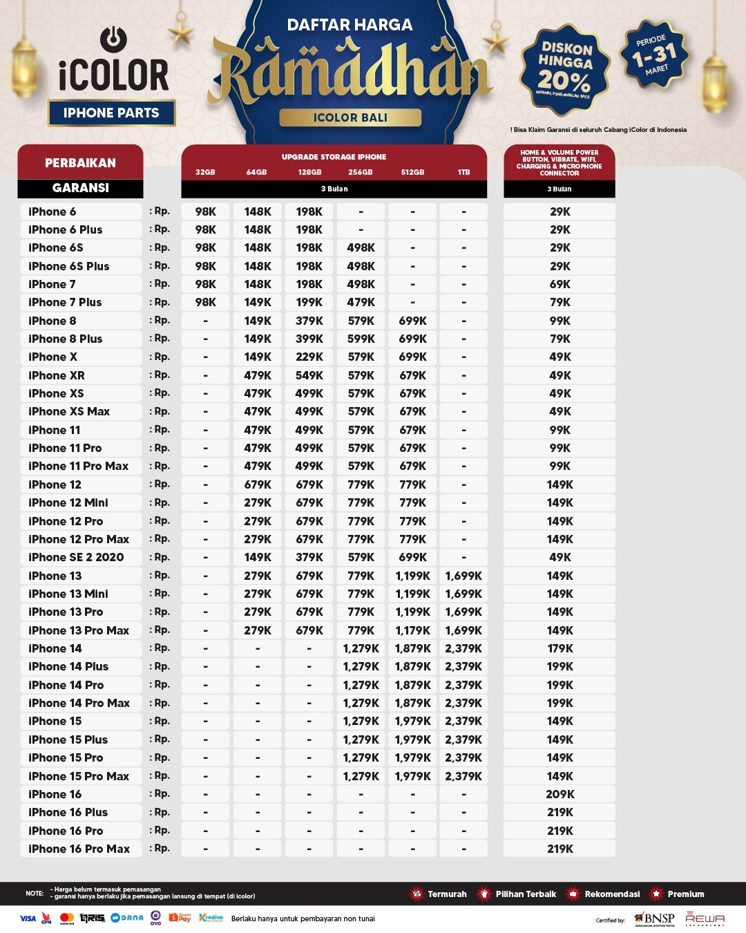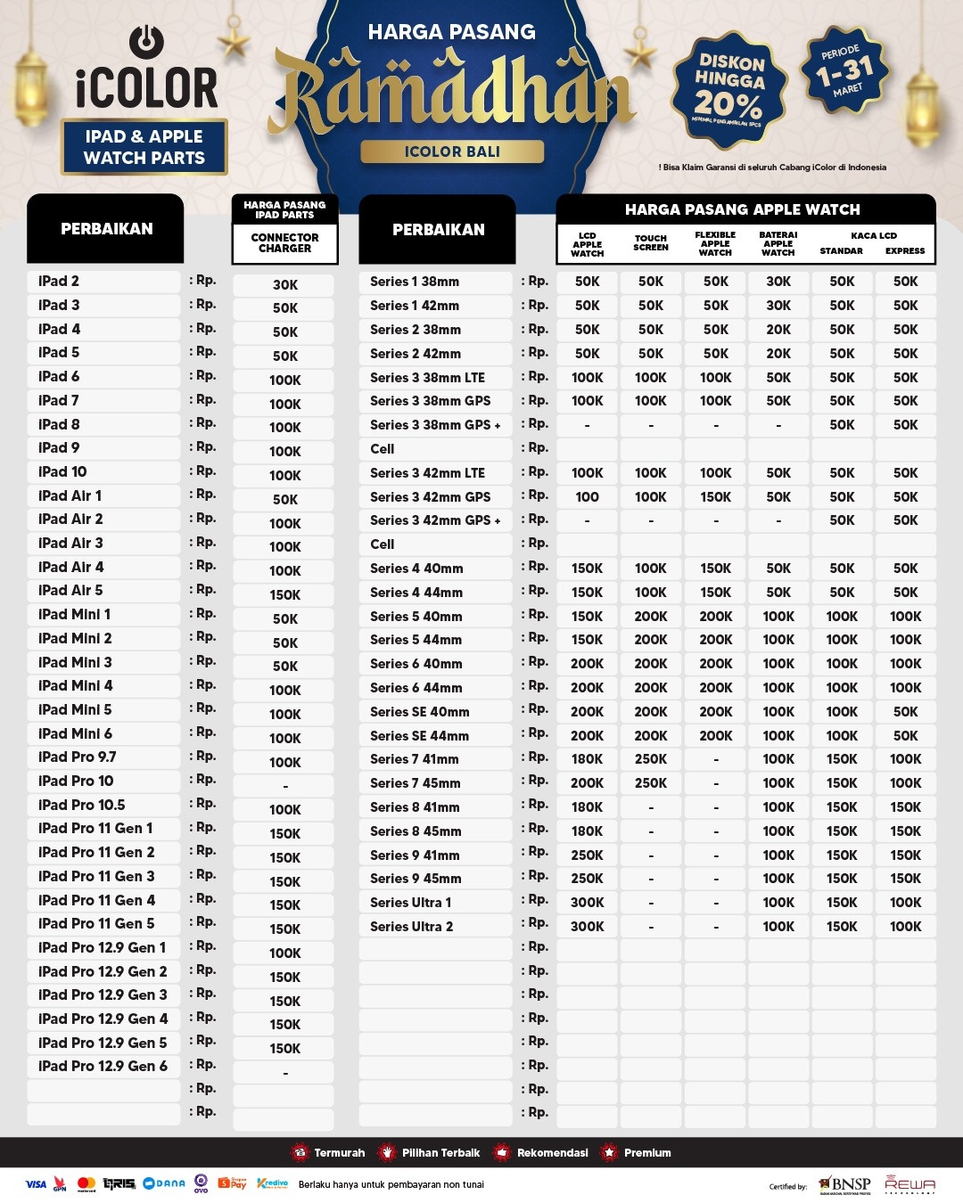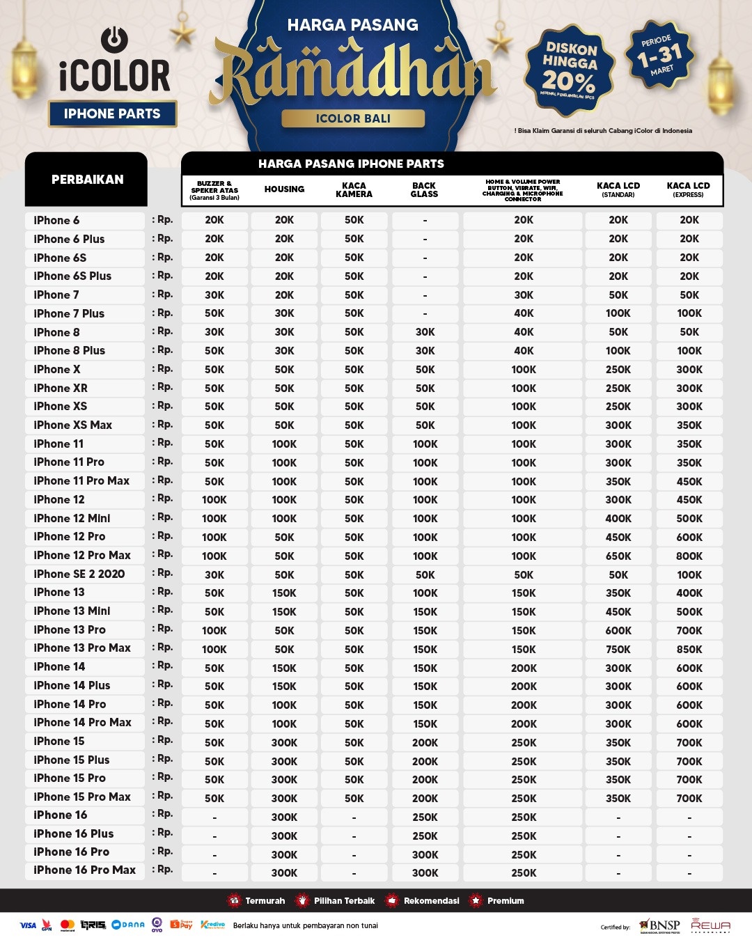 Kami menjanjikan harga yang ditawarkan dapat bersaing dan tetap mengutamakan kualitas dari sparepart yang kami sediakan, iColor memberikan harga service yang murah dan terjangkau untuk mencakup seluruh kalangan pengguna apple devices.